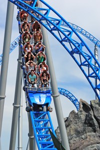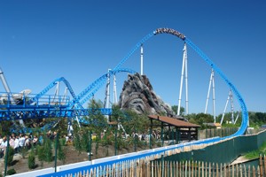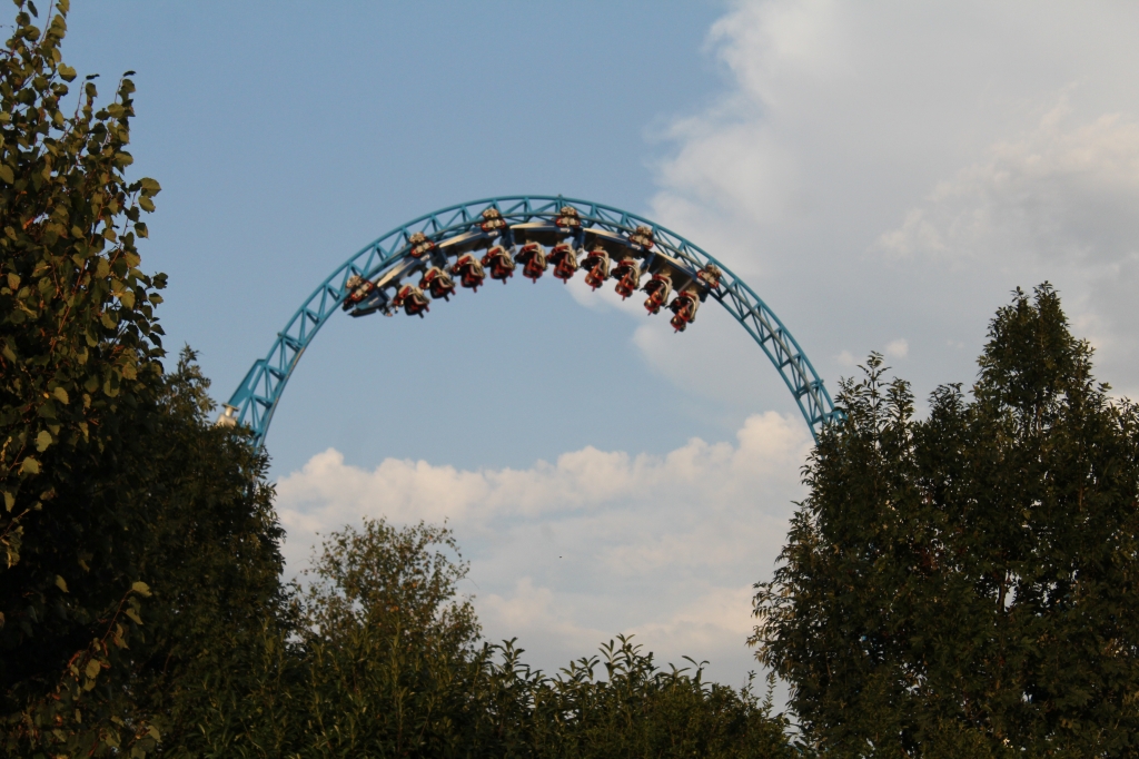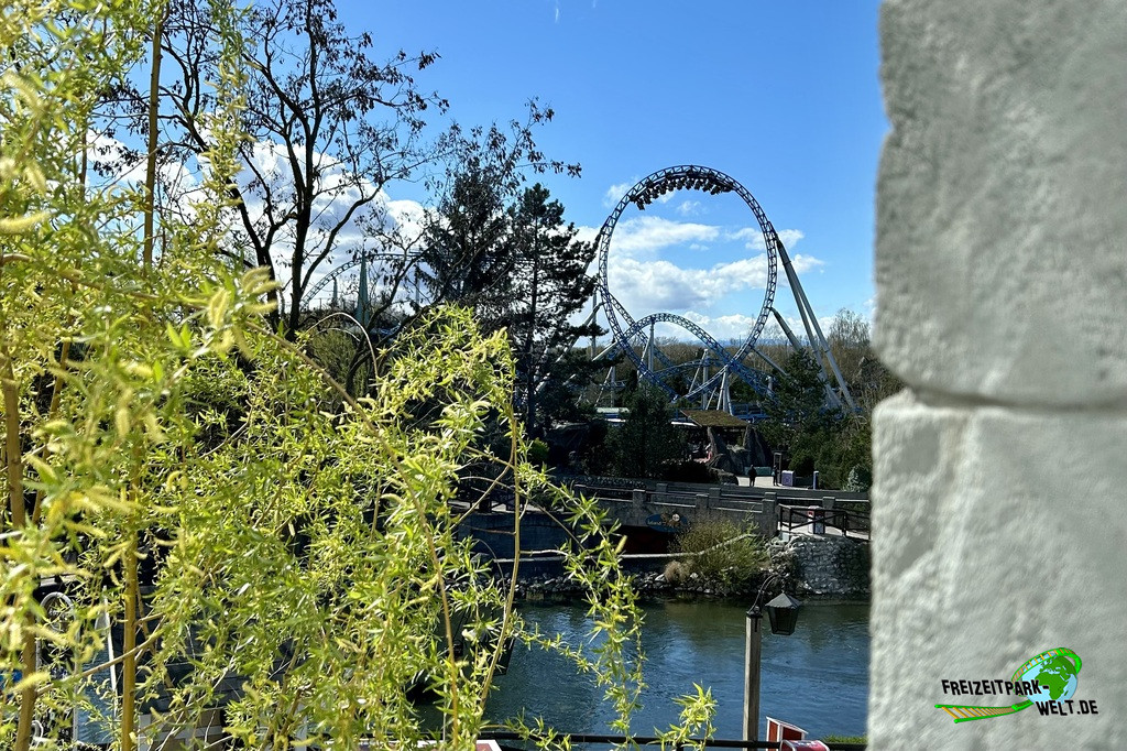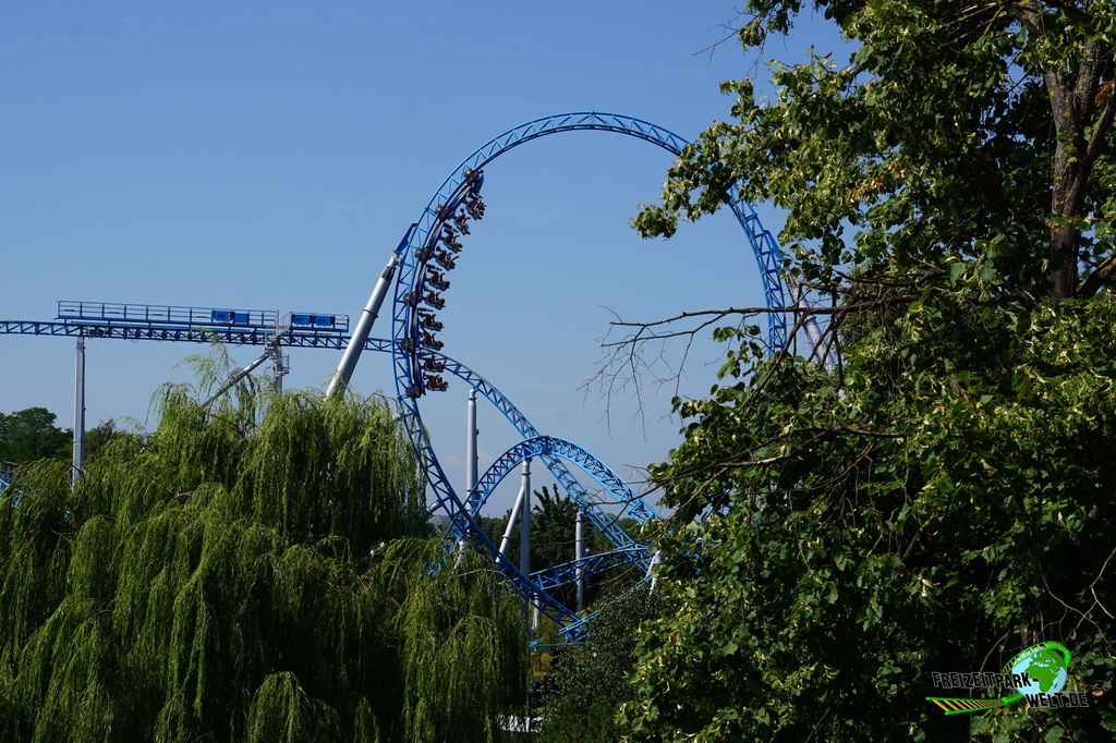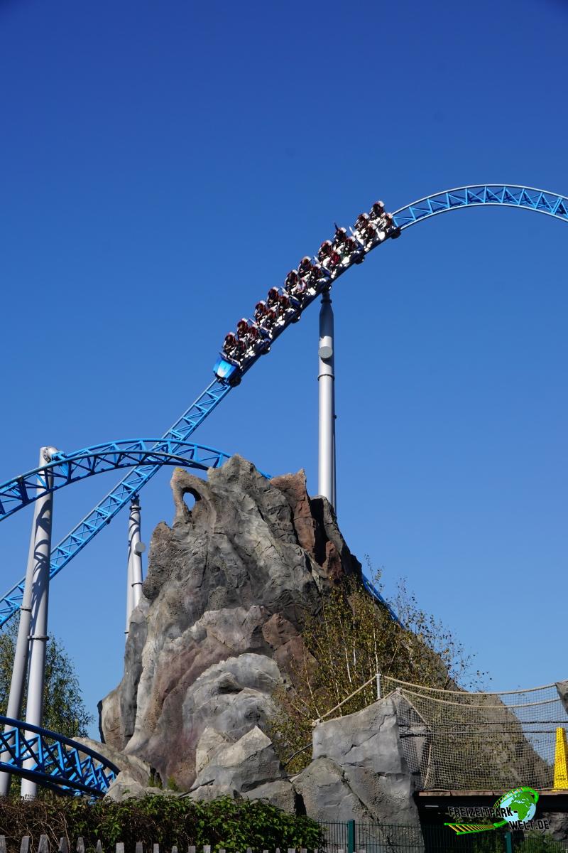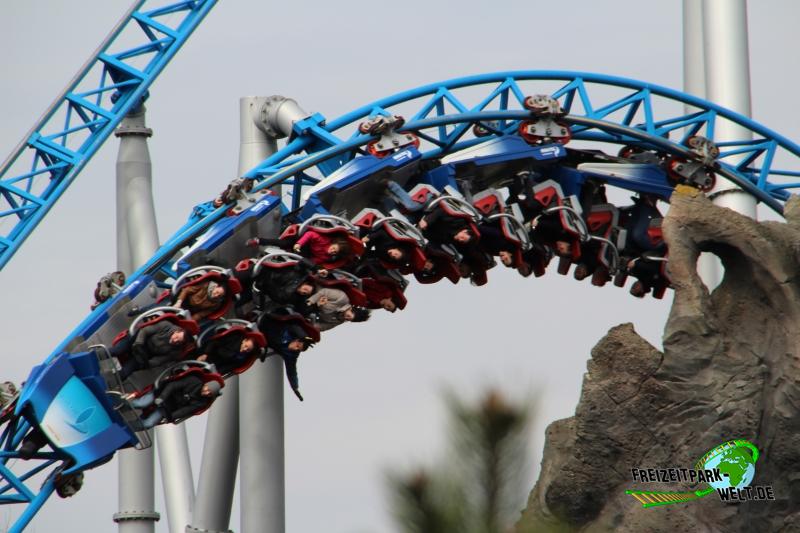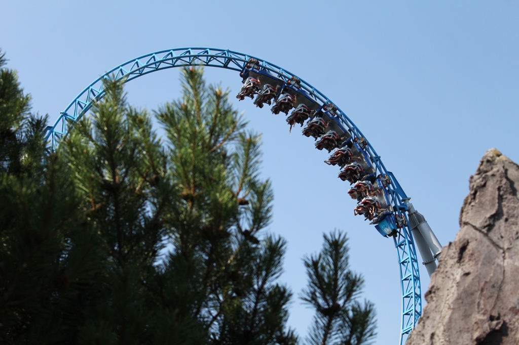Mit 32m Höhe ist er einer der größten in Europa und einer der ganz wenigen, in denen man mit ausgestreckten Armen die volle Freiheit genießen kann. Der Zug gleitet auch hier sehr sanft durch die Auf und Abfahrten und ist am Scheitelpunkt wiederum relativ langsam. Dies sollte aber kein Kritikpunkt sein. Vielmehr wird dadurch der Looping besser wahrnehmbar als bei den üblichen Loopings in Klothoidenform. Doch zurück auf den marinefarbenen Kurs. Aus dem Looping rast der Zug auf eine kleine, aber deutlich überhöhte Kurve - ein Highlight von Blue Fire! Es folgt die einzige Blockbremse aus der der Zug ebenso schnell wieder in Richtung Felsmassiv unterwegs ist. Direkt hindurch geht es diesmal und es folgt die erste Korkenzieher-Inversion, der den Zug einmal nach links wirft. Eine langgezogene Kurve durch den Felsencanyon und der nächste Korkenzieher - diesmal nach rechts - folgen auf unserem Weg durch die über 1 Kilometer lange Strecke. Genau einmal kann man leichte Airtime spüren, wenn der Zug mitten durch den Looping in einer von MACK Rides "Hump" genannten Fahrfigur befindet. Eigentlich nichts anderes als einer der bekannten Hügel mit Umschwung, die Intamin bereits in vielen seiner Anlagen integriert hat. Auf der anderen Seite des Loopings folgt nun eine lange Linkskurve, die direkt in die Heartline Roll mündet und damit das Finale von Blue Fire einleitet. Diese hat es nämlich in sich und lässt die Fahrgäste die bequemen Beckenbügel spüren. Entgegen den üblichen Heartline Rolls wird man hier regelrecht aus dem Wagen herausgeschleudert, wenn dort die Bügel nicht wären. Nach einer weiteren Rechtskurve ist dann Schluss und der Zug wird sicher von den Magnetbremsen eingefangen.