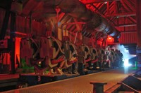 Der Eingang zum Vergnügen befindet sich gleich am Anfang des isländischen Themenbereichs. Single Ride biegen relativ schnell in Richtung Station ab während es für die normale Standby-Queue zunächst in den blue fire Dome, der mit wechselnden Ausstellungen bespielt wird. Von hier aus geht es mitten durch die Achterbahnstruktur, vorbei an einigen Felsvorsprüngen, einer kleinen Höhle und zahlreichen Hütten, die nicht nur für viel Abwechslung, sondern vor allem Sonnenschutz sorgen. Apropos Felsen: Die massiven Felsformationen aus Spritzbeton wurden von den Spezialisten des "Atelier Artistique du Beton" ausgeführt und sind kaum von echten Felsen zu unterscheiden. Auch sonst passiert in der Queue viel, denn fast jede Minute wird vor den wartenden Gästen ein Zug abgeschossen, was die Zeit wie im Fluge vergehen lässt - zu Sehen gibt es hier fast immer etwas! Um die Wartezeit übrigens möglichst kurz zu halten, kann Blue Fire mit maximal 5 Zügen á 20 Personen betrieben werden. In der Praxis kommen meistens 3-4 Züge zum Einsatz, was bei normalen Besucherandrang vollkommen ausreichend ist. Kurz vor Erreichen der Station teilt sich die Queue in eine Warteschlange für Reihe 1 sowie Reihe 2-10, später nochmals in eine Single Rider Line. Um jede Queue gerecht und ohne Konfliktpotential auf die einzelnen Reihen zu verteilen wird erstmals im Europa-Park die Reihe von einem Mitarbeiter zugewiesen. Somit bleibt in der Station alles übersichtlich und bequem.