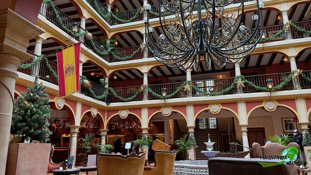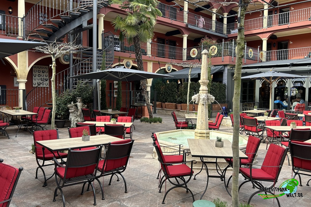 Daneben gibt es hier vor allem in der Sommersaison auch abends Unterhaltung in Form einer Kinderdisco und kleineren Shows von Musikern, die entweder im Innenhof oder direkt im nebenan liegenden Themenbereich Spanien stattfinden. Dazu kommt, dass auch die Preise etwas günstiger sind als bei den neueren Hotels.