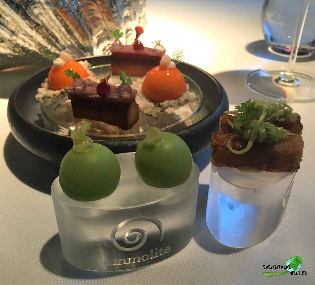 Eine Besonderheit im Hotel Bell Rock ist das getrennte Frühstück für alle Leuchtturm-Suiten im Hotel. Besucher dieser Suiten dürfen morgens im Ammolite-Restaurant im Erdgeschoss des Leuchturms frühstücken und genießen damit eine ruhige und exklusive Atmosphäre. Doch auch abends kann im 2-Sterne Restaurant "Ammolite" hervorragend und hochpreisig gegessen werden. Das sehr elegant und modern eingerichtete Restaurant bietet dabei nur ca. 10 Tische an. Die meisten Tische sind durch schlichte, aber elegante, leicht durchsichtige Vorhänge voneinander getrennt und bieten damit zusätzliche Privatsphäre. Angeboten werden verschiedene Menüs der gehobenen Kategorie. Mehr Informationen über einen Besuch im Ammolite haben wir in diesem Artikel zusammengefasst.