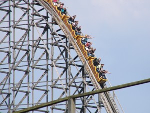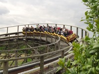 Wie fährt sich Colossos nun? In der Station fällt zunächst einmal positiv auf, dass Gedränge vor den Wartegattern durch ein davor installiertes Drehkreuz verhindert wird. Dieses lässt jeweils nur so viele Personen durch das Tor, wie auch ein Zug von Colossos an Fahrer aufnehmen kann. Ist man einmal eingestiegen überwindet man den 52m hohen Lift recht schnell und fährt auf den ersten 61° steilen Drop zu. Da die Strecke schon leicht abwärts führt, wird man regelrecht in den Drop hineingezogen und schießt fast 60m in die Tiefe, wo man gleich wieder in Richtung Camelback nach oben gedreht wird. Übrigens treten in der Senke zwischen den Camelbacks die größten Beschleunigungskräfte auf, hier ist es kaum noch möglich die Hand nach oben zu bewegen. Blick auf den imposanten Holzberg. Auf den zweiten Camelback folgt dann ein sehr interessanter Richtungswechsel, der am höchsten Punkt erfolgt und den Zug parallel zum bisherigen Fahrverlauf fahren lässt. Ein kleiner Hügel mit etwas Floater-Airtime und man erreicht die Blockbremse, die eine 450 °-Helix einleitet. Es schließen sich noch drei Bunny Hops an in denen auch das Onride-Foto gemacht wird und der Zug wird nach der letzten Kurve sanft abgrebremst.