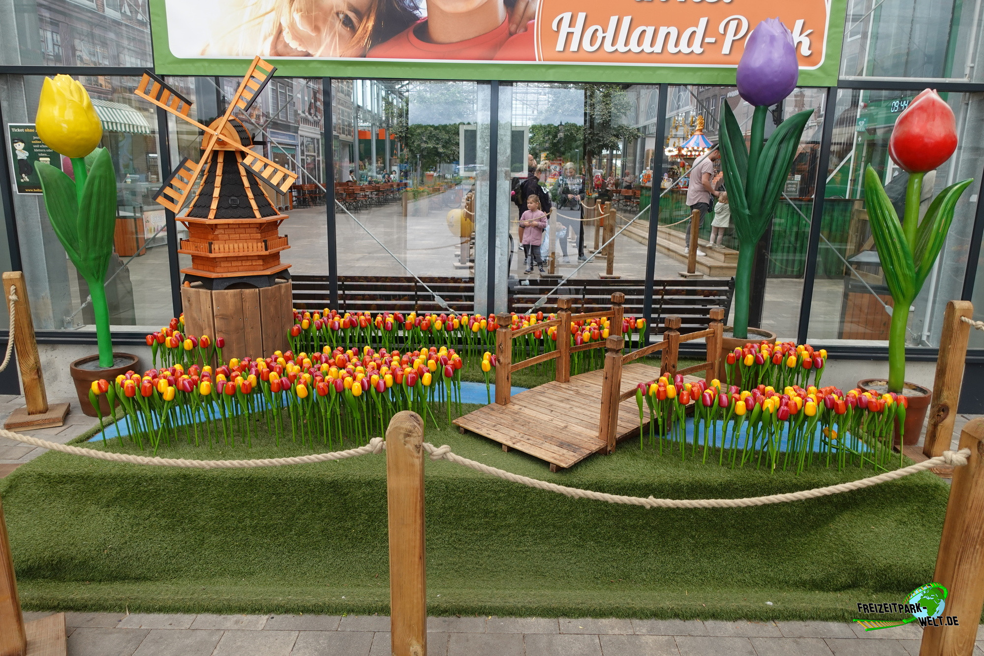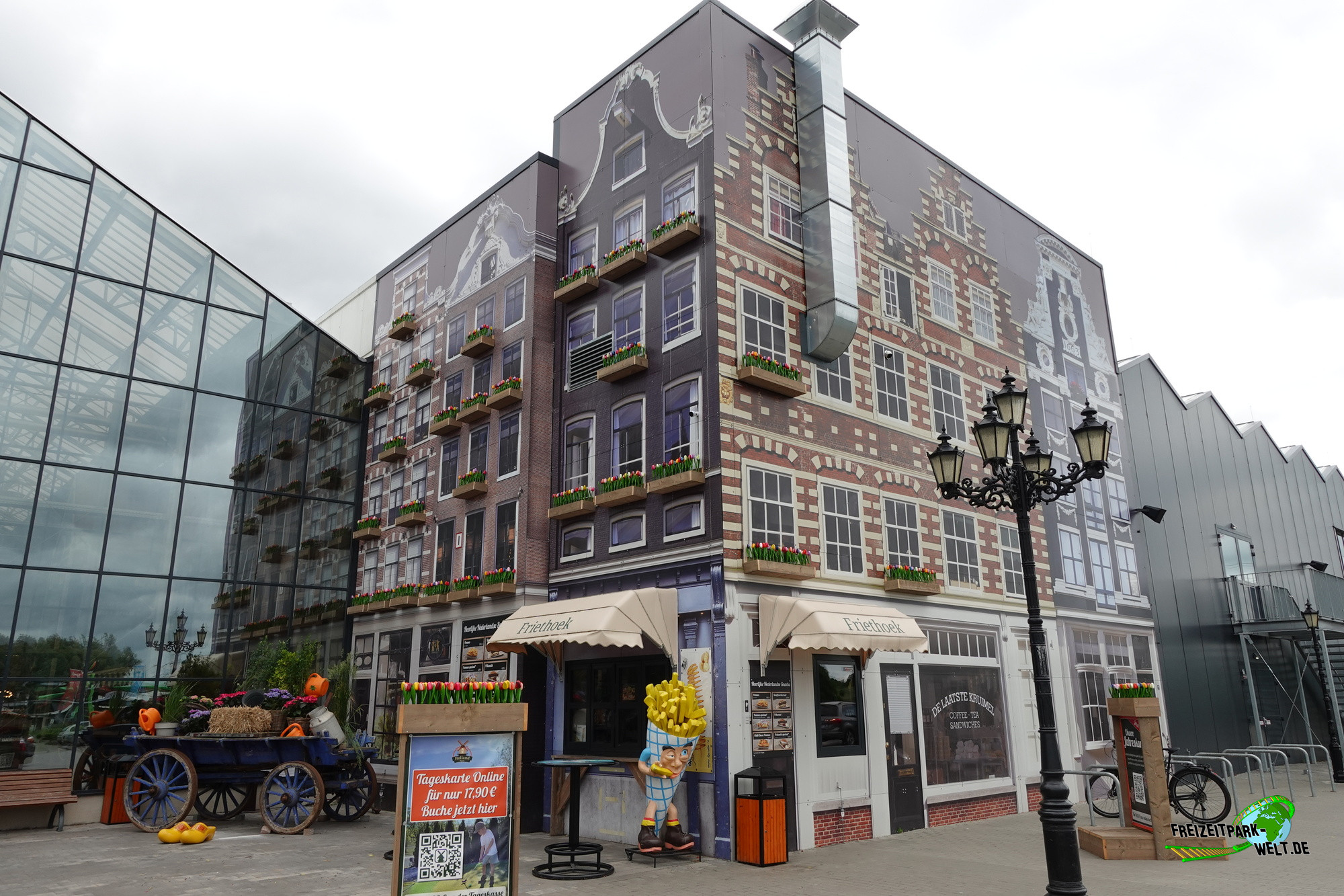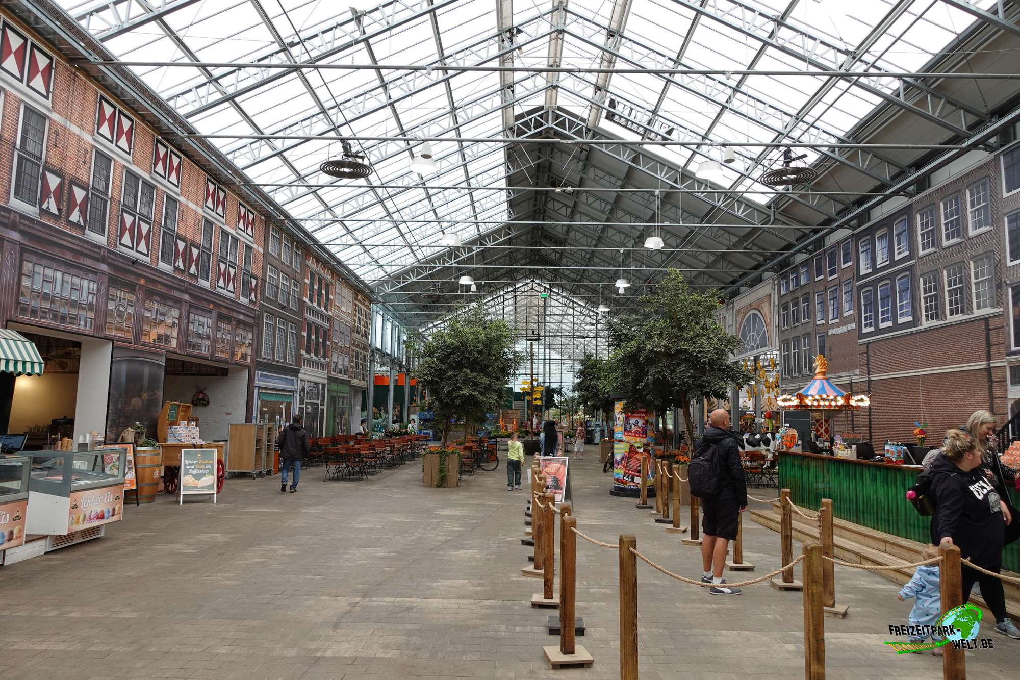 Schon die Fassade des Freizeitparks bei Berlin lässt die Besucher von einem Abstecher nach Holland träumen: die abgebildeten bunt aneinander gereihten mehrstöckigen Häuser erinnern stark an Amsterdam. Der Eindruck, dem deutschen Nachbarland einen Besuch abzustatten, verfliegt auch beim Betreten der opulenten Eingangshalle nicht. Überall sind typisch niederländische Dekorationen zu sehen, in der Markthalle gibt es holländische Produkte.