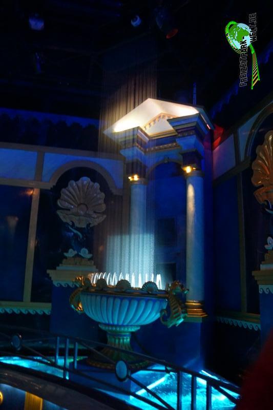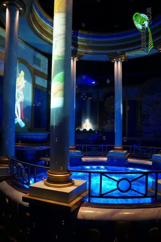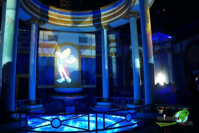 Schließlich rettet man sich in eine kleine Galeere, die zunächst noch ruhig im Hafen liegt. Dies ist die eigentliche Attraktion, ein ganz "normales" Mad House. Ganz normal? Nicht wirklich, denn auch hier hat man sich aus einer ganz anderen Perspektive an die Attraktion gewagt. Während es normalerweise nur Schauobjekte in der Mitte der Hexenschaukel gibt, wird hier die Geschichte weitererzählt und das auf je 5 Screens pro Seite, die als kleine Fenster die Sicht nach draußen ermöglichen. Man sieht hier also den Hafen und einige Möwen vorbei ziehen. Dann legt man ab und zusammen mit der Aussicht aus den Fenstern wird ein richtig echtes Gefühl erzeugt. Man glaubt wirklich sich auf hoher See zu befinden, denn die Bewegungen der Galeere sind besonders im ersten Teil großartig. Hier kommt Le Défi de César schon einem Simulator gleich. Dann kommen Asterix und Obelix und kippen das Schiff um. Man sieht die Unterwasserwelt und alles dreht sich. Später landet das Schiff doch wieder an Land und nach 20 Minuten kann jeder Besucher sein ganz eigenes Foto der Mission mitnehmen.