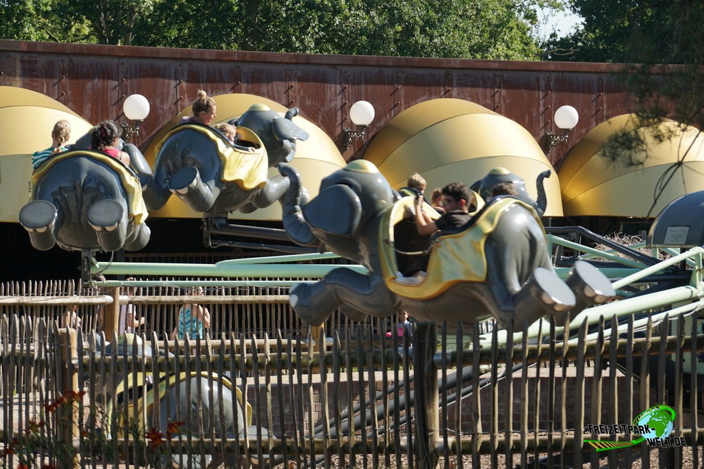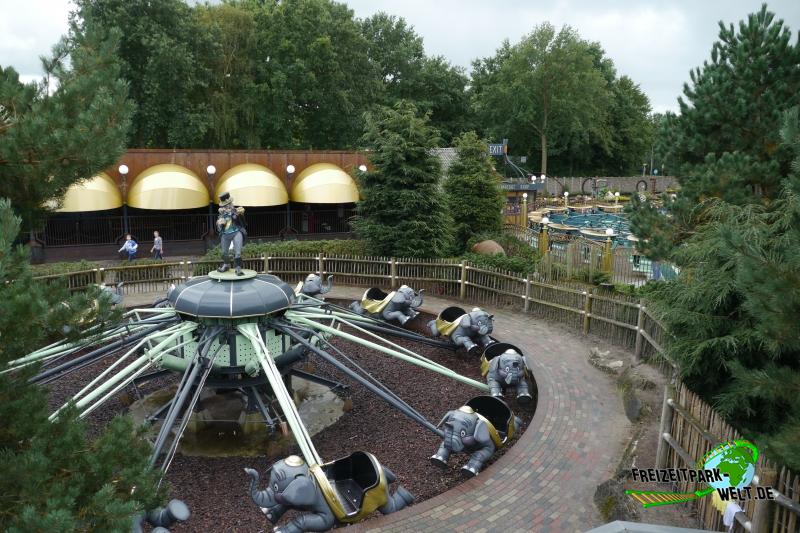 Für die kleinen Besucher gedacht ist Jumbo. Das klassische Kinderkarussell liegt im Jules Verne Adventureland. Hier fliegen die Kids auf dem Rücken von Elefanten über den Köpfen von Papa und Mama hinweg.