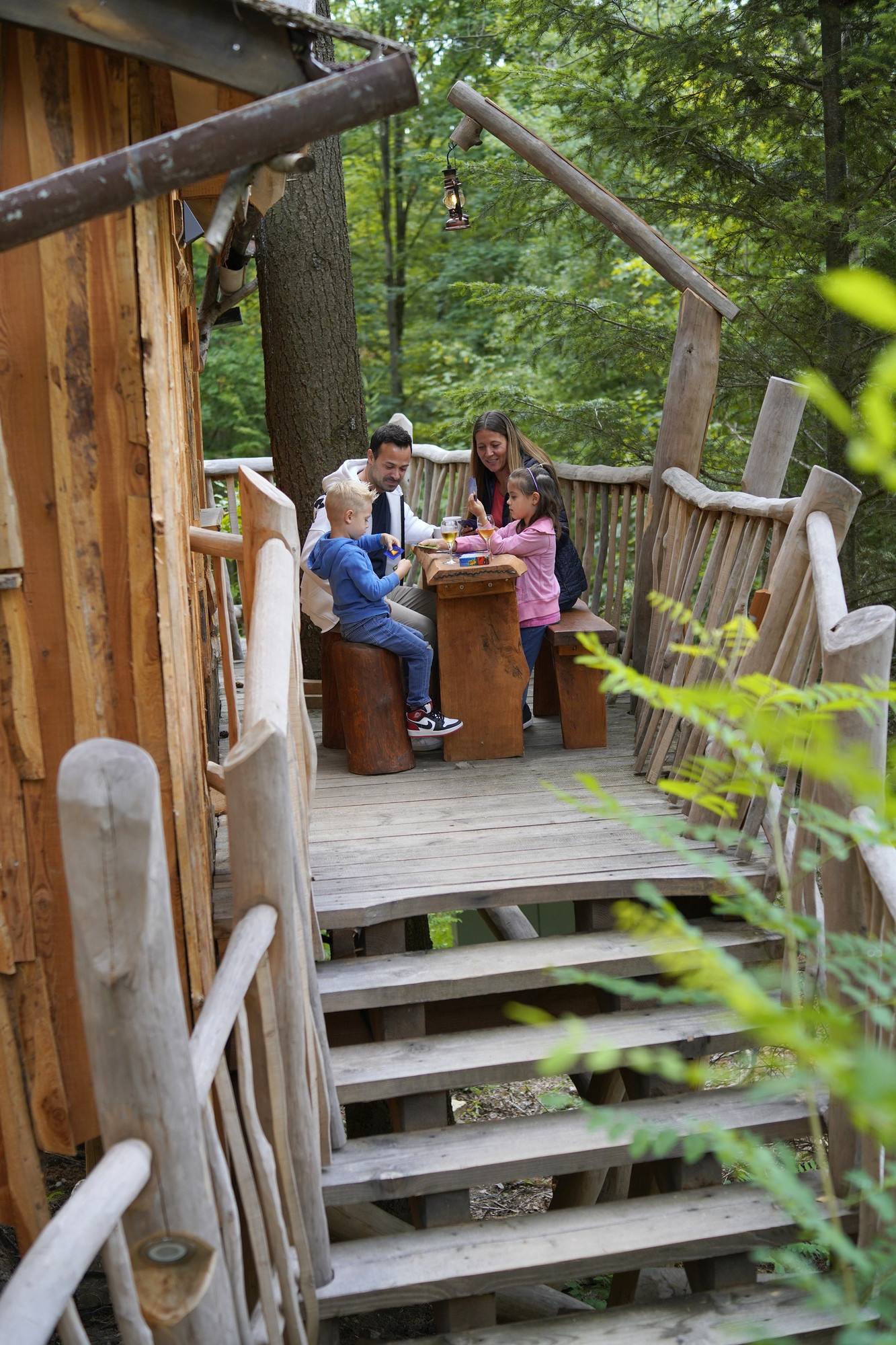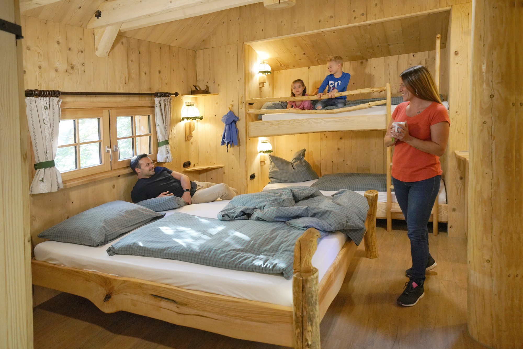 Jedes Baumhaus ist ein Unikat: Bei der Außengestaltung durften die Handwerker auch mal Wasserwaage und Zollstock beiseitelegen und kreativ werden. Für ein rustikales Äußere sorgen echte Erntegeräte und Werkzeuge aus früherer Zeit. Auf diese Art und Weise wird das im Erlebnispark Tripsdrill geltende Motto „Schwaben anno 1880“ auch im Natur-Resort weitergeführt. Sogar die Dächer der Baumhäuser sind zum großen Teil mit historischen Biberschwanzdachziegeln gedeckt, welche aus Abbruchhäusern „gerettet“ wurden. Für die ebenfalls individuell gestaltete Innendekoration wird nachhaltig produziertes Kirsch-, Apfel- und Birnenholz eingesetzt. Hinzu kommen originelle Details wie zum Beispiel eine Gießkanne als Duschkopf.