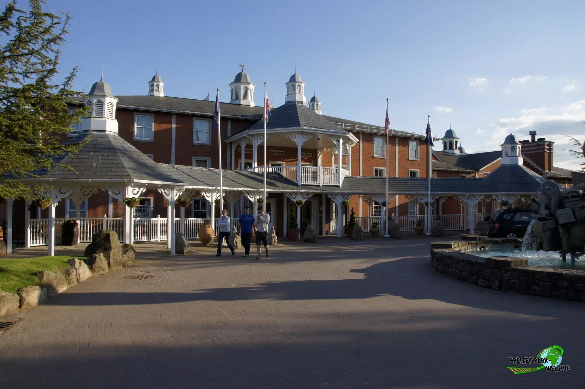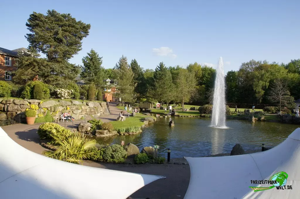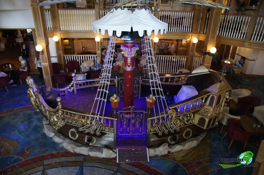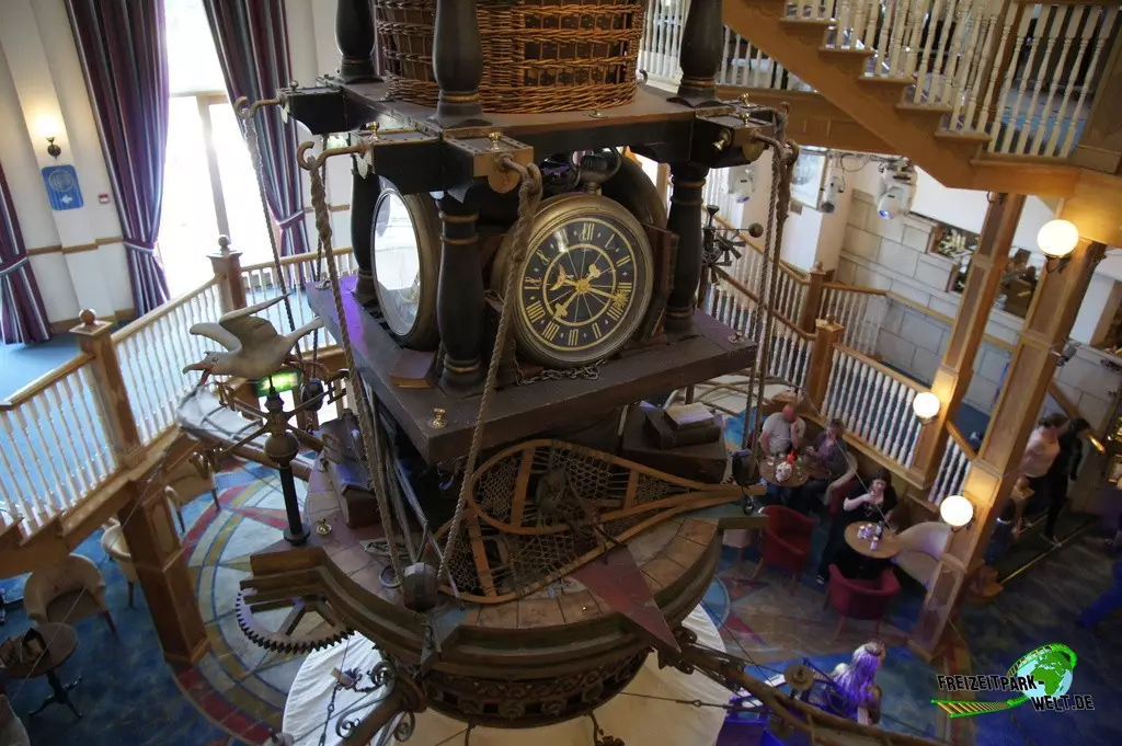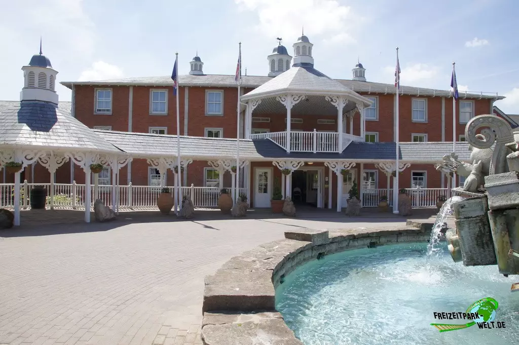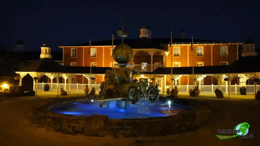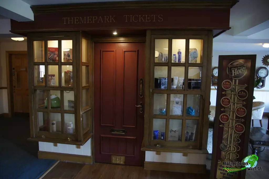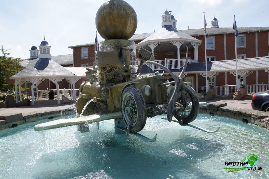 Thematisch ist das Alton Towers Hotel relativ klassisch gehalten und nicht so bunt wie die anderen beiden Hotels. Der Geschichte nach ist der Abenteurer Sir Algenon einst mit seinem Heißluftballon im Hotel gelandet und fand dieses so schön, dass er es zu seiner Heimat machte und zahlreiche Exponate seiner Expeditionen hier hinterließ. Dies wird gleich am Eingang deutlich, wo inmitten des großen Brunnens ein Oldtimer mit zahlreichen Koffern beladen einen ersten Eyecatcher bietet. In der Lobby des Hotels kann man dann auch den Heißluftballon entdecken, der hier ziemlich imposant in der Luft hängt. Interessant ist in der Lobby auch, dass man hier durch die Hanglage fast schon im höchsten Stockwerk ist und es in Richtung der Magical Gardens zwei Etagen ins Souterrain geht. Dadurch öffnet sich die Lobby aber nach hinten sehr schön und wirkt ziemlich groß. Die Einflüsse aus den verschiedensten Kulturen, die Sir Algenon bereist hat, sind in jedem Fall an jeder Ecke zu spüren. So wundert es auch nicht, dass hier plötzlich Palmen in der Lobby stehen und orientalische Laternen für Licht im Dunkel sorgen.Die Zimmer fallen ebenfalls recht bunt aus und hier wird leider auch das Alter des Hotels spürbar. Teilweise ist die Einrichtung relativ abgenutzt gewesen bei unserem Besuch. Dies kann sich natürlich durch Renovierungen auch wieder erledigt haben. Dafür bieten die Zimmer eigentlich alles, was man in einem 4-Sterne Hotel erwartet.