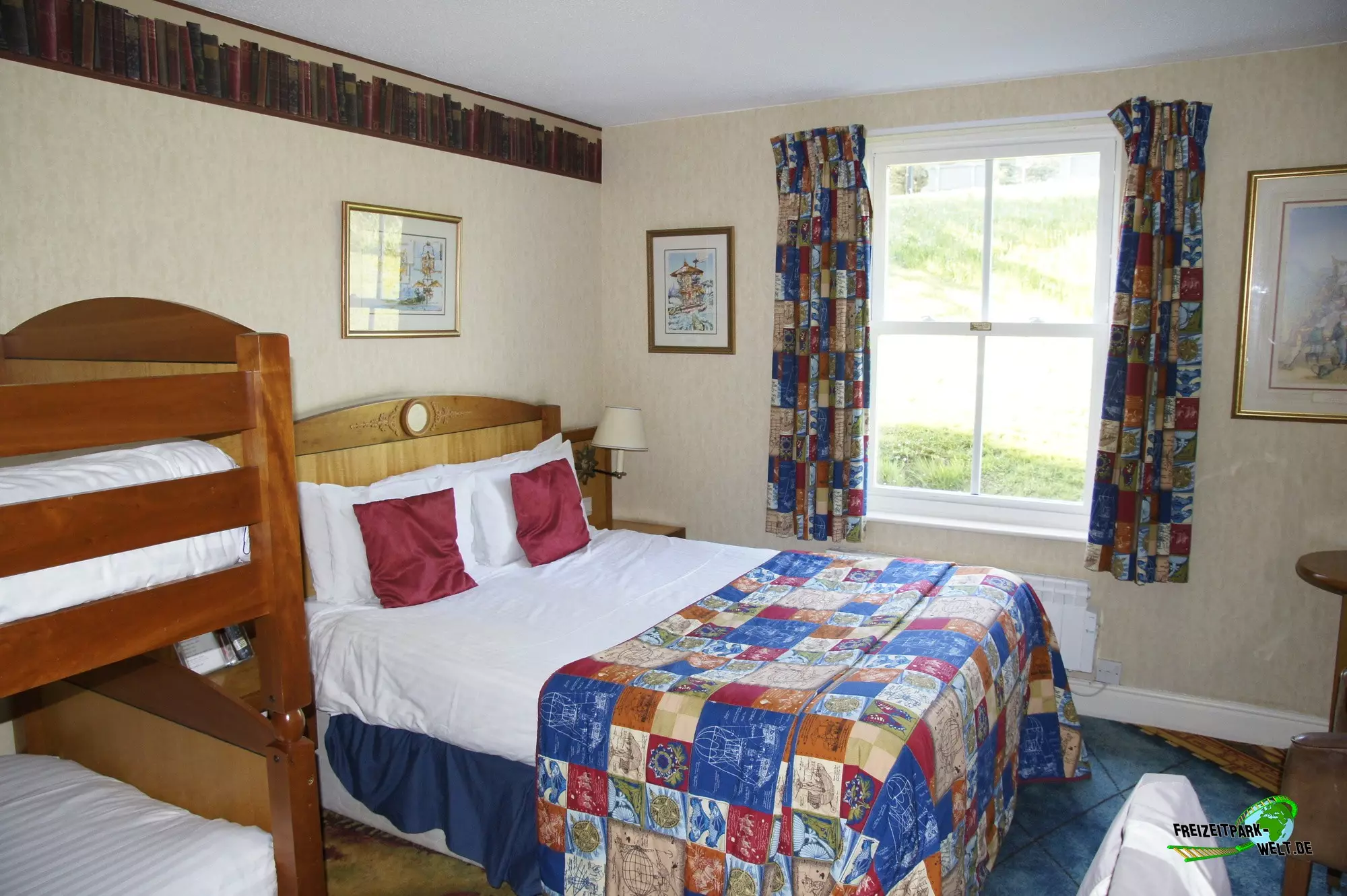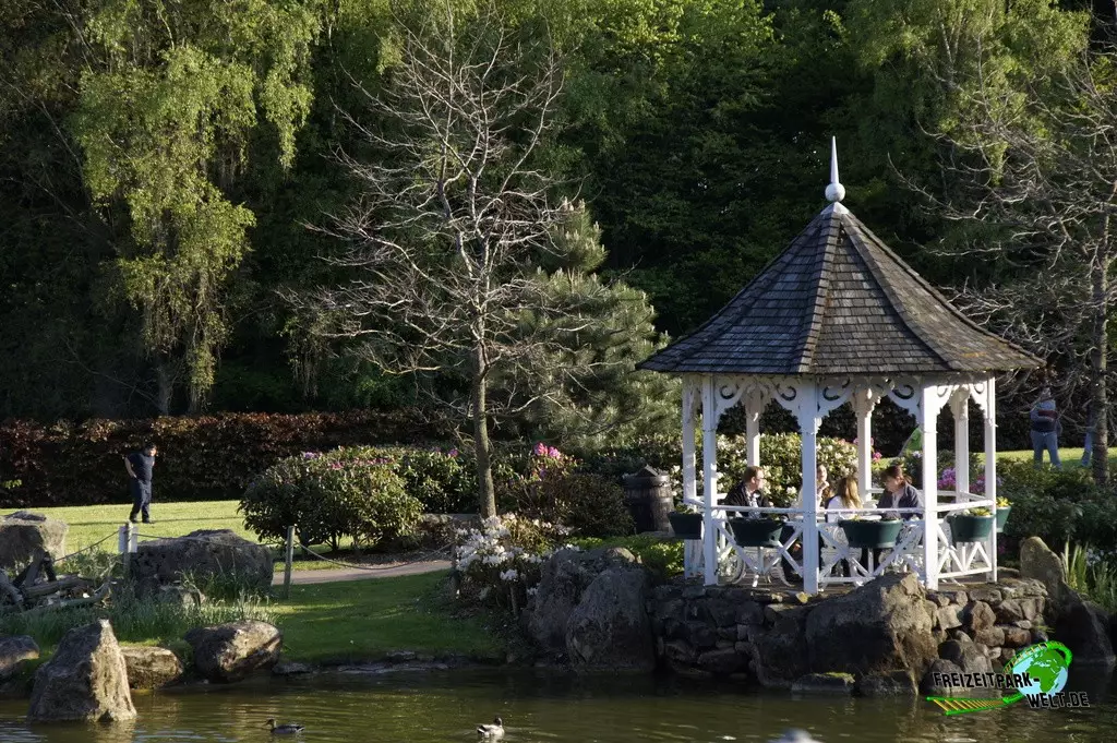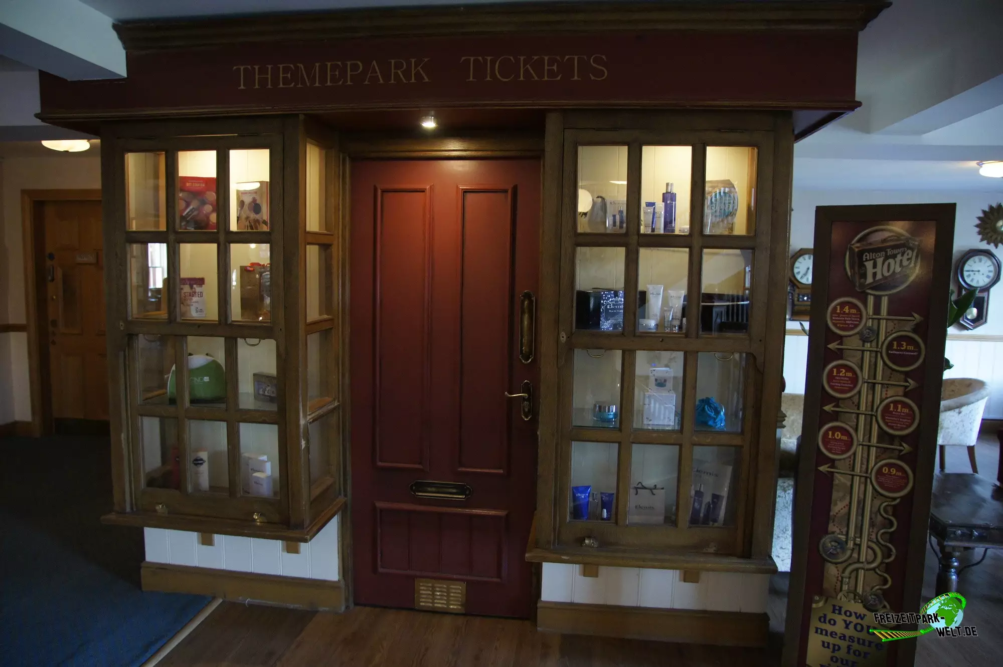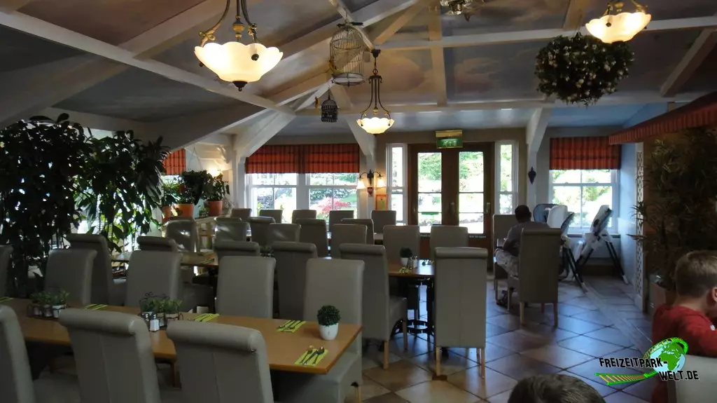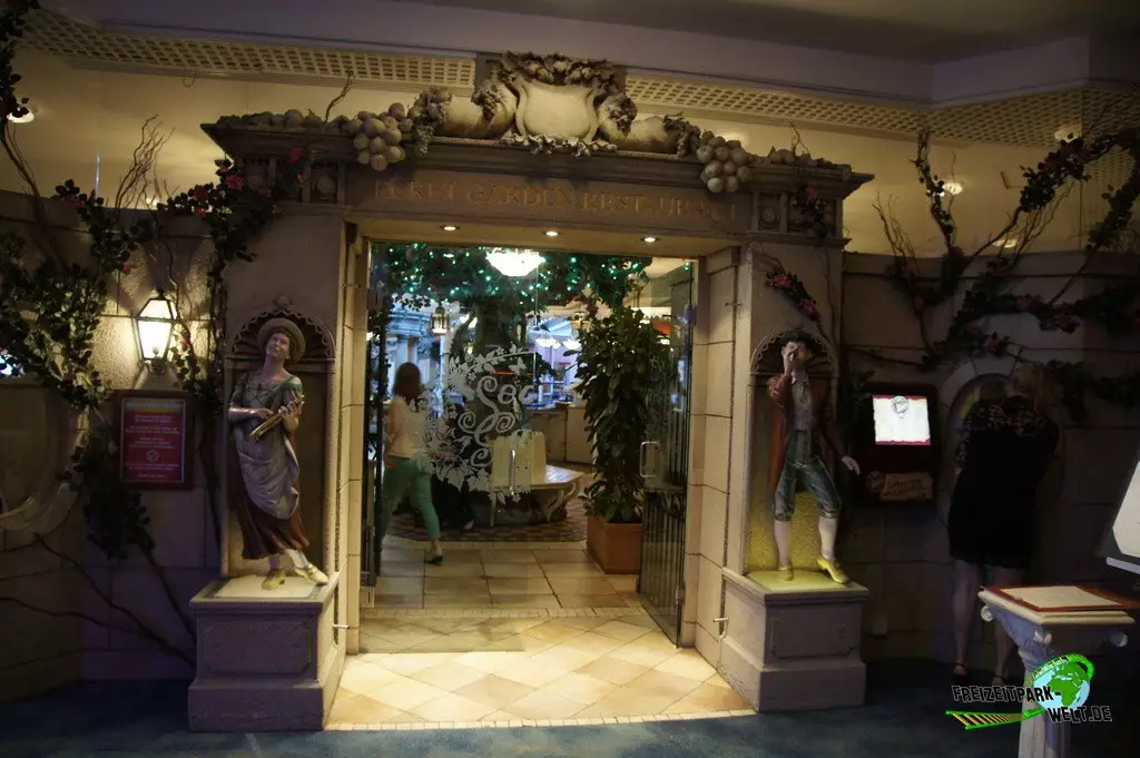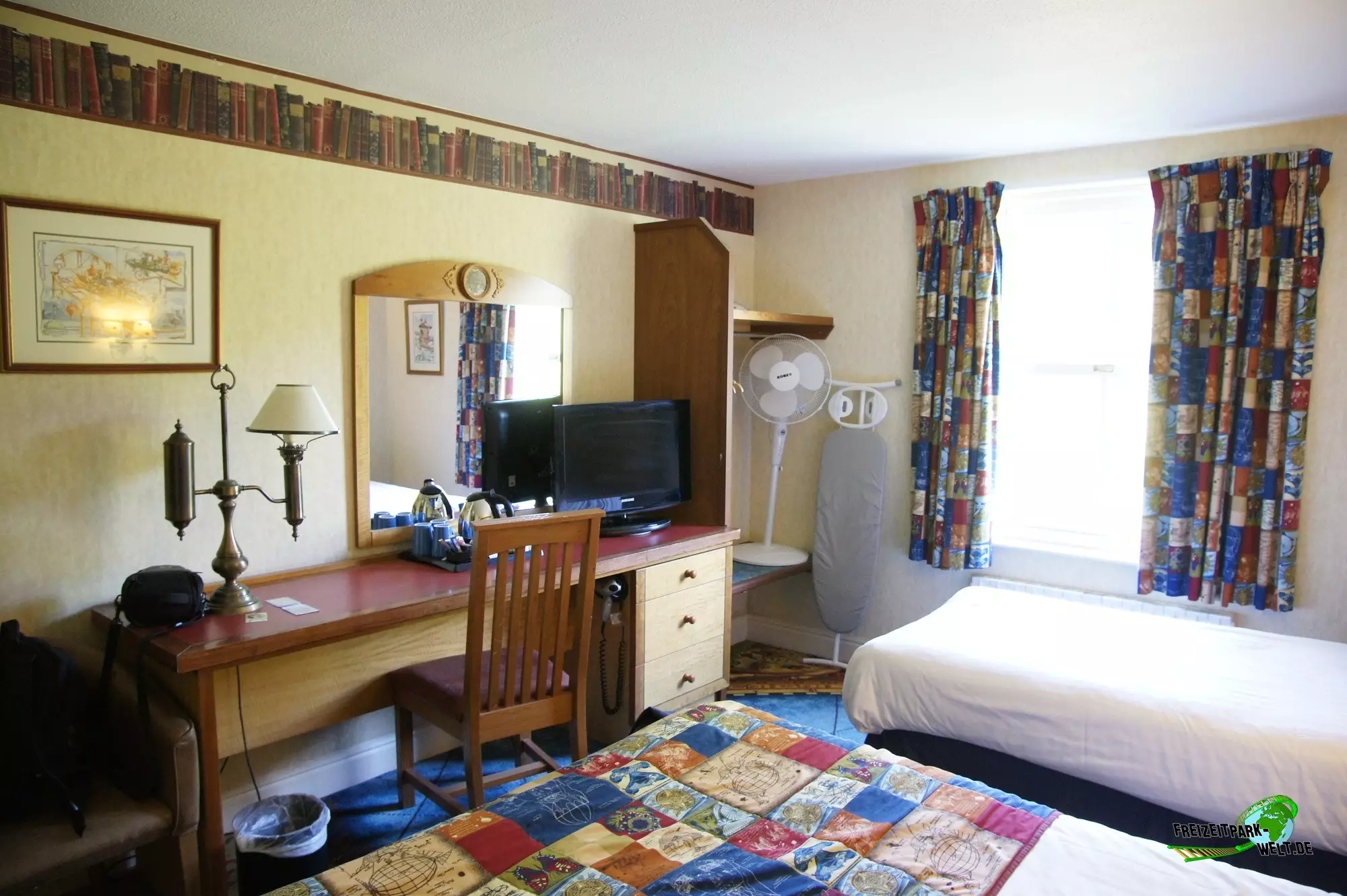 Thematisch ist das Alton Towers Hotel relativ klassisch gehalten und nicht so bunt wie die anderen beiden Hotels. Der Geschichte nach ist der Abenteurer Sir Algenon einst mit seinem Heißluftballon im Hotel gelandet und fand dieses so schön, dass er es zu seiner Heimat machte und zahlreiche Exponate seiner Expeditionen hier hinterließ. Dies wird gleich am Eingang deutlich, wo inmitten des großen Brunnens ein Oldtimer mit zahlreichen Koffern beladen einen ersten Eyecatcher bietet. In der Lobby des Hotels kann man dann auch den Heißluftballon entdecken, der hier ziemlich imposant in der Luft hängt. Interessant ist in der Lobby auch, dass man hier durch die Hanglage fast schon im höchsten Stockwerk ist und es in Richtung der Magical Gardens zwei Etagen ins Souterrain geht. Dadurch öffnet sich die Lobby aber nach hinten sehr schön und wirkt ziemlich groß. Die Einflüsse aus den verschiedensten Kulturen, die Sir Algenon bereist hat, sind in jedem Fall an jeder Ecke zu spüren. So wundert es auch nicht, dass hier plötzlich Palmen in der Lobby stehen und orientalische Laternen für Licht im Dunkel sorgen.Die Zimmer fallen ebenfalls recht bunt aus und hier wird leider auch das Alter des Hotels spürbar. Teilweise ist die Einrichtung relativ abgenutzt gewesen bei unserem Besuch. Dies kann sich natürlich durch Renovierungen auch wieder erledigt haben. Dafür bieten die Zimmer eigentlich alles, was man in einem 4-Sterne Hotel erwartet.