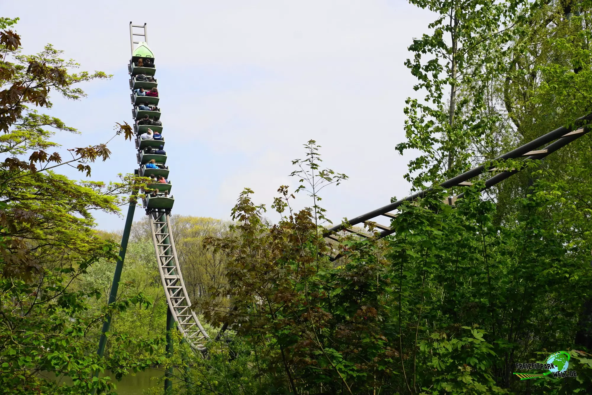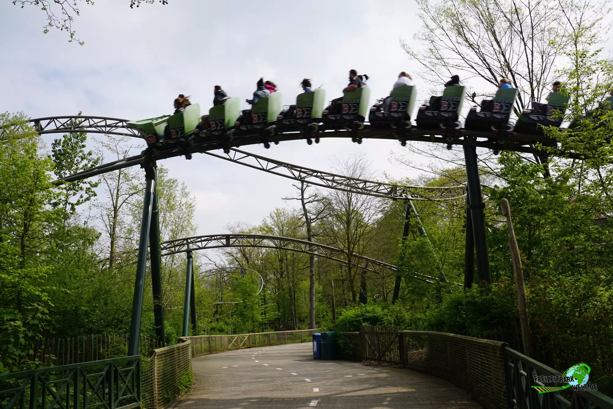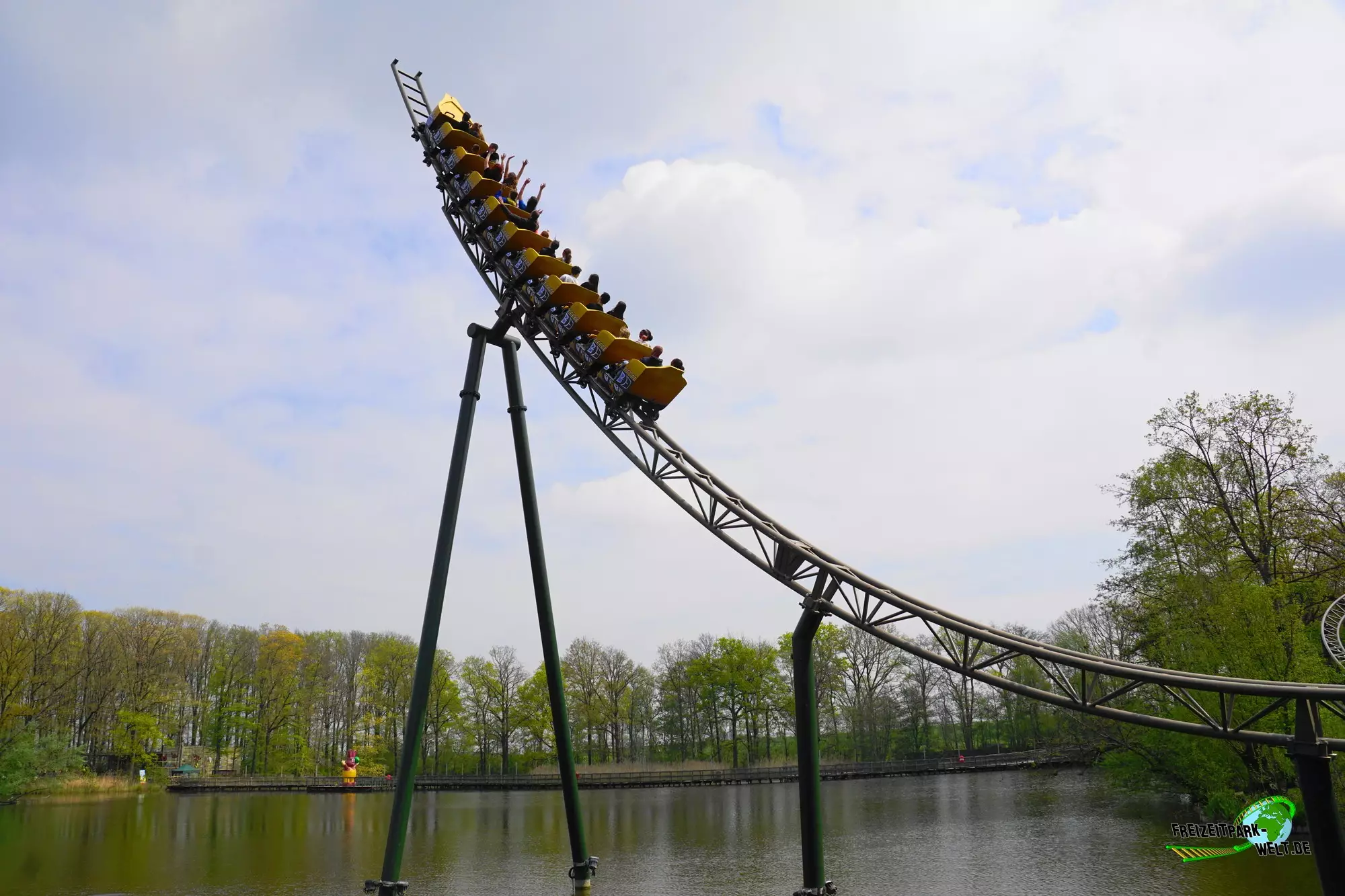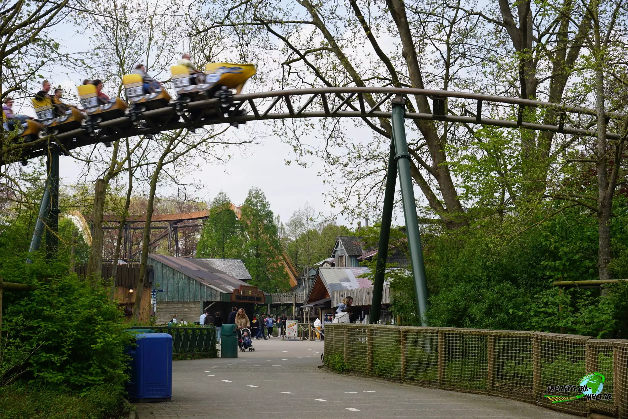 Mit Wakala wurde im Corona-Jahr 2020 eine neue große Familienachterbahn in Bellewaerde eröffnet. Die Anlage wurde am Standort eines ehemaligen Affen-Freigeheges in den kanadischen Themenbereich integriert und ist von vielen Bäumen umgeben. Das hat den Vorteil, dass man nur schwer einen kompletten Überblick über die Strecke bekommt und auch eine Besonderheit des Tracks nicht vom Eingang aus einsehen kann. Wakala verfügt zum Schluss der Fahrt über ein so genanntes Spike-Element über dem See, also eine Rampe, die den Zug rückwärts in die Abschlussbremse bringt. Und das ist wirklich ein Highlight zumal der Zug hier fast bis ans Ende der Rampe gepusht wird. Das haben wir so auch noch nicht oft erlebt.