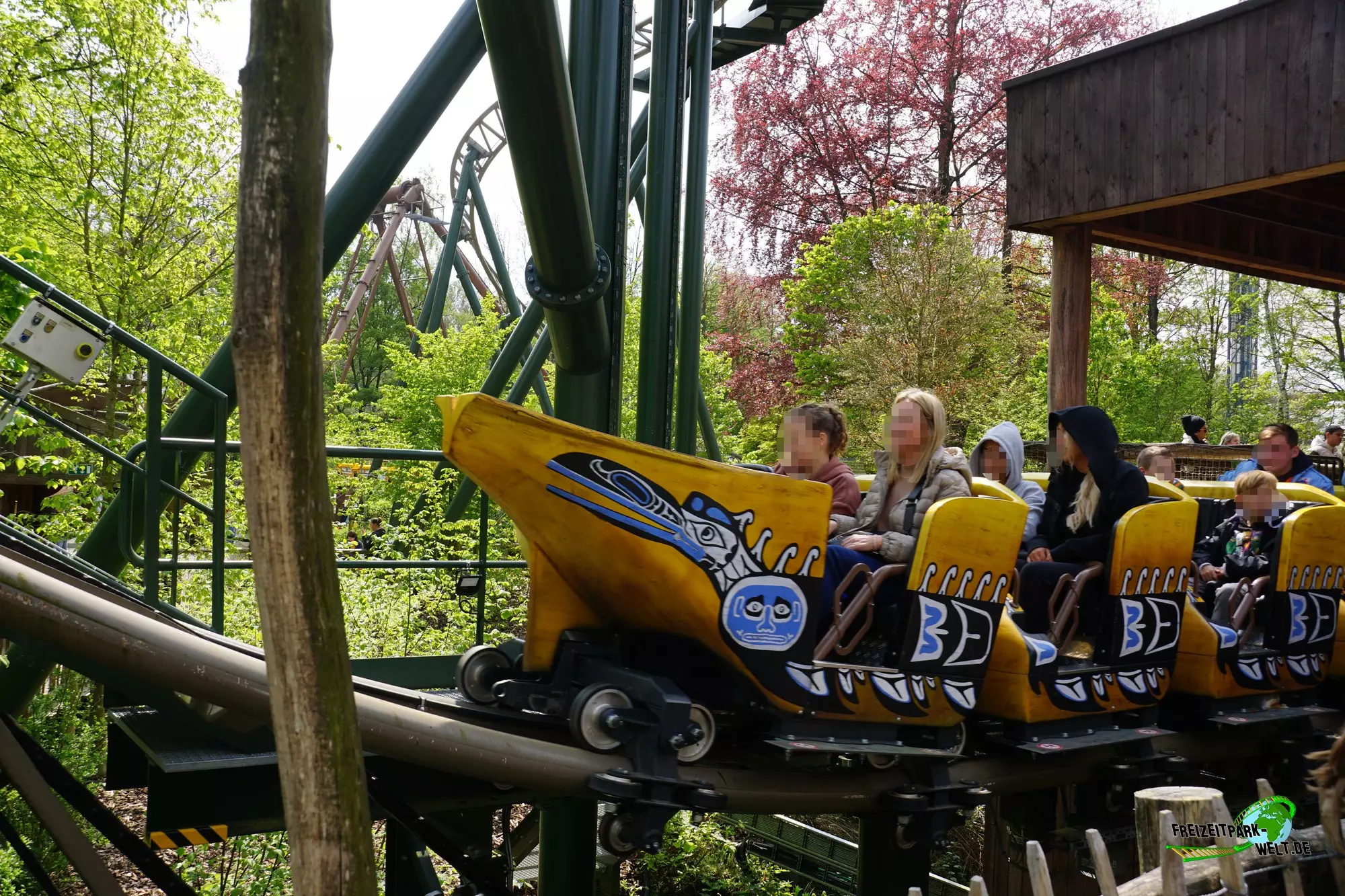 Doch nochmal zurück zum Anfang. Der Eingang befindet sich direkt am Hauptweg gegenüber von Dawson Duel. Von hier betritt man eine unter Umständen recht lange Outdoor-Queue, die aber meistens abgekürzt werden kann. Die Thematisierung hier und in der Station ist recht spärlich. Meistens erinnern hölzerne Gebäude mit Symbolen der indianischen Kultur verziert an die Ureinwohner Kanadas. Bis auf den ebenfalls schön gestalteten Zug in Form eines Bootes gibt es ansonsten in Sachen Thematisierung nicht viel zu sehen. Aber das ist auch gar nicht nötig, denn die Fahrt mit Wakala ist einfach grandios und reißt alles raus.In die Station gelangen jeweils nur so viele Leute wie in den Zug hineinpassen - und das sind bis zu 20 Personen. Bis zu zwei Züge können eingesetzt werden und diese wurden zumindest bei unserem Besuch sehr schnell abgefertigt. Aus der Station heraus geht es dann zunächst einen Kettenlift hinauf. Oben macht der Zug eine leichte Kurve um dann in den geschwungenen First Drop einzutauchen, der Dawson Duel zunächst überquert und dann unterquert und dann oberhalb der Station in Richtung See rast. Die Fahrt ist hier sehr dynamisch mit vielen kleinen Hügeln und geneigten Kurven, die immer wieder Richtungswechsel ergeben und einfach schön und ohne Ruckeln zu fahren sind. Im hinteren Bereich am See vollzieht der Zug dann eine Wende und kehrt auf einem ganz ähnlichen Verlauf zurück in Richtung vorderen Teil wo ein zweiter Lift wartet. Dieser hat etwas weniger Neigung und ist mit Reibrädern bestückt welche den Zug im letzten Drittel nochmal überraschend beschleunigen und einen stark nach rechts geneigten zweiten großen Drop schicken. Der Boost ist hier richtig gut spürbar und sehr spaßig. Über die eigentliche Schlussbremse hinweg geht es auf einer welligen aber langen Geraden in Richtung Highlight der Fahrt - dem Spike. Der Zug rast auf den See zu und fährt dann in den Spike, den man - vorne sitzend - ganz bis nach oben durchfährt. Danach geht es dann rückwärts in die Abschlussbremse wo dann eine Weiche den Weg zurück zur Station freigibt.