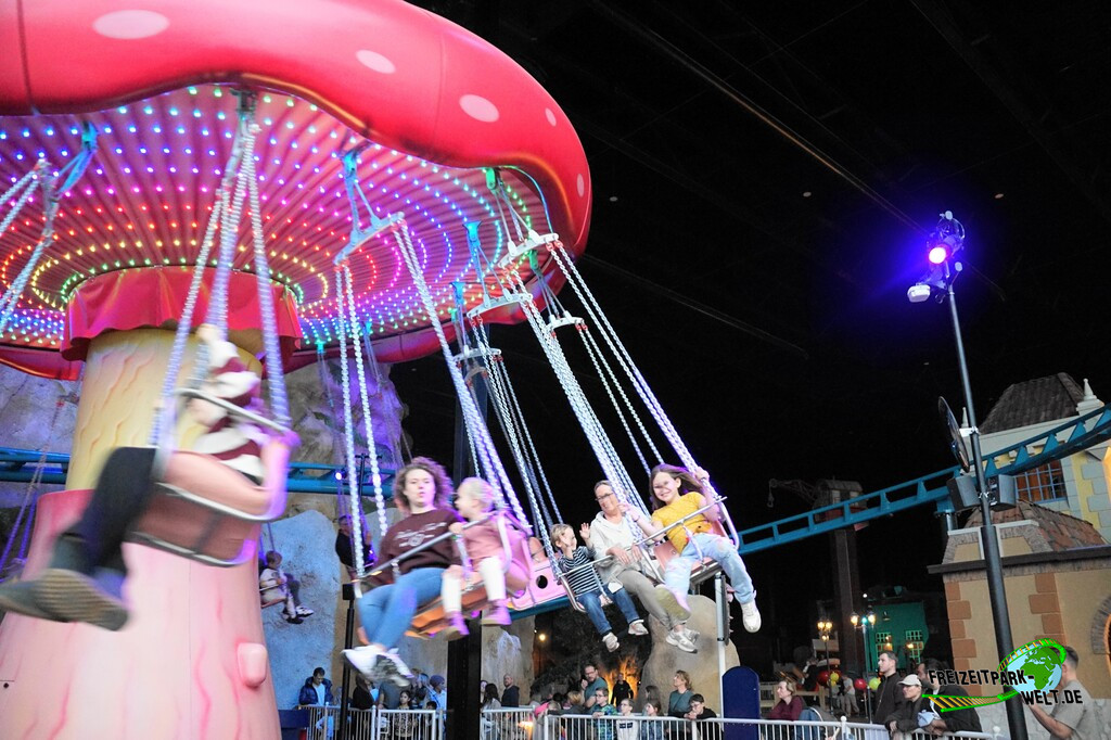 Bereits ab 95cm können Kinder in das Kettenkarussell mit dem witzigen Namen Zwevende Zwam (also in etwa schwimmender Pilz) einsteigen und eine schwungvolle Fahrt im Kreis erleben. Das Karussell von Bertazzon ist dabei einem roten Fliegenpilz nachempfunden, der aber lustigerweise unter dem Pilzkopf bunt beleuchtet ist und damit eine schöne Optik in diesem hellen Hallenbereich zaubert. Das Kettenkarussell bietet zwei verschiedene Sitzkonfigurationen. Abwechselnd gibt es jeweils einen Einzelsitz und dann einen Doppelsitz, wo Kinder zusammen mit ihren Eltern fahren können.