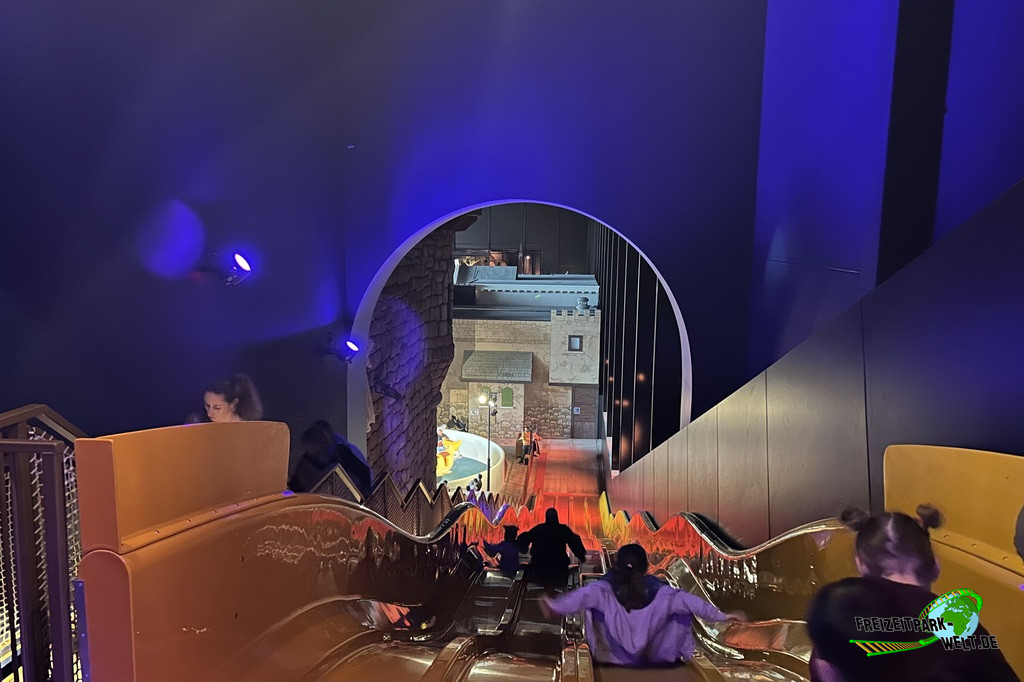 Die Wellenrutsche ist in jedem Park für Kinder ein Highlight, weil man hier nie lange anstehen muss und man sofort viel Spaß haben kann. Das Sofort kann in der Bommelwereld sogar noch wörtlicher genommen werden, denn angekommen in Schloss Bommelstein ist die Roetsjbaan die erste Attraktion überhaupt, die man nach dem Eintritt ziemlich direkt machen kann. Über einen seitlichen Zugang kommt man nämlich direkt zur Rutschplattform. Allerdings muss man sich leider erst eine Matte von unten holen. Insofern relativiert sich die Aussage dann doch wieder.