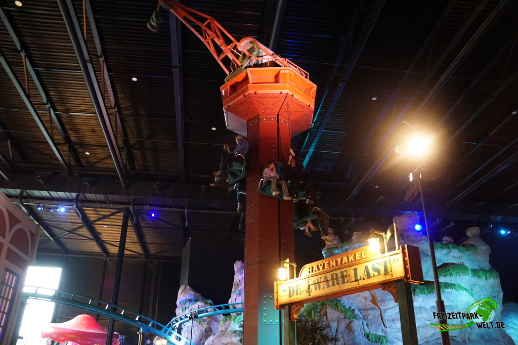 Kein Wunder, dass sich auch 2025 in der Bommelwereld eine solche Attraktion befindet. Unter dem Namen Haventakel 'De Zware Last' befindet sich im Hafenbereich hinter der Stadt eine solche Attraktion, die hier einen tollen Rundumblick von zentraler Stelle bietet. Und dass sich seit den ersten Hubseiltürmen in den 90er Jahren vor allem thematisch ordentlich was getan hat erkennt man, denn die Thematisierung als Schwerlastkran ist wirklich originell und hier besonders gelungen. Besonders gut hat uns ja wieder das Logo der Attraktion im Eingangsbereich gefallen. Logos können sie hier in der Bommelwereld.