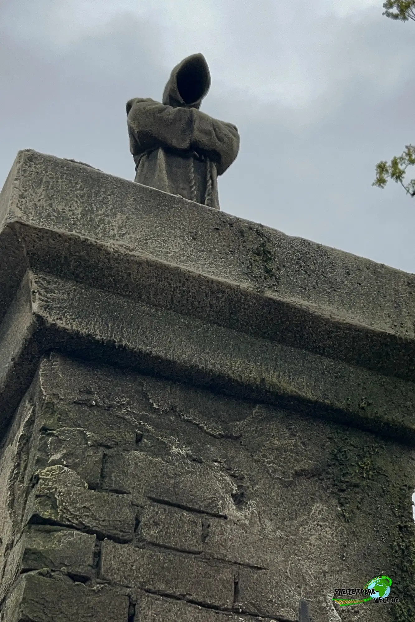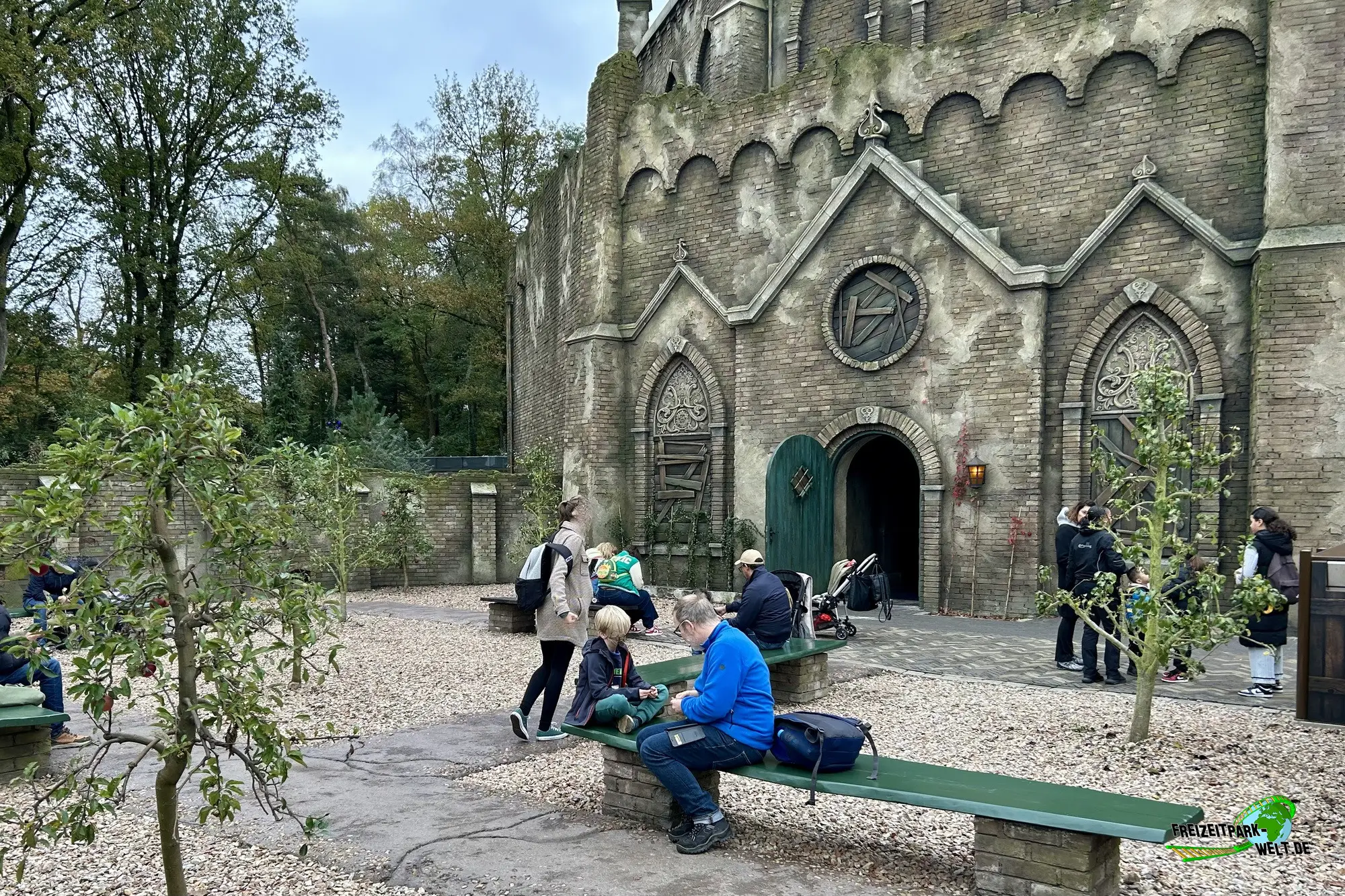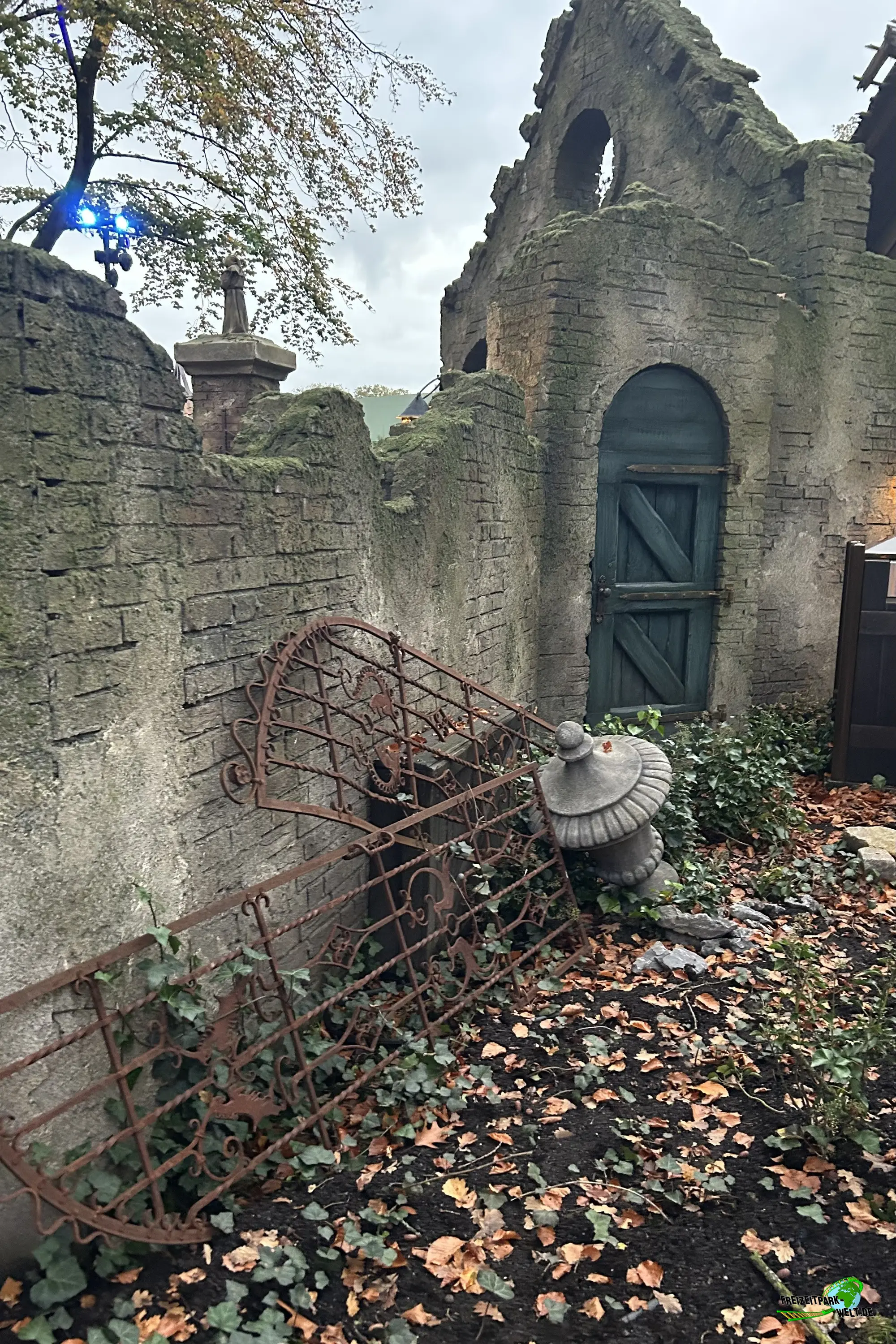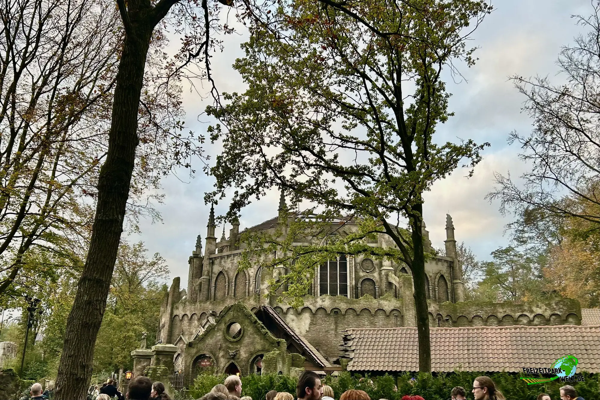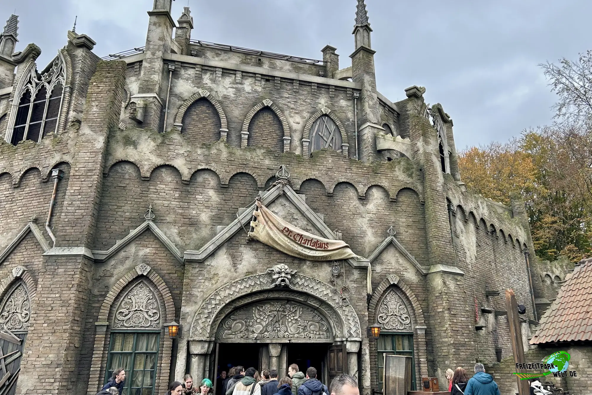 Und genau dort setzt Danse Macabre an, denn auch hier steht die Musik im absolutem Zentrum der Attraktion und zwar die gleiche Musik wie im Spookslot. Danse Macabre ist also wieder eine gruselige Attraktion, ja ein ganzer Themenbereich, der immer wieder Bezug auf das alte Spookslot nimmt und das Erlebnis auf ein ganz neues Niveau hebt. Statt des Spookslot gibt es nun eine alte, riesige Abtei, die von außen ziemlich herunter gekommen ist und sich an realen Vorbildern aus Belgien orientiert. Doch bevor es hier rein geht und ihr die neue unbeschreibliche Kombination aus Show, Fahrgeschäft und Dark Ride genießt, heißt es erstmal Warten, lange Warten. In unserem Fall waren es an Tag 3 der Öffnung immerhin 100min.Stimmungsvolles Warten zwischen Kreuzgang und Wald