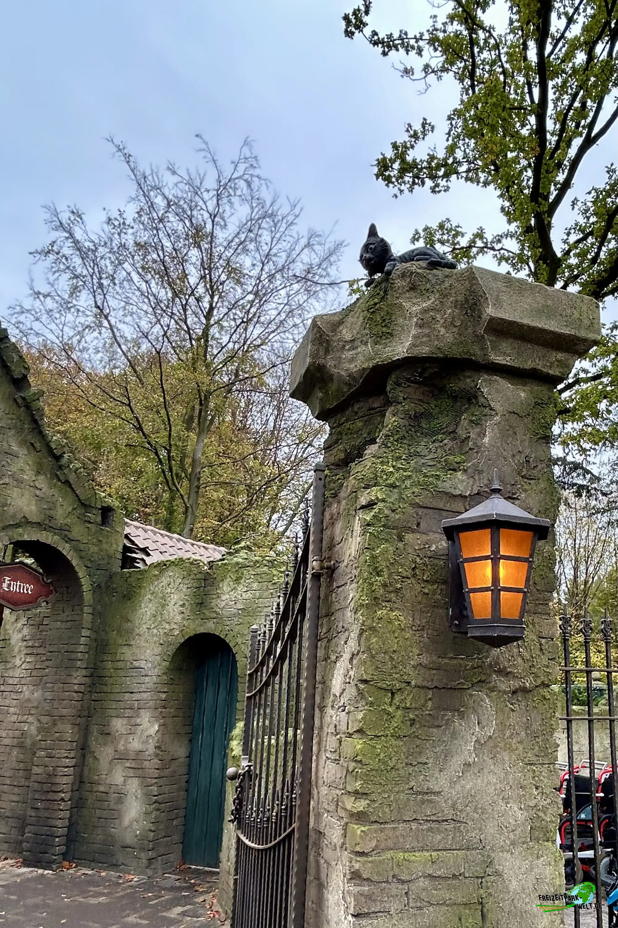 Dabei beginnt das Erlebnis aber schon in der Warteschlange, die vom Efteling als Wartereise bezeichnet wird. Und tatsächlich ist die Queue als Einstimmung auf ein gruseliges Fahrerlebnis richtig gut gelungen. Vier klar erkennbare Bereiche stimmen uns auf das Abenteuer ein, wobei die Warterei mit dem Kreuzgang beginnt. Ein zum großen Teil überdachter Bereich mit vielen, z.T. abbruchreifen Häusern, die man - untermalt von kirchlichen Chorgesängen, durchquert. Toll ist hier, dass man vom restliche Parkgeschehen praktisch nichts mitbekommt. Man hat also genug Zeit sich einzustimmen ohne gestört zu werden. Danach geht es in den Kräutergarten, der eher unscheinbar ist und als Zugang zum Friedhof dient. So ca. alle 3,5 Minuten öffnet sich hier das Tor zum gruseligen Teil der Warteschlange. Dieser beginnt mit dem Friedhof, den man als kleine Pre-Show bezeichnen kann. Die Ereignisse rund um den Dirigenten Joseph Charlatan werden hier (auf niederländisch) erzählt. Dieser ist nach der Teilnahme an einem Musikwettbewerb am Freitag, den 13. spurlos verschwunden... Grabsteine, klappernde Türen und Geisterklänge hier wird man gut eingestimmt. Danach geht es dann direkt in den letzten Teil des Wartebereichs, dem Huyverwoud. Und das tolle an diesem weitläufigen Weg ist, dass dieser nur von den Leuten begangen wird, die vorher auch schon auf dem Friedhof waren. Dadurch vermittelt der Waldbereich wirklich etwas wie Verlassenheit und leere Wege, wiederum untermalt von noch bedrohlicherer Soundkulisse. Übrigens sieht man hier auch noch alte Ruinen des Spookslots in Form einer Mauer. Alles ist irgendwie mystisch und die Stimmung kommt erstaunlicherweise gut rüber. Dann geht es auch schon über eine Holzbrücke in die Katakomben der Abtei.