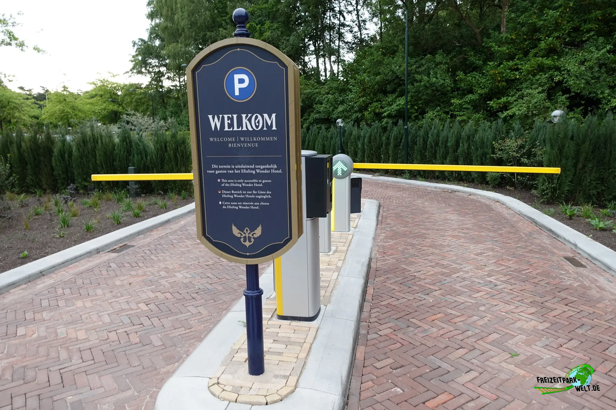 Das ikonische Hotel mit den vier Türmen, das den Gästen das Gefühl vermitteln soll, sich in einem „Wolkenschloss“ zu befinden wurde vom 6. Januar bis Mitte April 2025 und umfangreich renoviert. Bereits überarbeitet wurden die Hotelzimmer 2021 sowie die Außenanlage 2023, nun folgte die Erneuerung des gesamten Erdgeschosses. Gäste schlafen im Efteling Wonder Hotel in verträumten Zimmern oder märchenhaften Suiten, in denen die Geschichten von Efteling weitererzählt werden.Mit dem digitalen Zimmerschlüssel (dafür wird die Efteling App benötigt) konnten wir bei unserer Ankunft in den Vormittagsstunden bereits durch die Parkplatzschranke auf den noch nicht ganz fertig gestellten großen Hotelparkplatz fahren und unseren Wagen abstellen. Die Parkplatznutzung war für den gesamten Aufenthalt im Efteling Wonder Hotel kostenfrei.