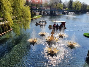 Schon beim Betreten des nun umgestalteten Abenteuersees fällt der große Fokus auf das Element Wasser auf. An praktisch allen Ecken und Ende schießen Fontänen aus dem See, inkl. der neuen Wasser-Show "Wiener Wasser Walzer", die vom französischen Hersteller Aquatiqe Show realisiert wurde und in regelmäßigen Abständen präsentiert wird. Doch auch ohne diese Show ist das Erlebnis schon spritzig genug. Schon in der noch nahezu unveränderten Station sieht man die zahlreichen Fontänen-Spiele, wie einen Flügel-schwingenden Schwan oder auch die kleinen Brunnen, die entlang der Insel eine Reminiszenz an die alte Flossfahrt darstellen und als Nashorn bzw. Elefant gestaltet sind. In der Mitte des See durchfährt man verschiedene kleine Szenen mit Josefina, ihrem Gemahl und den Yomis, die offenbar auch mit der Geschichte rund um die Zauberwelt der Diamenten verbunden sind. Es folgen mehrere Wassertunnel und eine weitere Josefina mitsamt Wasserkleid - ein toller Effekt, deren Funktionsfähigkeit aber auch schwankend ist. Mal ist das Wasser schön glatt und wirkt gut als Kleid, mal spritzt es eher aus der Hüfte heraus.