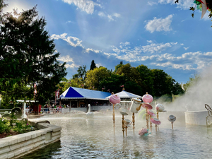Schon beim Betreten des nun umgestalteten Abenteuersees fällt der große Fokus auf das Element Wasser auf. An praktisch allen Ecken und Ende schießen Fontänen aus dem See, inkl. der neuen Wasser-Show "Wiener Wasser Walzer", die vom französischen Hersteller Aquatiqe Show realisiert wurde und in regelmäßigen Abständen präsentiert wird. Doch auch ohne diese Show ist das Erlebnis schon spritzig genug. Schon in der noch nahezu unveränderten Station sieht man die zahlreichen Fontänen-Spiele, wie einen Flügel-schwingenden Schwan oder auch die kleinen Brunnen, die entlang der Insel eine Reminiszenz an die alte Flossfahrt darstellen und als Nashorn bzw. Elefant gestaltet sind. In der Mitte des See durchfährt man verschiedene kleine Szenen mit Josefina, ihrem Gemahl und den Yomis, die offenbar auch mit der Geschichte rund um die Zauberwelt der Diamenten verbunden sind. Es folgen mehrere Wassertunnel und eine weitere Josefina mitsamt Wasserkleid - ein toller Effekt, deren Funktionsfähigkeit aber auch schwankend ist. Mal ist das Wasser schön glatt und wirkt gut als Kleid, mal spritzt es eher aus der Hüfte heraus.