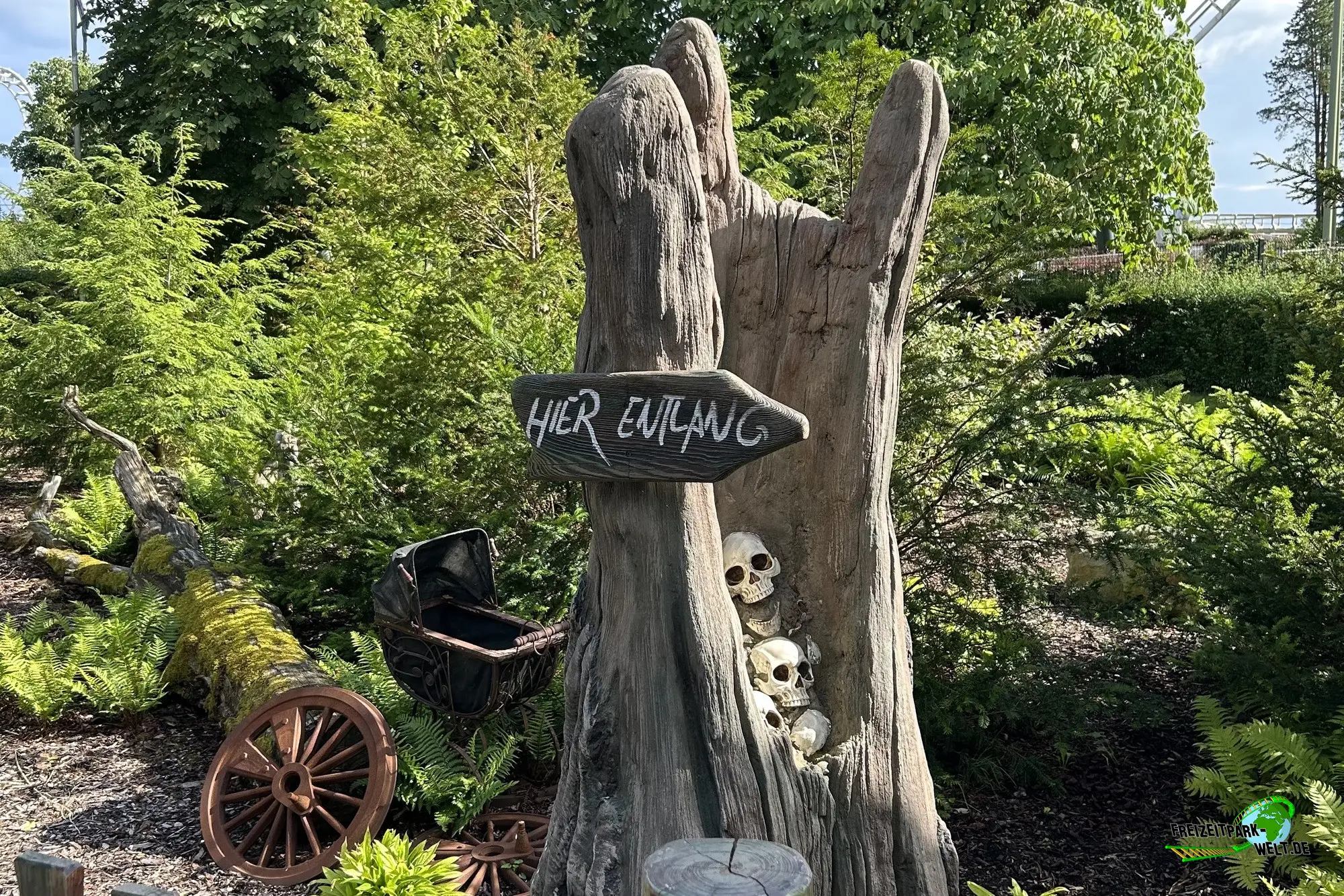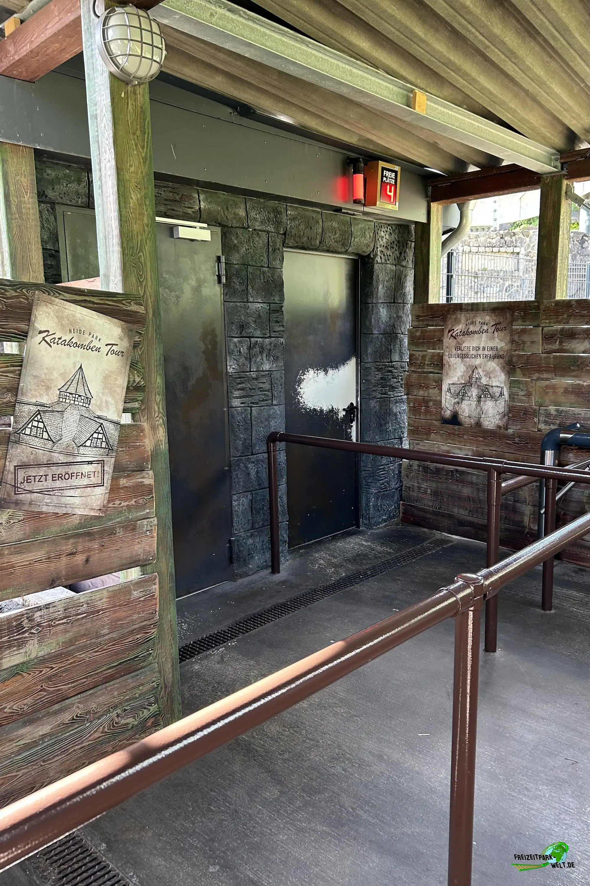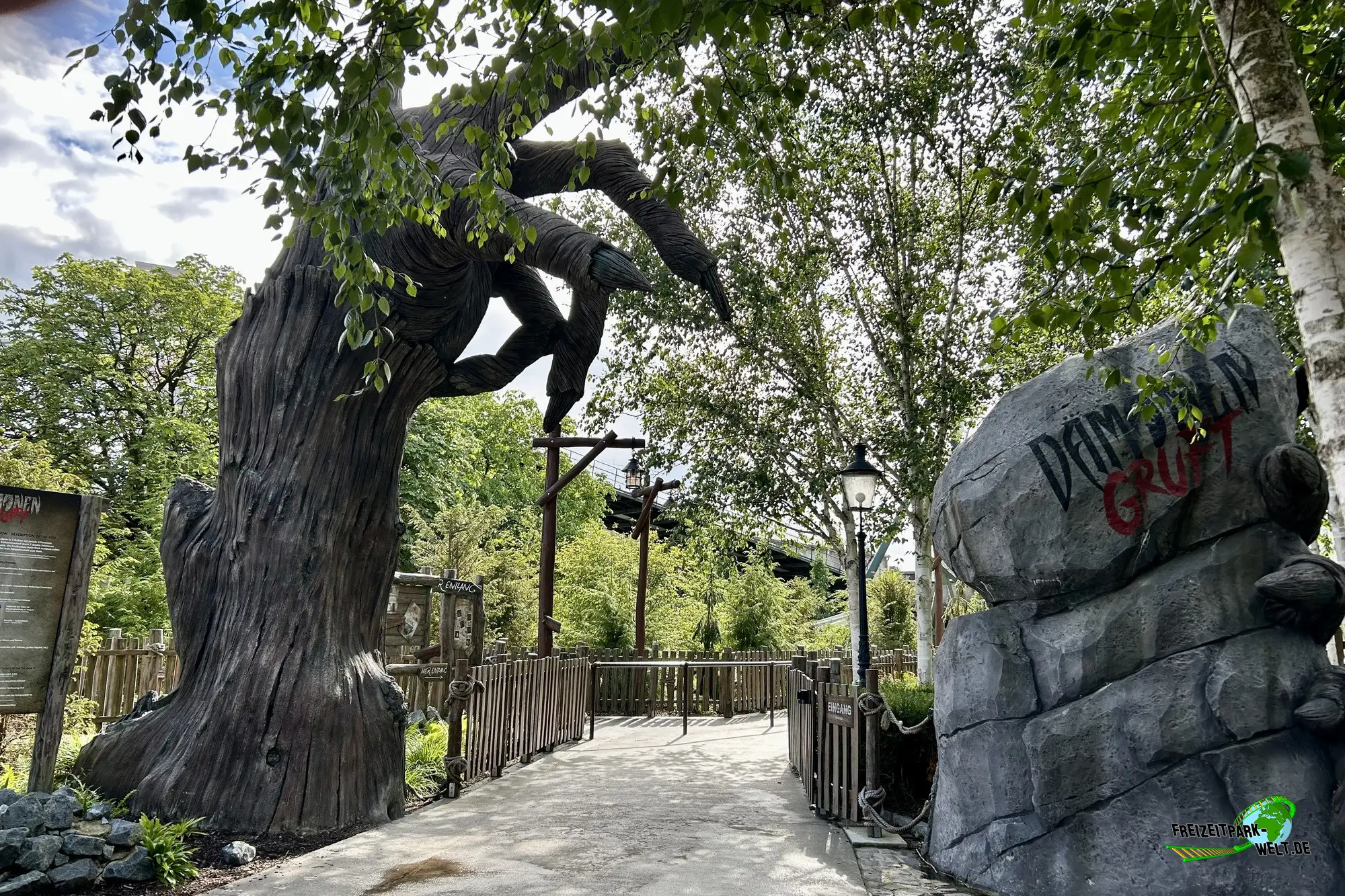 Die Attraktion führt die Besucher in die Tiefen des Heide Park Resort. Bei Baggerarbeiten sollen hier nämlich zufällig Katakomben entdeckt worden sein, in welche fortan Touren angeboten werden können. Und diese Touren starten direkt unterhalb des Wing Coaster Flug der Dämonen, wobei der Zugang zur Dämonengruft zwischen der Bobbahn und Toxic Garden liegt. Gruselig geformte Bäume säumen den Weg und über einige Plakate in der Warteschlange erfährt man mehr zu den "Ausgrabungen". Und interessanterweise befindet sich die Dämonengruft wirklich in alten Bereichen des Heide-Parks. Hier wurde nämlich die Station der nicht mehr existenten Wildwasserbahn II genutzt. Damit dürfte den Kennern bereits klar sein, dass die Fläche nicht wirklich groß sein kann. Und tatsächlich ist die Fahrzeit mit nicht wirklich lang.Die Fahrt: Kurz und knackig