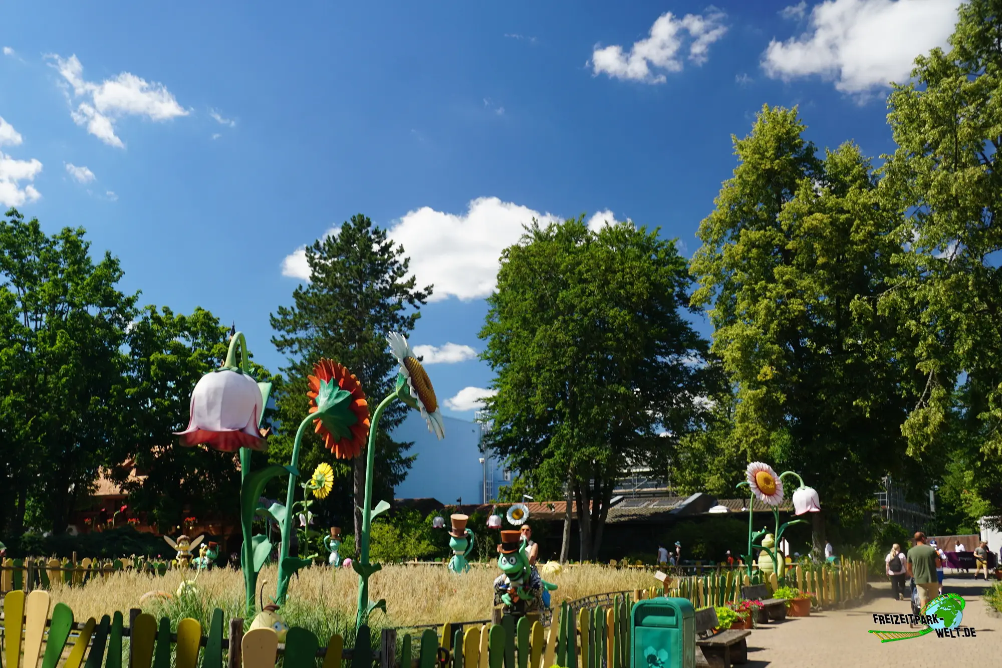 Flip - Der Grashüpfer ist eine Reitbahn von Metallbau Emmeln. Die Anlage richtet sich an kleinere Kinder und bietet einen interessanten Parcours rund um die Figuren der Biene Maja-Serie.