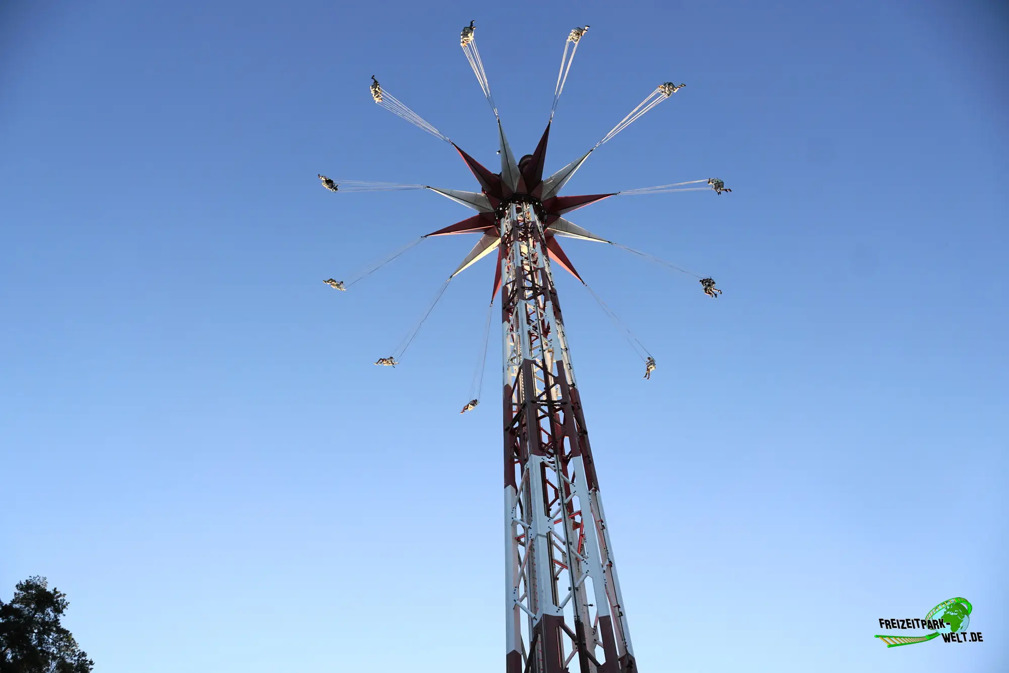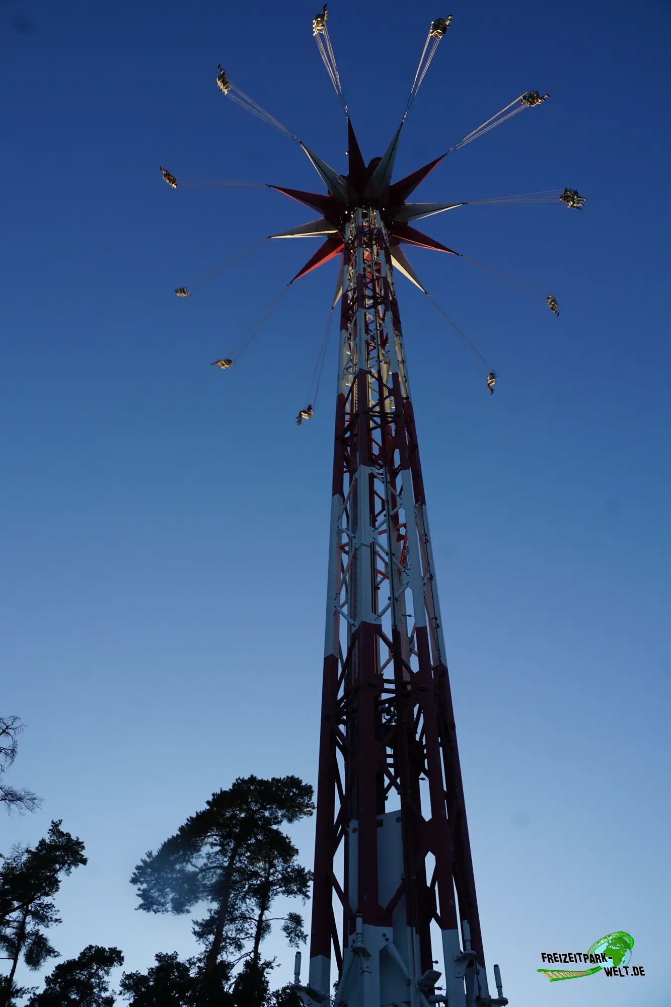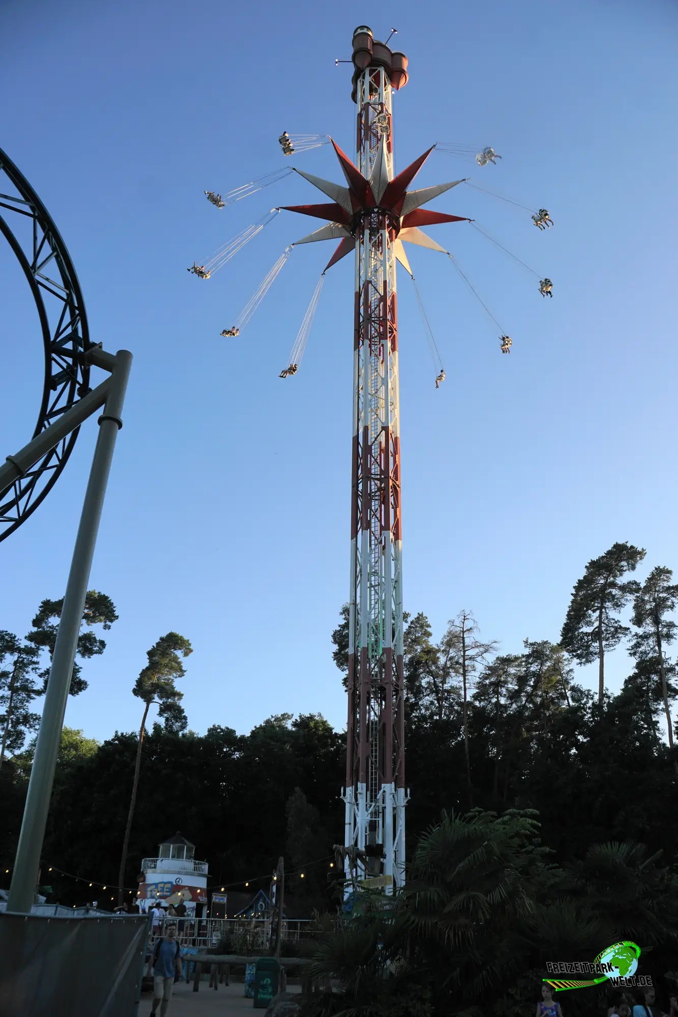 Im Gegensatz zum ein Jahr vorher eröffneten Torre del Mar im Hansa-Park wurde diesem Turm ein schönes Theming in Form eines Leuchtturms gegeben. Genau genommen handelt es sich um den Leuchtturm "Roter Sand", der an der Wesermündung zu finden ist und mittlerweile nur noch touristisches Ziel ist. Weitaus funktionsfähiger ist dagegen der Leuchtturm in Haßloch. Hat man sich erstmal einen Platz in den Zweisitzer-Gondeln erobert, Bügel und Anschnallgurt gesichert, so kann es losgehen. Die Fahrt beginnt gemächlich ohne Drehung bevor auf ca. 1/3 der Höhe der Gondelkranz in Bewegung gesetzt wird und die Gondeln seitlich ausschwingen lässt. Schließlich wird die Maximalhöhe erreicht, wo es eine wunderschöne Aussicht über die Pfalz zu genießen gibt. Nocheinmal geht es bis zur Mitte des Turms und wieder hoch, bevor man auch schon das Ende der familienfreundlichen Fahrt erreicht hat. Das Fahrprogramm wurde dabei sehr "gemütlich" gehalten um auch Eltern und Großeltern in den Genuß dieser Fahrt kommen zu lassen.Der Star Flyer des österreichischen Herstellers Funtime avanciert mehr und mehr zum Verkaufsschlager. Lighthouse Tower ist bereits die siebte Auslieferung dieses Fahrgeschäfts-Typus nach dem Prototypen im Wiener Prater (Baujahr 2004).