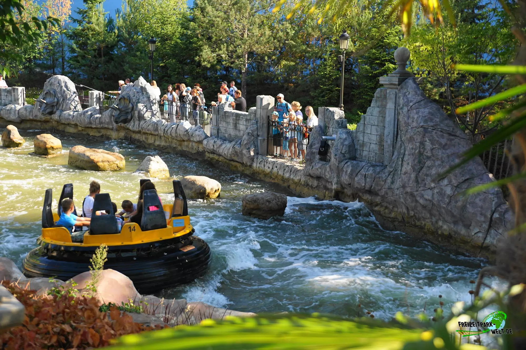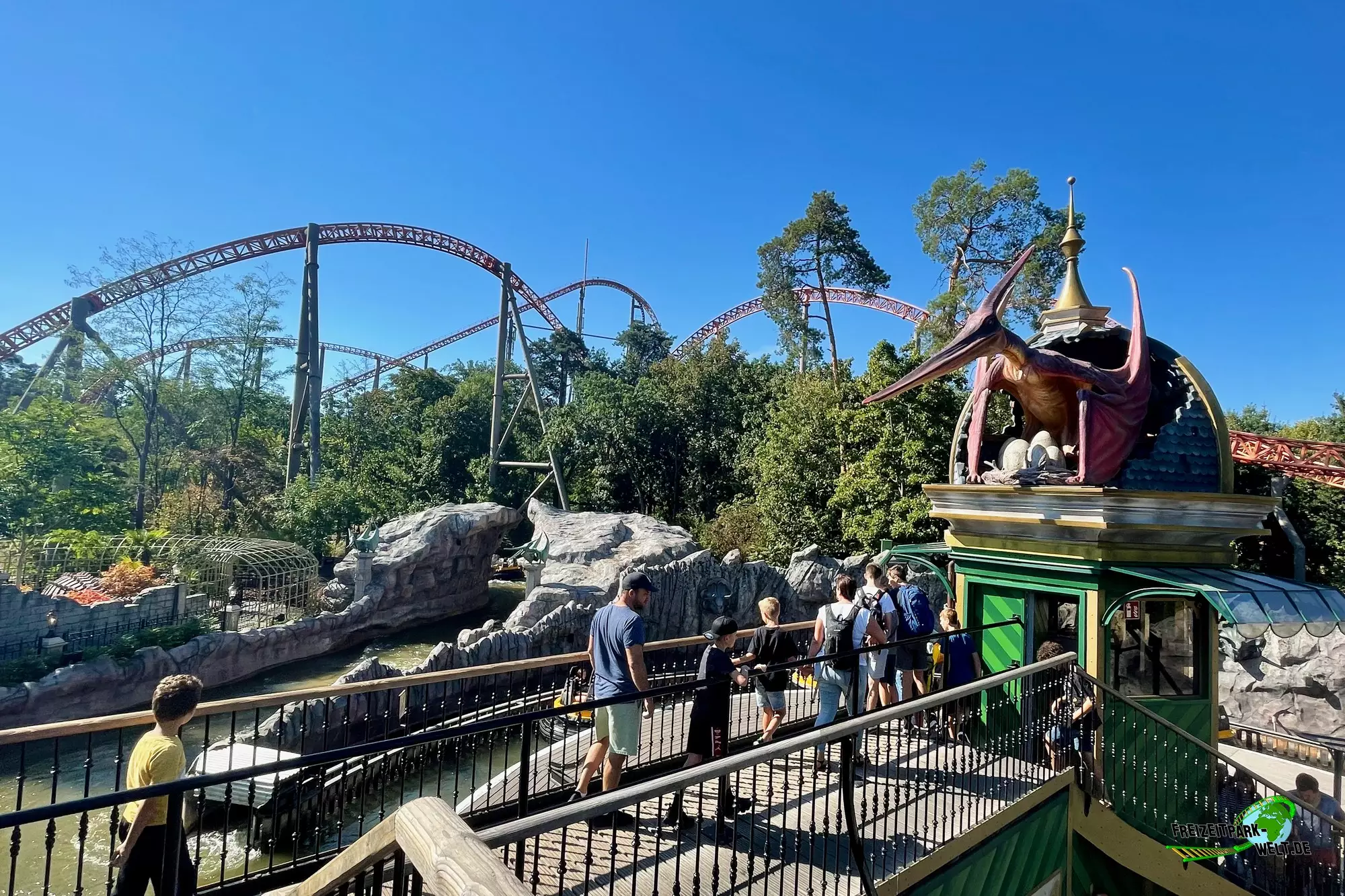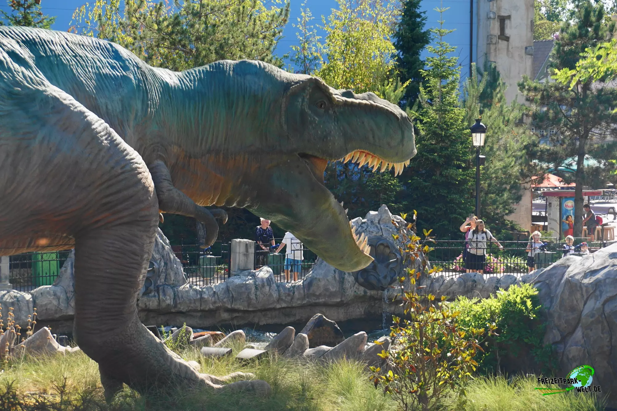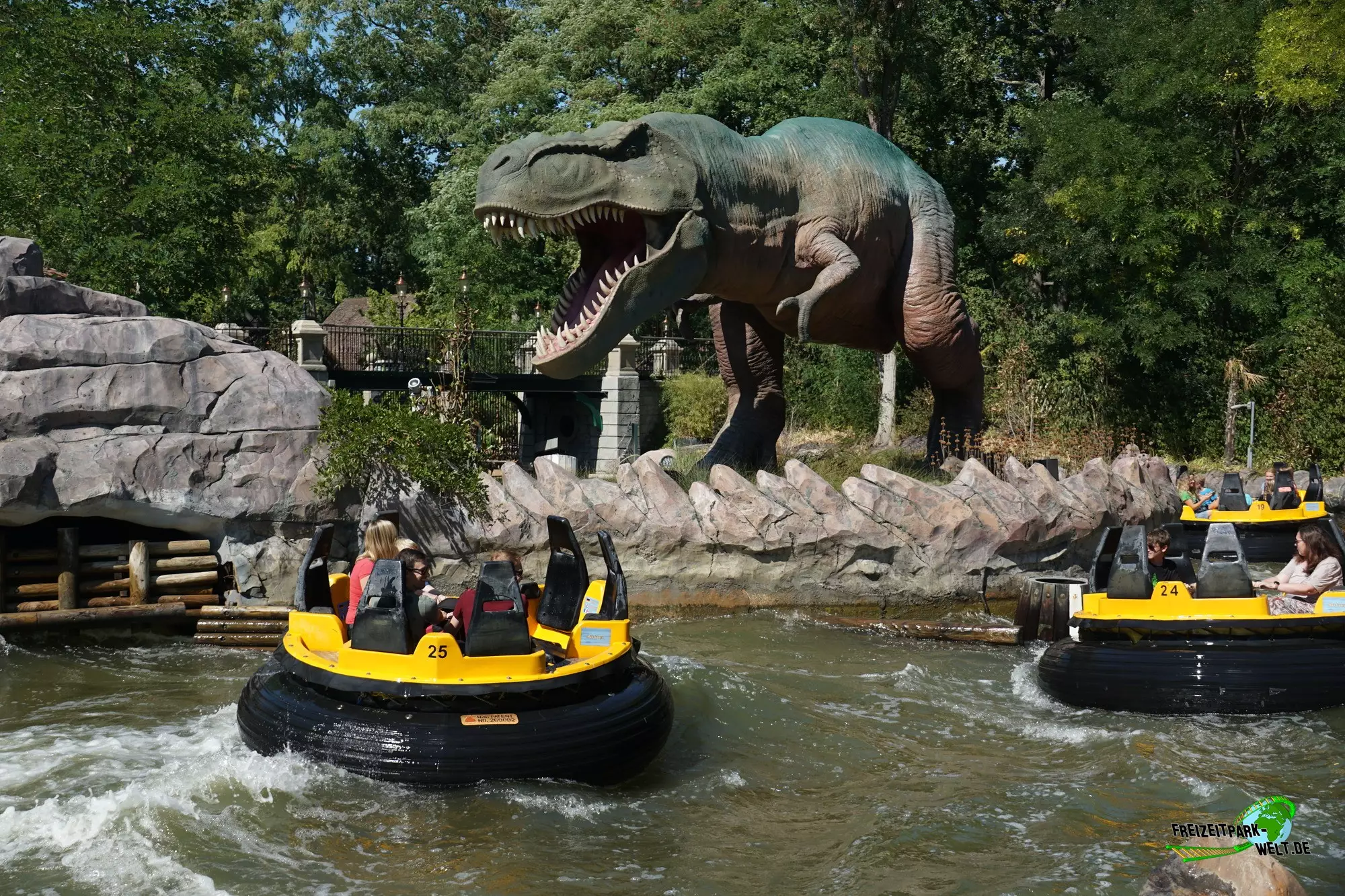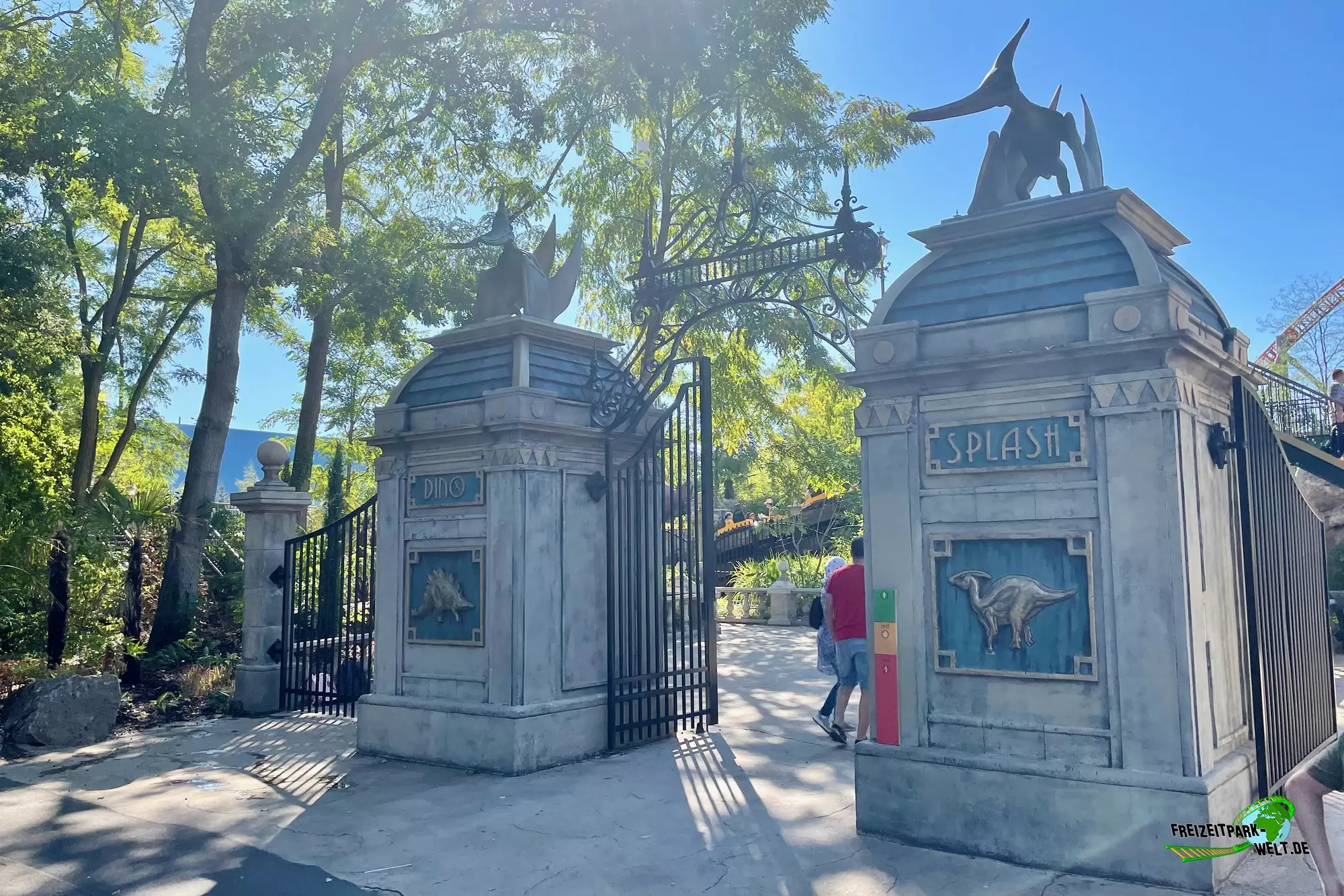 Das Dino Thema bot sich an, da es sowieso an anderen Plopsa Standorten bereits verschiedene Dino-Attraktionen gab und so gibt es seit der Saison 2020 nun auch im Holiday Park eine Wasser-Attraktion mit Dino-Thema. Eröffnet wurde die komplett neu gestaltete Anlage im Sommer 2020 und hebt die Fahrt auf ein ganz neues Niveau. Schon das Eingangsportal mit hohen Säulen und aufgerissenen Torstäben macht einiges her und ist der Startpunkt auf den Weg zur Station. Dabei passiert man nicht nur einen Teil der 17 nagelneuen Dino-Animatronics, sondern läuft auch einen sehr detailreich gestalteten Weg mitsamt kleinen, verlassenen Gebäuden und vielen barocken Details entlang. Tropische Bepflanzung rundet die Thematisierung ab. Eyecatcher ist der 7 Tonnen schwere Tyrannosaurus Rex, der sich auffällig am letzten Wellenbecken postiert hat und damit auch schon fast die Fahrt abschließt. Ebenso kommt man hier sehr nah an das Becken ran, so dass sich viele Beobachtungs- und Spritzmöglichkeiten ergeben.Wie eigentlich fast alle Dinos bewegt sich der Tyrannosaurus Rex dazu glaubwürdig und ist auch vom Detailgrad her sehr gut gelungen. Eigentlich begegnet man so fast allen Dinotypen beim Dino Splash, auch Flugsaurier sind in aus ihren Volieren ausgebrochen, was entlang der Queue und auch vom Rafting sichtbar ist.