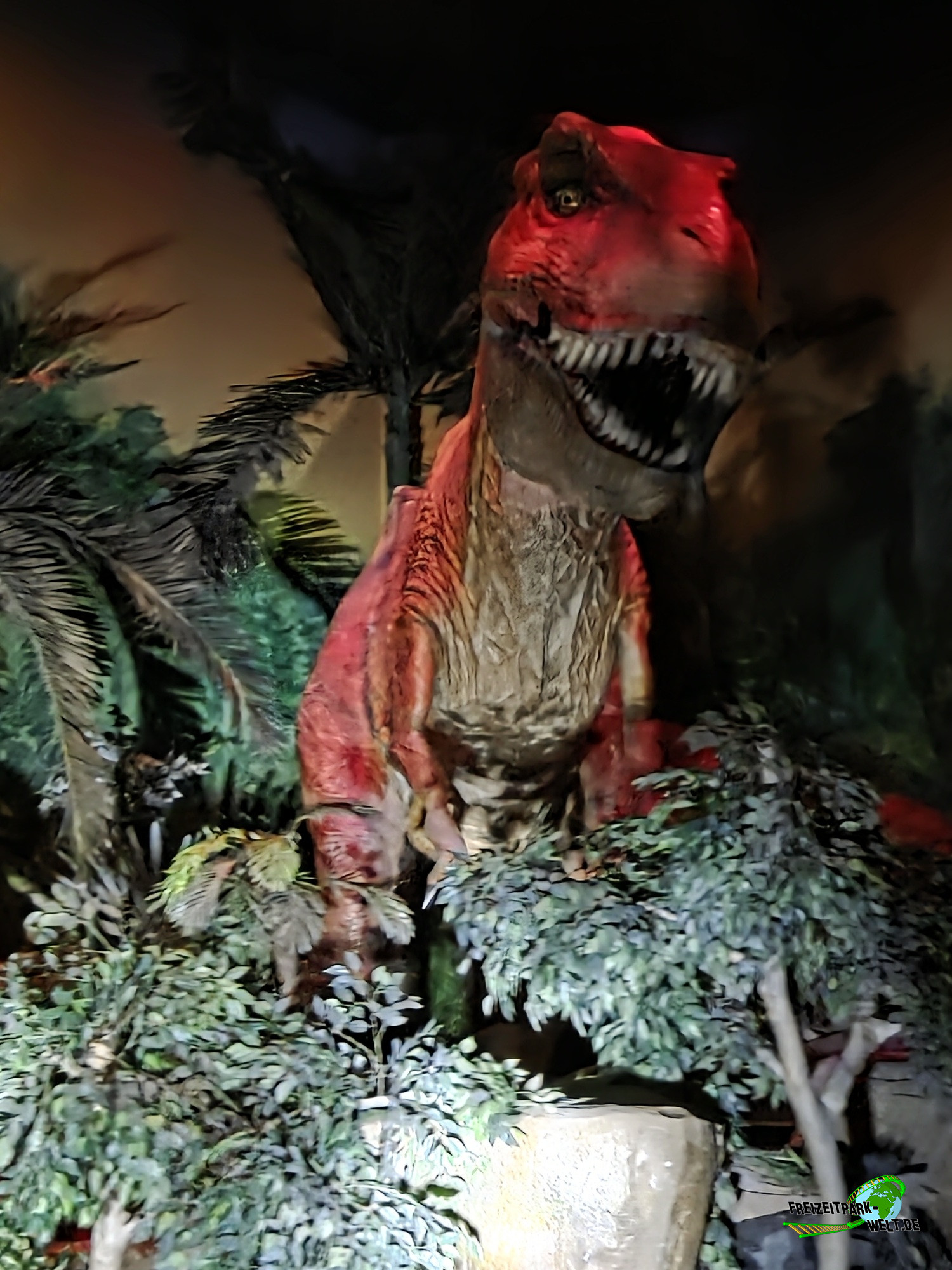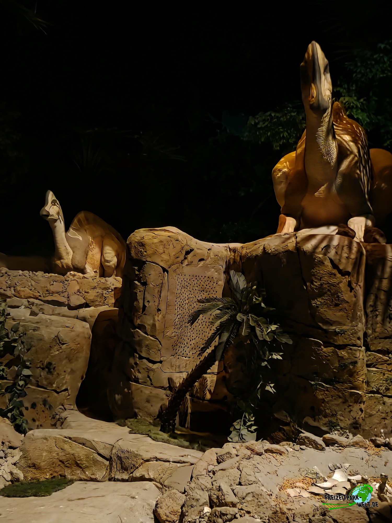 Und wie man schon ahnt wird die nächste Expedition einer der aufregendsten. Man steigt hier nämlich in einen Jeep, der direkt in das Lager der Dinos führt und man dann so einige Bekanntschaft mit unseren Vorfahren macht. Dabei fährt man abwechselnd vorbei an Leinwänden aber in den riesigen Kulissen sind es vor allem Animatronics und reales Theming, das hier zum Einsatz kommt. Die Fahrzeuge bzw. die Motion Based Plattform bewegt sich dabei passend zur gezeigten Bewegung und macht so die Illusion perfekt.