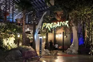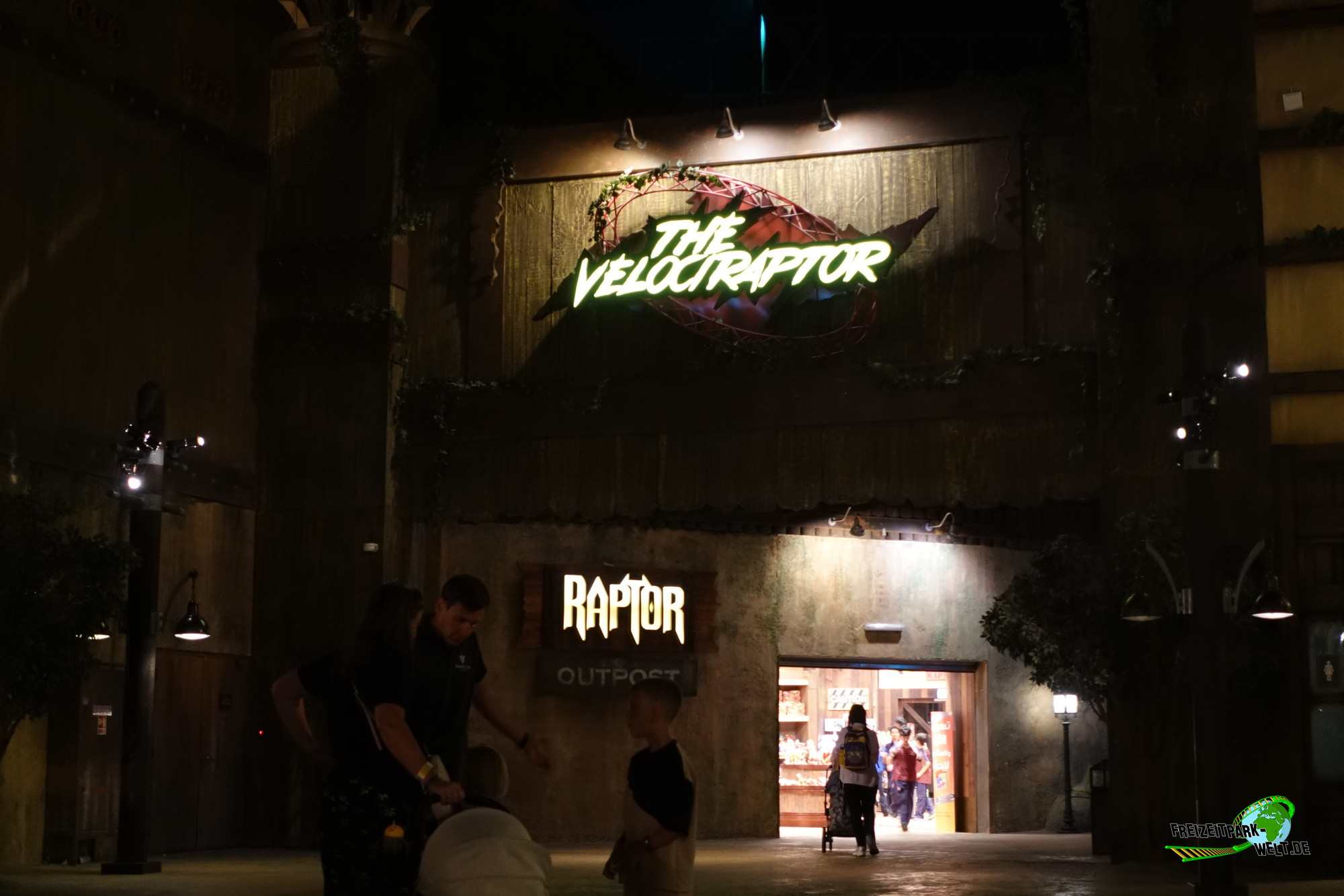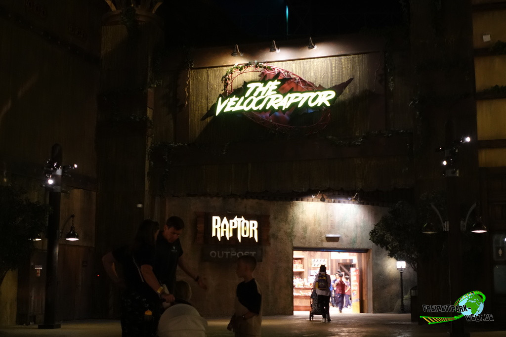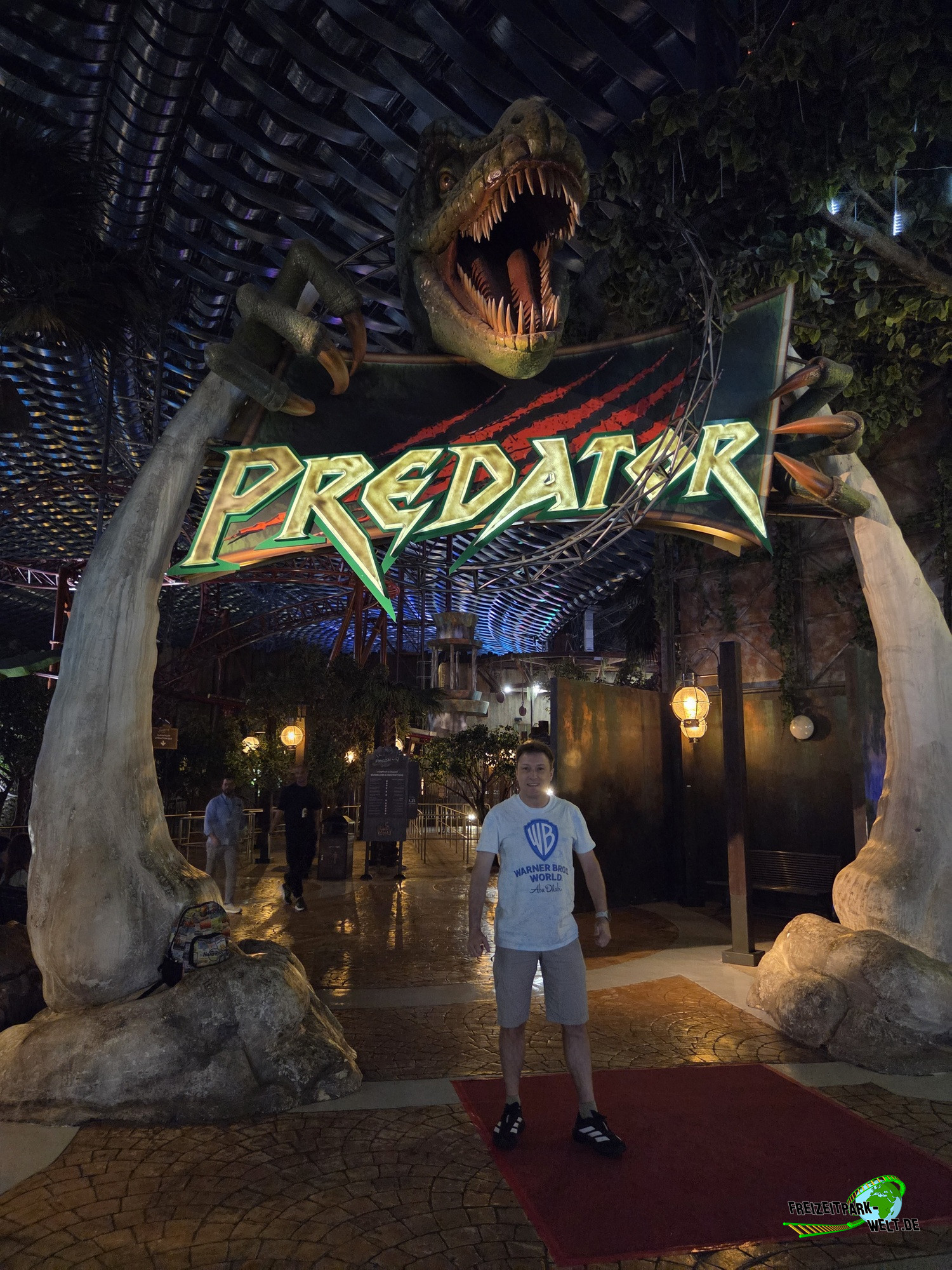 Alleine vorbei durch die kreischenden Teenagermassen ging es dann zum „Predator“ Ein Eurofighter 320+ von Gerstlauer mit 22 m Höhe, 361m Länge und 3 Inversionen. In der Single Rider Line musste ich nur 5 Minuten und schon war ich sogar in der ersten Reihe des Eurofighters. Die Fahrt lässt sich am Besten mit "Kurz und knackig" bezeichnen und im Gegensatz zu Björn Baumann bei seinem Besuch in 2023 spürte ich keine Schlänge während der Fahrt. Mir gefiel die Fahrt sehr gut. Im Gegensatz zum gleich folgendem. Tief im Lost Valley-Themenbereich, am Rande der riesigen Halle, entdeckt man zunächst auf einigen Bannern den Hinweis auf den Velociraptor-Coaster von dem ansonsten nichts in der Halle zu sehen ist. Und tatsächlich wurde nur der kleinste Teil der Achterbahn im Inneren gebaut, nämlich der Einstieg und ein kurzer Dark Ride-Teil, der an einer großen Leinwand zum Stehen kommt. Na? Habt ihr es schon erkannt? Das ist, mit Ausnahme der Leinwand, genau wie beim blue fire Megacoaster im Europa-Park. Und auch alle nachfolgenden Streckenabschnitte sind exakt gleich wie beim Original, letztlich ist Velociraptor also eine exakte Kopie vom Rustschen Vorbild. Doch das allein würde Velociraptor natürlich nicht gerecht werden, denn was in Rust gut funktioniert sollte doch auch in Dubai gut funktionieren, oder doch nicht? 45 Minuten Wartezeit im 1 Zug Betrieb und eine Abfertigung zwischen von mir handgestoppten 5:30 -6:14 Minuten zwischen zwei Zügen, dazu die schon mehrfach erwähnten versuchten Vordrängelaktionen der „Schul-Teenager“. Es war wirklich für mich eine Qual. Die Fahrt hingegen hat mich in keinster Weise enttäuscht. Von der oben angesprochenen Leinwand wird man nach der Begegnung mit einem riesigen Velociraptor in die Wüste geschossen. Zum Glück öffnet sich hierzu im letzten Moment das Rolltor, man schießt durch ein Dino-Maul aus Felsen und dann kommt die gewohnt gute Abfolge aus einer Art Top Hat, dem riesigen Vertikal Looping, Blockbremse und Horse Shoe Roll und dem finalen InlineTwist, der auch hier alle rauswirft, wären dort nicht die bequemen Bügel. Danach geht es dann, wiederum von einem Rolltor geschützt, zurück in die Station. Velociraptor ist die einzige Attraktion in IMG Worlds of Adventure, die die Halle verlässt und den Platz außen nutzt. Das fühlt sich während der Fahrt auch richtig gut an, mal die dunkle Hallendecke zu verlassen und entweder der Wüstensonne oder der Wüstennacht entgegen zu fahren. Auch wenn die Anlage thematisch vielleicht etwas enttäuscht ist Velociraptor ein richtig guter Launch Coaster, der die guten Fahreigenschaften vom MACK Rides Vorbild übernimmt und auch in Dubais Wüste bestens funktioniert.