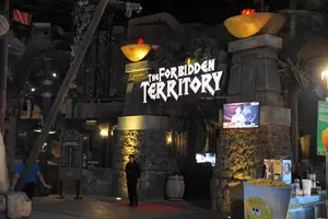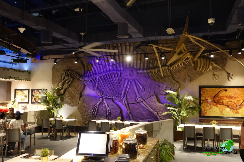 Das sollte sich aber jetzt ändern im Themenbereich Lost Valley. Lost Valley - Dinosaur Adventure: eine Eigenentwicklung der IMG rund um das Thema Dinosaurier, mit elektronisch animierten Dinos und tollen Fahrgeschäften, ein Themenbereich der Extraklasse mit sehr vielen kreischenden und im Vordrängel-Modus befindlichen Teenagern. The Forbidden Territory: Die amerikanische Vorlage von Disney ist klar zu erkennen, denn die Indiana Jones Fahrten im Disneyland Anaheim und in Disneys Animal Kingdom bei „Dinosaurs“ (in wenigen Jahren dann auch dort Indiana Jones) bieten ähnliche Fahrsysteme und Erlebnisse. Durch ein pompöses Eingangstor geht es in eine Art Forschungscamp wo einerseits einige Dinos stehen, andererseits auch viel Forscher-Zeugs wie Lampen, Bücher oder auch Kleidung der Expedition gelagert ist. Und wie man schon ahnt wird die nächste Expedition einer der aufregendsten und das nicht nur, weil ständig Teenager, die 30 Minuten Wartezeit durch ständiges Vordrängeln versuchen zu verkürzen. Aber wir zwei „deutsche Dinoforscher“ blieben standhaft und erwehrten uns allen Versuchen. Nach gut 30 Minuten Wartezeit stiegen wir nämlich in einen Jeep, der direkt in das Lager der Dinos führt und man dann so einige Bekanntschaft mit unseren Vorfahren macht. Dabei fährt man abwechselnd vorbei an Leinwänden aber in den riesigen Kulissen sind es vor allem Animatronics und reales Theming, das hier zum Einsatz kommt. Die Fahrzeuge bzw. die Motion Based Plattform bewegt sich dabei passend zur gezeigten Bewegung und macht so die Illusion perfekt. Insgesamt ist Forbidden Territory eine richtig tolle Attraktion, welche aus unserer Sicht fast an die Originale in den Disneyparks vom Niveau herankommt.