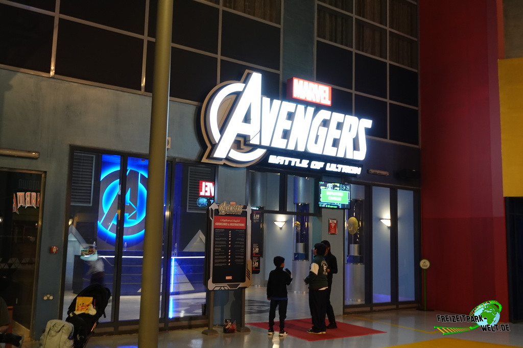 Gegen 15.00 Uhr machten sich zum Glück die ersten Schulklassen wieder auf den Weg „Richtung zu Hause“, so dass wir uns nunmehr zu zweit dem Themenbereich „Marvel“ in Ruhe widmen konnten. Erstklassige Fahrgeschäfte rund um Figuren aus den Marvel Comics (Avengers, Hulk, Spider-Man, Thor), alle mit einer exklusiven Disney-Lizenz für die VAE versehen, warteten auf uns. Spider-Man Doc Ock's Revenge ein Sierra Sidewinder von MACK Rides wirbelt die Gäste auf mehr als 400m mal vorwärts, mal rückwärts über den Parcours, der sich durch viele enge Kurven und einigen kleineren Abfahrten auszeichnet. Durch die recht hohe Geschwindigkeit und der ständig wechselnden Drehung ist das aber durchaus intensiv. Auch Spider-Man Doc Ock's Revenge ist keine Anlage, die für die IMG Worlds eigens designt wurde. Nahezug baugleiche Anlagen gibt es in Knott's Berry Farm und Paultons Park, wobei diese aber komplett im Freien stehen und damit viel offener sind. In der Dubai-Version gibt es hingegen eine kurze Fahrt über den Besucherweg, bevor der Zug in die dahinterliegende Halle eintaucht. Dabei gibt es zwar nicht so viele Effekte, dafür wurde der Lift ganz schön beleuchtet. Die Thematisierung mit den Disney-Lizenzen zeichnet bis in den Wartebereich ein gutes und stimmiges Bild, dann aber hat man bei allen Fahrattraktionen in diesem Themenbereich, den Eindruck, dass dann für Themingelemente auf dem letzten Weg zur Station das „Wüstengeld“ ausgegangen ist.