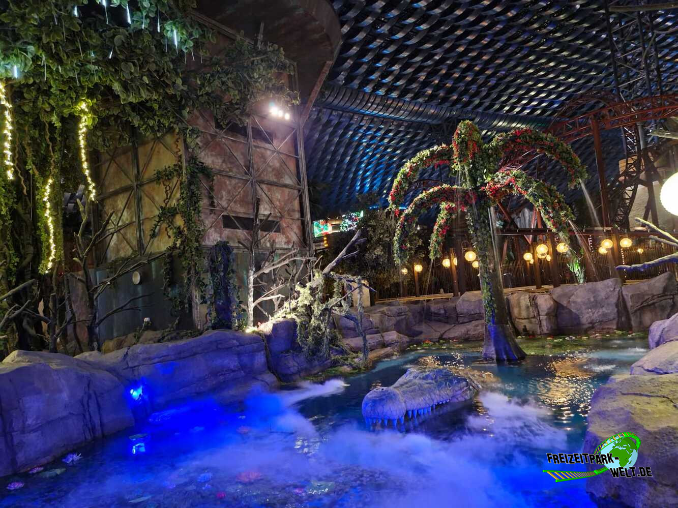Salma von Mayra Tours hatte uns ein schönes kleines Tagestour-Paket mit Transfer (Hin und zurück) und zwei Tickets für die IMG Worlds of Adventure zu einem fairen Preis zusammengeschnürt und so konnten wir Anfang November ohne Stress vom Hotel Towers Rotana die gut 30 km in die Wüste in Angriff nehmen. Nach einer Fahrzeit von gut 30 Minuten erreichten wir den fast komplett verwaisten, riesigen Parkplatz auf dem riesigen IMG Areal, sahen aber schon aus dem rechten Augenwinkel, dass sich 20-30 Schulbusse, wie eine Wüstenkarawane, zum Busparkplatz schlängelten. Es dürfte also voll und laut an diesem Tag im drittgrößten überdachten Freizeitpark der Welt werden und das wurde es auch. Nach der obligatorischen Taschenkontrolle, vorbei an erstklassig aussehenden Dino Animatronics, erreichten wir den imposanten Eingangsbereich und erlebten noch die gut gemachte Eröffnungsshow.