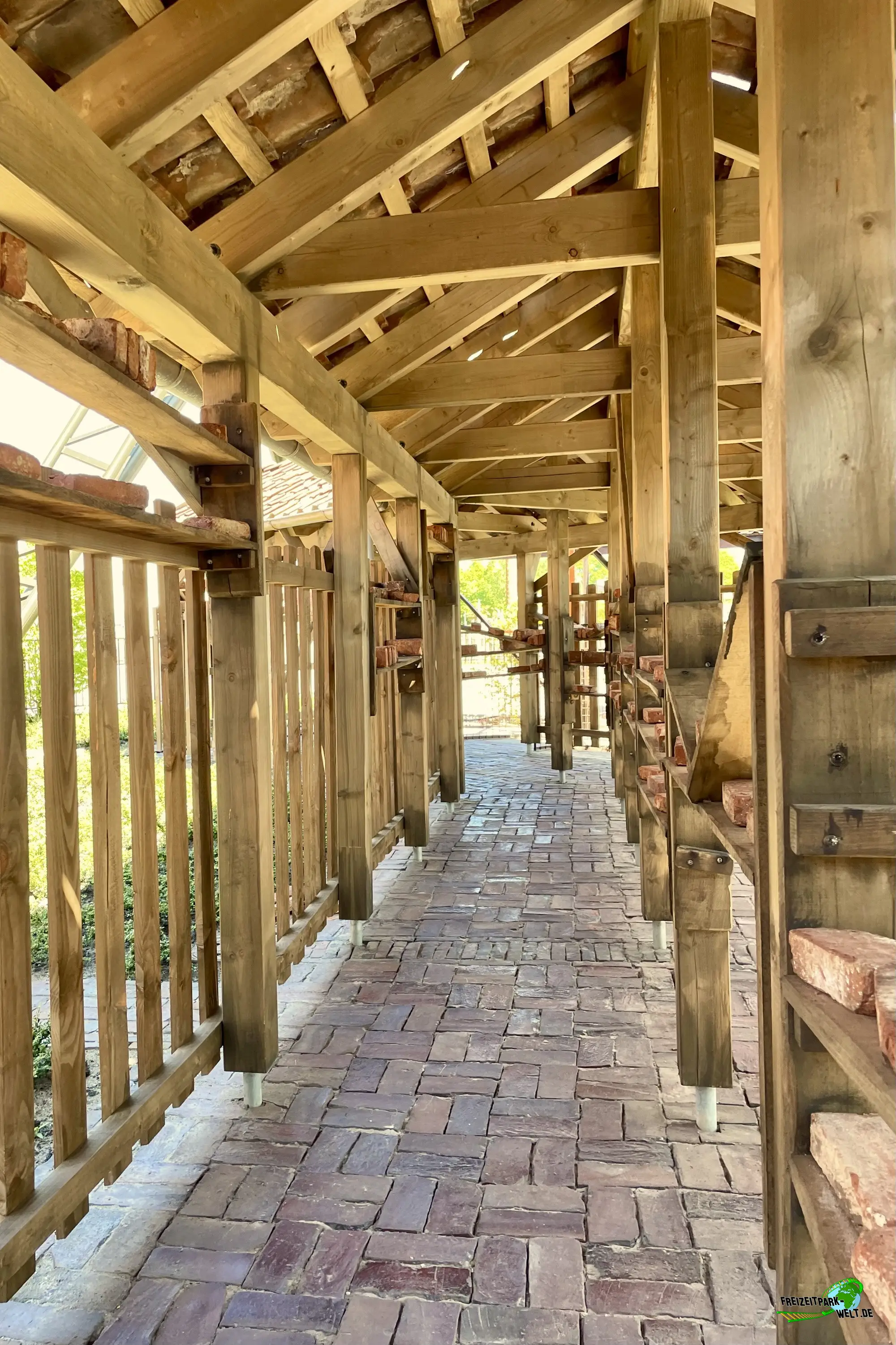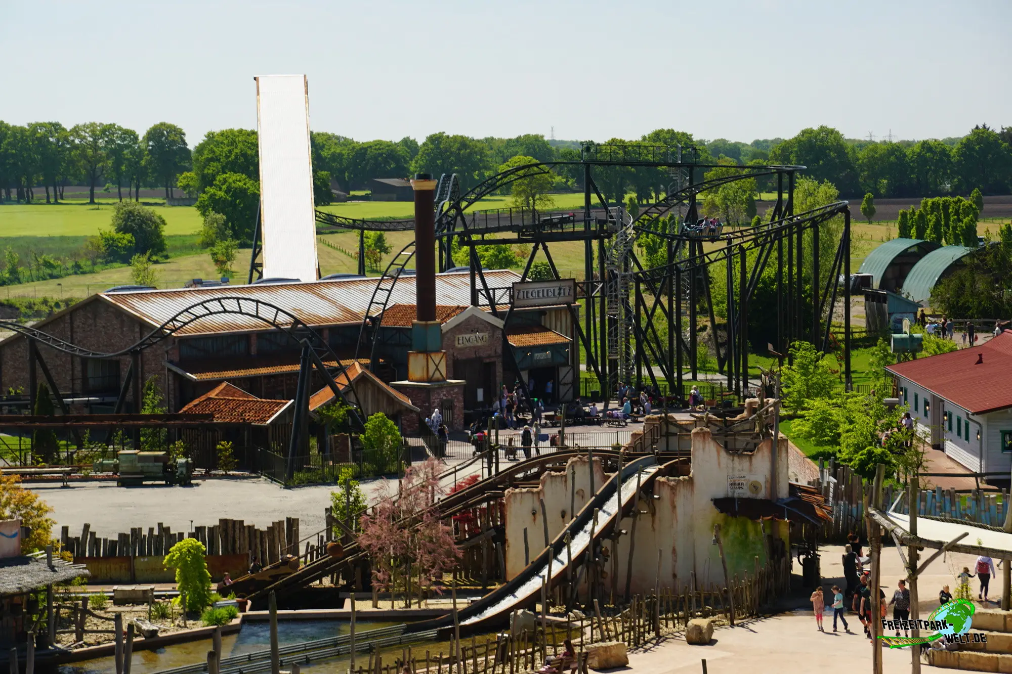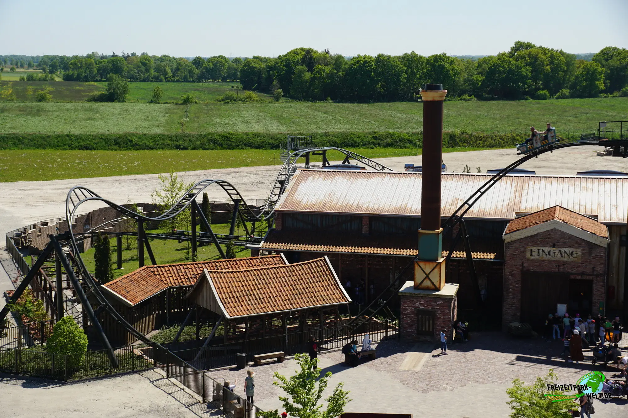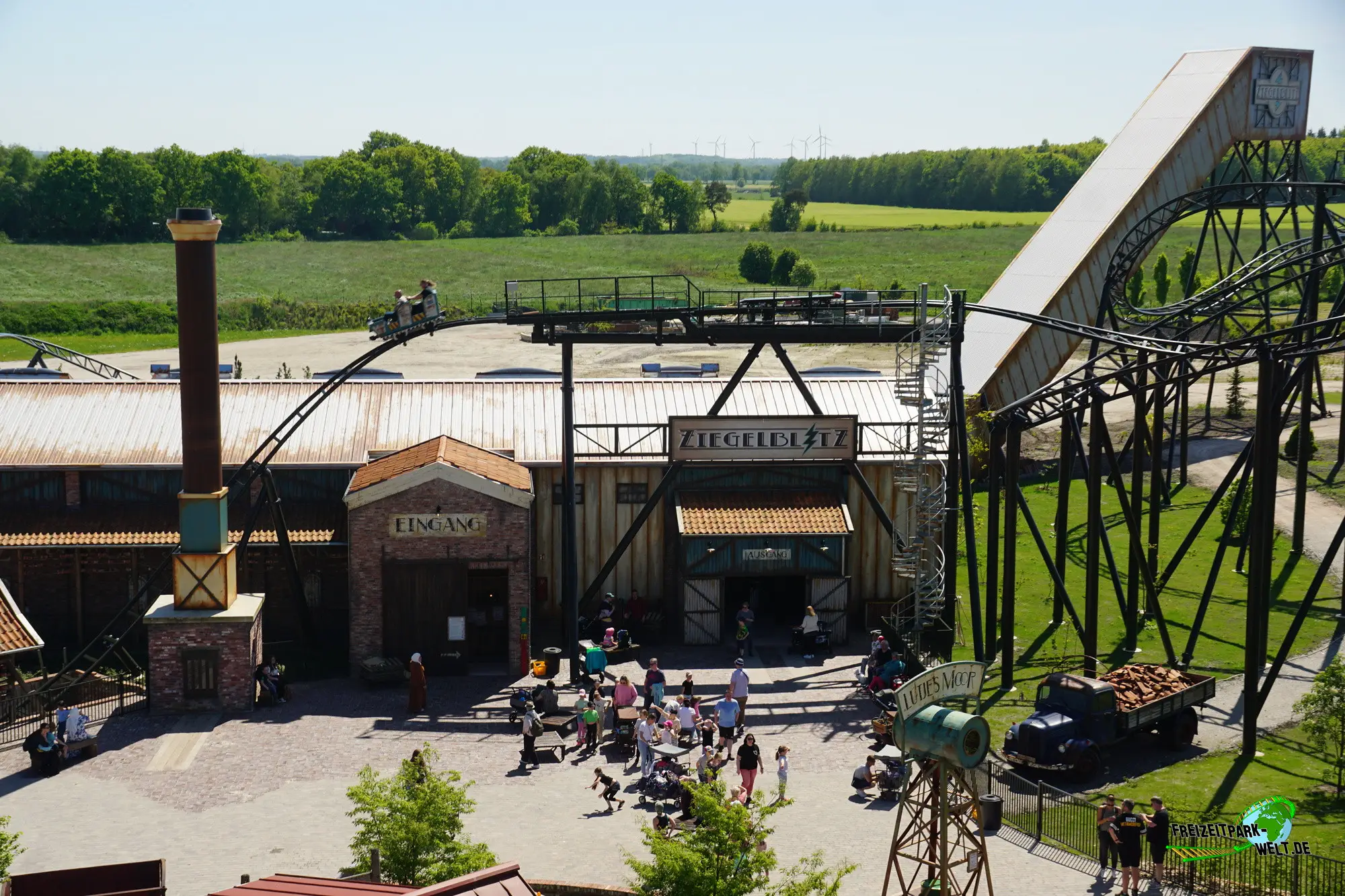 Doch bevor man vom Parkeingang beim Ziegelblitz ankommt ist ein kleiner Fußmarsch angesagt, denn der Ziegelblitz befindet sich im neuen Themenbereich "Lütjes Moor", der sich am Ende des Parks befindet, ganz in der Nähe vom Okavango River. Je näher man dem Ziegelblitz des deutschen Achterbahnbauers Gerstlauer kommt, desto mehr wird klar, dass die Achterbahn für Jaderpark-Verhältnisse richtig groß ist, eben eine richtige Familienachterbahn mit einigen Überraschungen, aber dazu später mehr. Neben der Achterbahn ist es auch die Gestaltung in Form einer alten Ziegelei, die diese Attraktion zu etwas Besonderem macht. Auf dem Vorplatz angekommen sieht man bereits den hohen Schornstein, der sich direkt neben dem Eingang befindet. Und genau an dieser Stelle befindet sich auch einer der interessantesten Abschnitte, denn hier rauscht der Zug vorbei am Schornstein in die Tiefe. Also nicht wie rein in das Abenteuer Ziegelblitz.Story und die tolle Queue