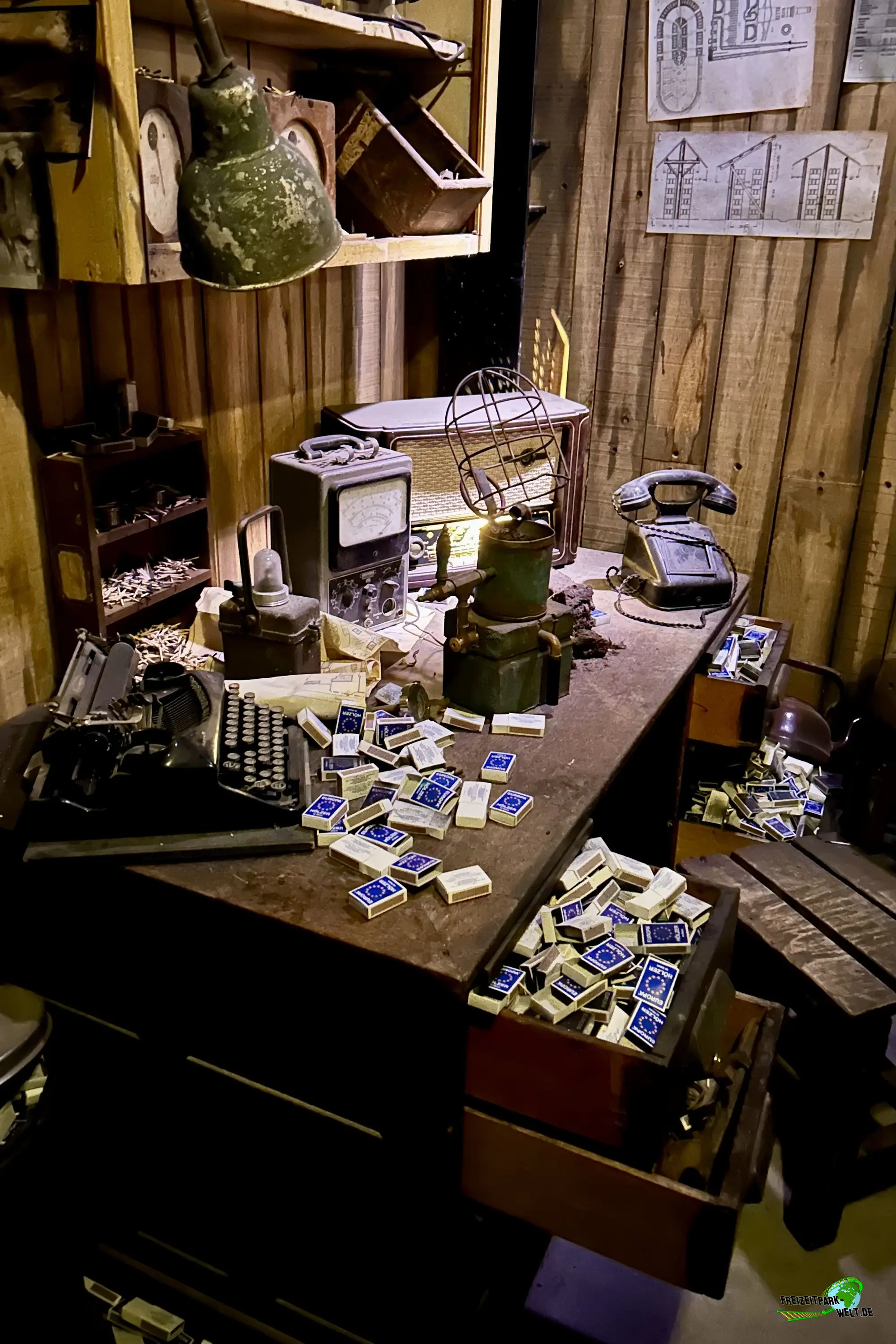 Direkt hinter dem Eingang wartet eine erste kurze Pre-Show wo wir schon mal Kontakt mit der Storyline, über den Arbeiter der Fabrik, aufnehmen. Es herrscht nämlich der Story nach Zündholzknappheit in den Ziegeleien. Doch hier im Jaderpark nicht, denn das kleine, blaue Irrlicht "Lütje" sorgt selbst für die Zündung und sorgt dafür, dass die Produktion weiterlaufen kann. Weiterlaufen wollen wir dann auch und zwar schnell bis in die Station. Die Queue ist ab hier allerdings noch ein ganzes Stückchen lang. Es folgt noch ein Outdoor-Part, der fast komplett überdacht ist und somit auch vor Sonne und Regen schützt. Dann geht es die Treppe hoch in die Indoor-Queue, die dann nochmal die Brennmaschinen zeigt und die Ziegel-Thematik auf die Spitze treibt. Der komplette Bereich ist toll gestaltetet und bietet weitere kurze Pre-Shows mit Licht- und Soundeffekten, die durch die Paderborner Licht- und Sound-Spezialisten von IMAscore umgesetzt wurden. Alles fühlt sich einfach authentisch an, wie in einer echten Ziegelei. Vermutlich, weil hier auch vieles einfach echt ist, wie alle verwendeten Ziegel, die teilweise sogar von älteren Gebäuden "gerettet" wurden.