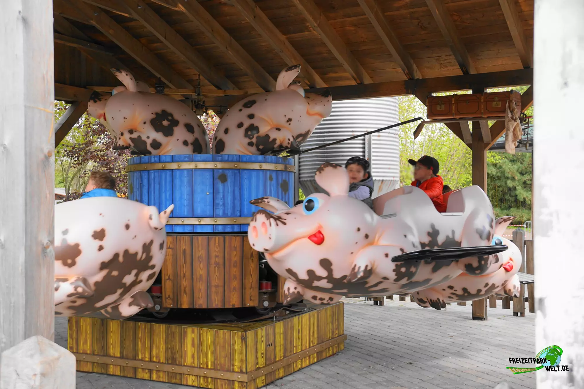 Zentral sind hier direkt nebeneinander die beiden Attraktionen Maibaumdrop und Schweine-Rondell entstanden. Das Schweine-Rondell ist ein überdachtes Karussell in dem man immer wieder auf und abwippt und dabei sogar etwas Bauchkribbeln bekommt. Und das ist sogar nicht nur für Kinder spaßig. Auch das Theming des Stalls und der Gondeln in Form eines Schweins kann sich sehen lassen.