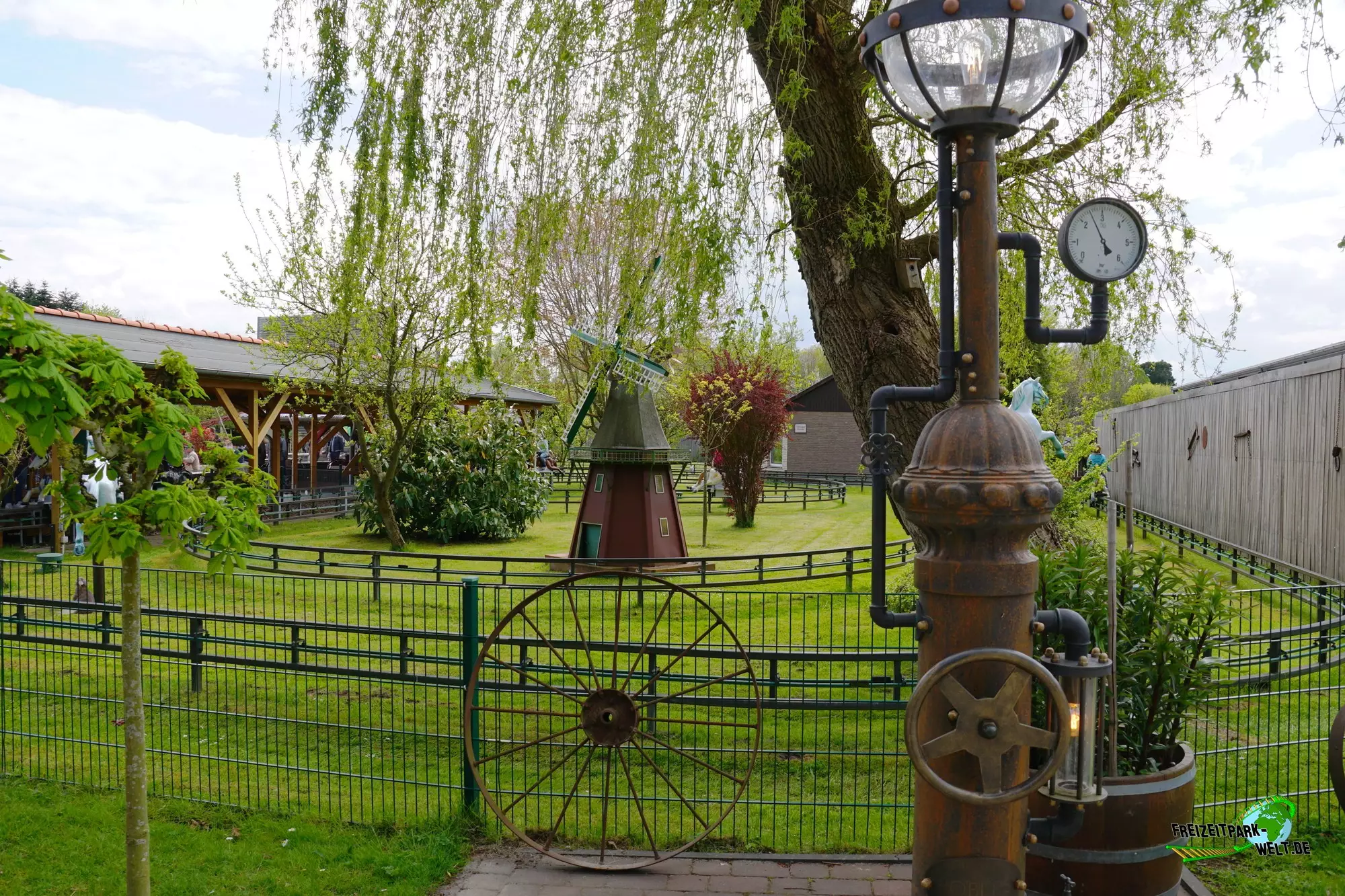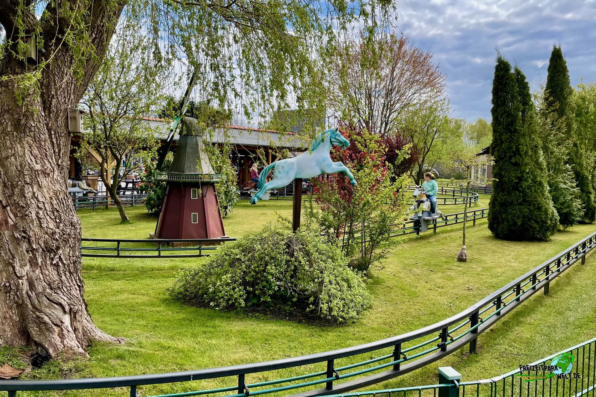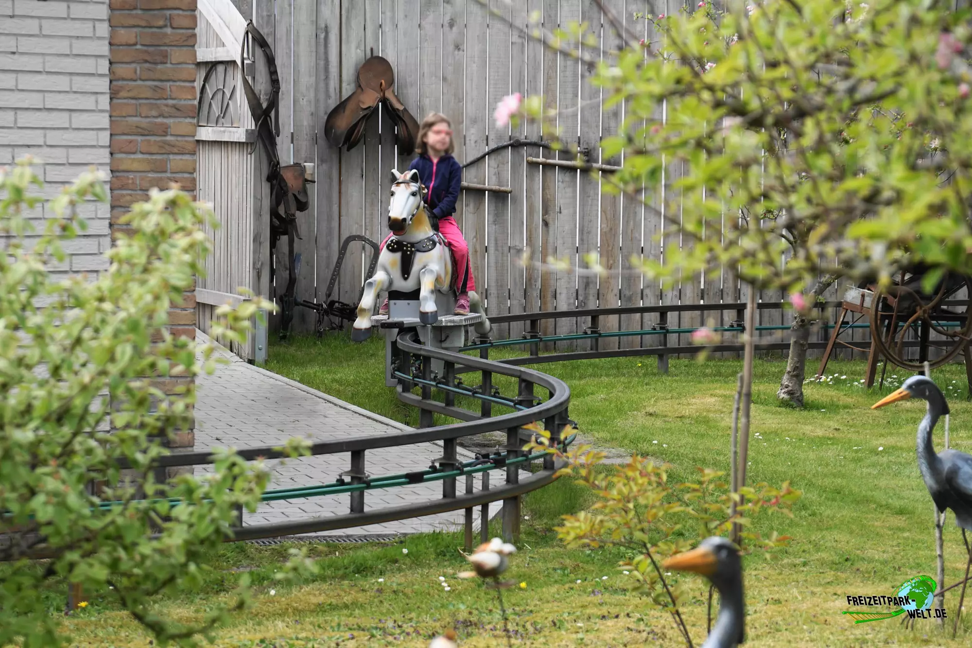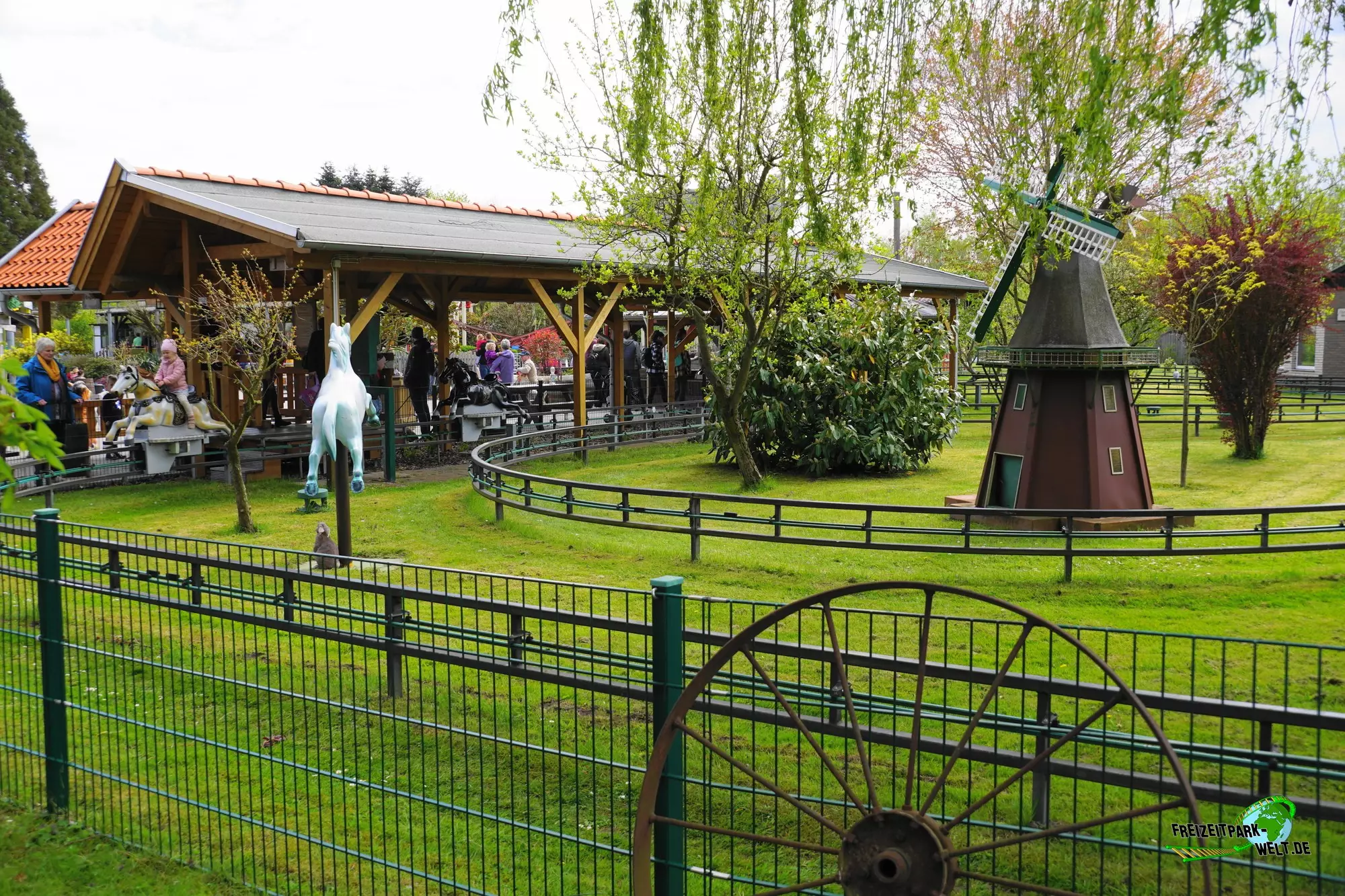 Ganz am Anfang des Freizeitpark-Bereichs steht eine elektrische Pferdereitbahn von Metallbau Emmeln. Auf dem Parcours, der sich an kleinere Kinder richtet fährt man zwischen typisch norddeutscher Windmühle und einigen anderen Deko-Elementen auf der schön angelegten Garten-Anlage.