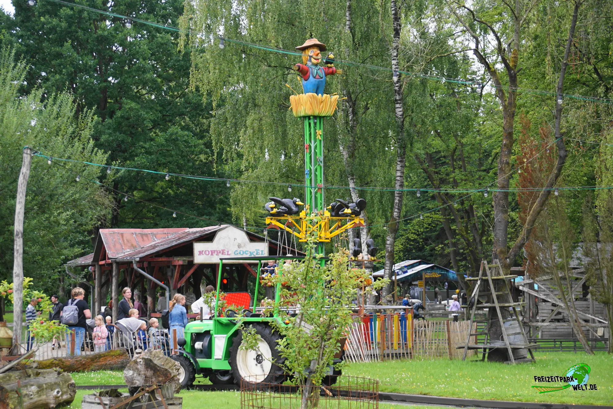Das Kettenkarussel Erwin oder auch Erwin die Vogelscheuche ist ein kleiner Star Flyer für 4 Personen, die hier in ca. 6 Meter Höhe um den Turm kreiseln. Ganz wie bei den großen Pendants fliegt man also mit frei baumelnden Füßen durch die Luft.