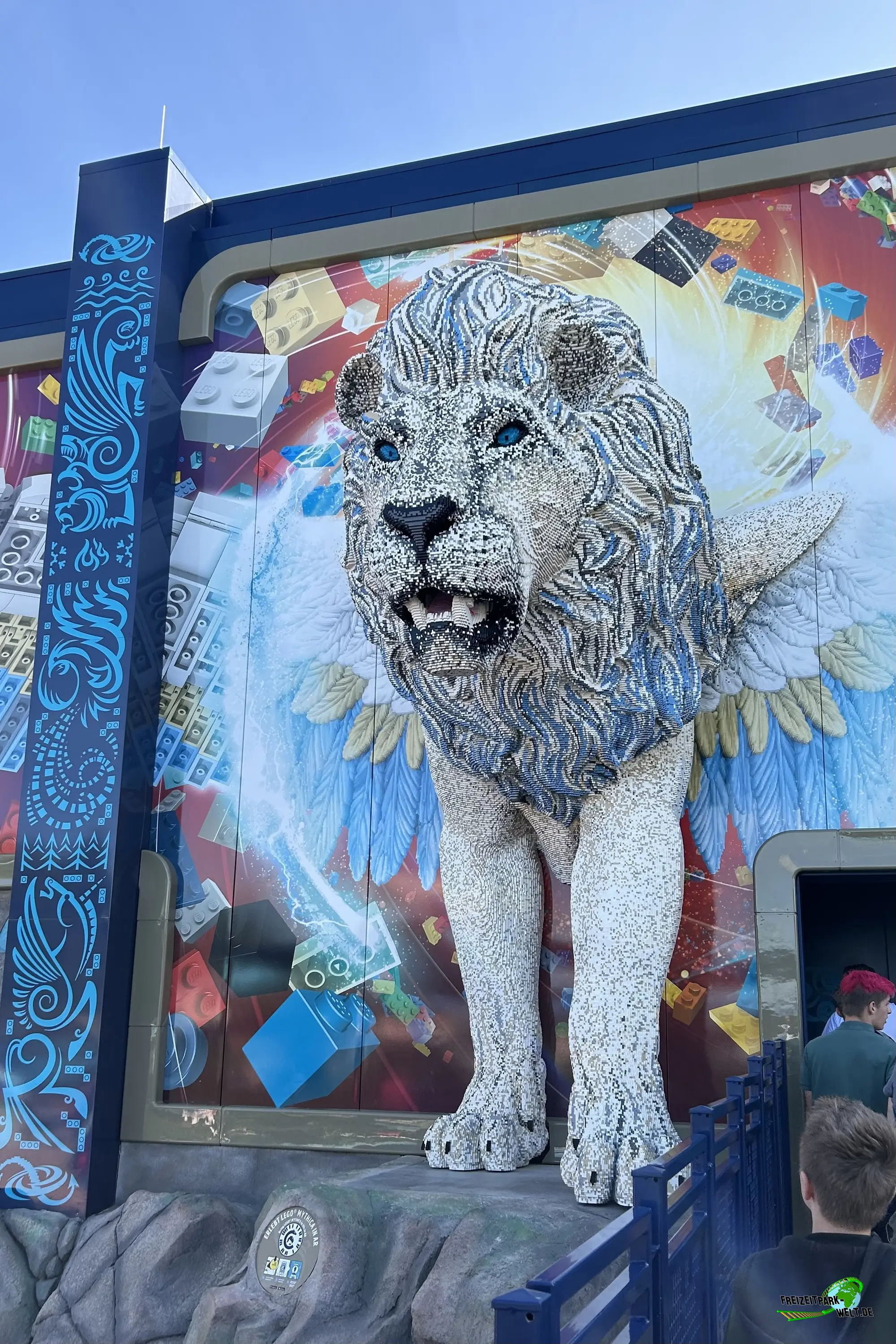 Alles in allem macht gerade der erste Teil mit dem Flat Spin richtig viel Spaß, zum Schluss könnte es dann doch etwas mehr Speed sein. Aber wahrscheinlich wurde genau darauf geachtet, dass Maximus nicht zu schnell ist um möglichst wenig Kinder abzuschrecken. Das hat in jedem Fall funktioniert, denn wie oben schon erwähnt ist Maximus bei unserem Sohn so eingeschlagen, dass wir uns direkt 4 Mal angestellt haben. Apropos anstehen: Die Queue findet im ersten Teil hauptsächlich outdoor statt, später folgen zwei Räume in einem Innenbereich, der allerdings eher kahl ist. Zu sehen gibt es einige Mythica Kreationen in Vitrinen. Doch da Maximus mit 1000 Personen pro Stunde relativ schnell abfertigt (bei zwei Zügen), kommt man hier meisten recht schnell voran. Herausstechendes Highlight in Sachen Thematisierung ist der große Mythica Löwe, den man am Eingang passiert.