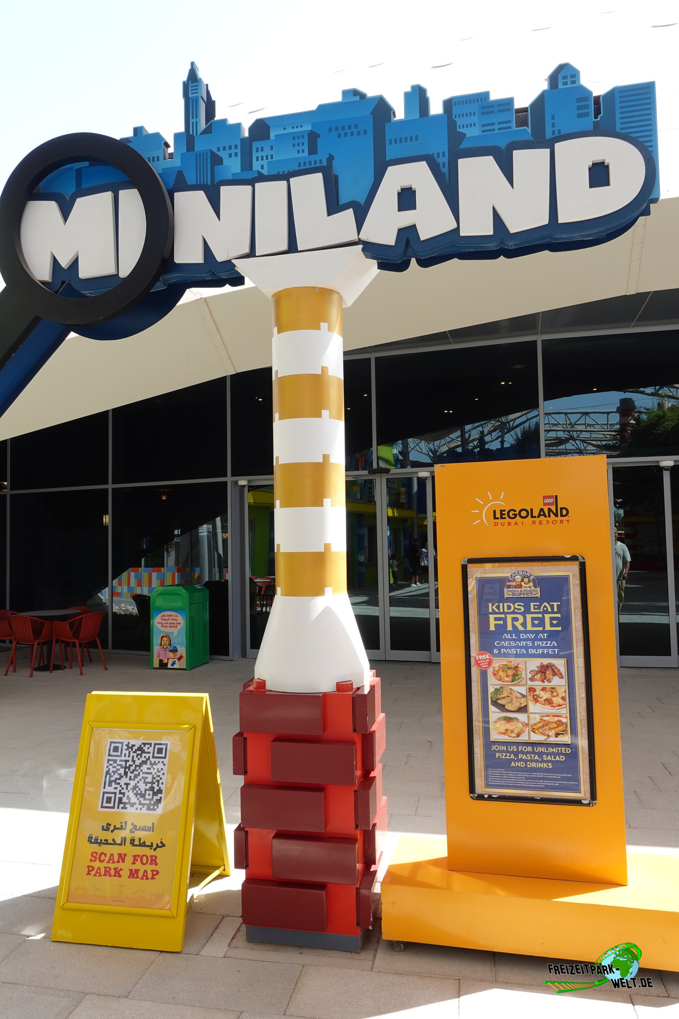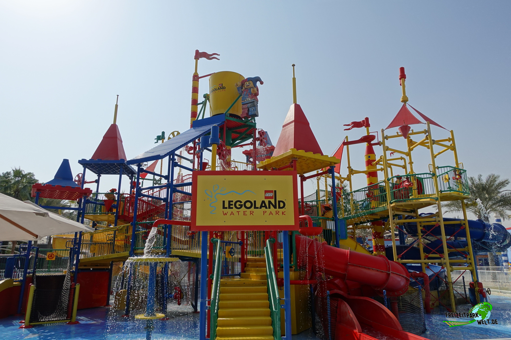 „Splash Out“ konnte ich auch glücklicherweise auch alleine genießen und anschließend das Rutschenparadies „Joker Soaker“ erleben. Da meine bessere Hälfte sich noch auf ihrer Sonnenliege am LEGO® Wave Pool aufhielt, hatte ich mit ihr dann viel Spaß im Wellenbad und im Lazy River „Build-A-Raft River“. Nach ein wenig Erholung unter dem Sonnenschirm bei 32 Grad um 13.00 Uhr zogen wir uns um und erreichten anschließend nach 2 Minuten Fußweg den Eingang zum Legoland Dubai. Papierticket kurz am Eingang scannen und schon ist man im zweiten Legopark in Dubai.