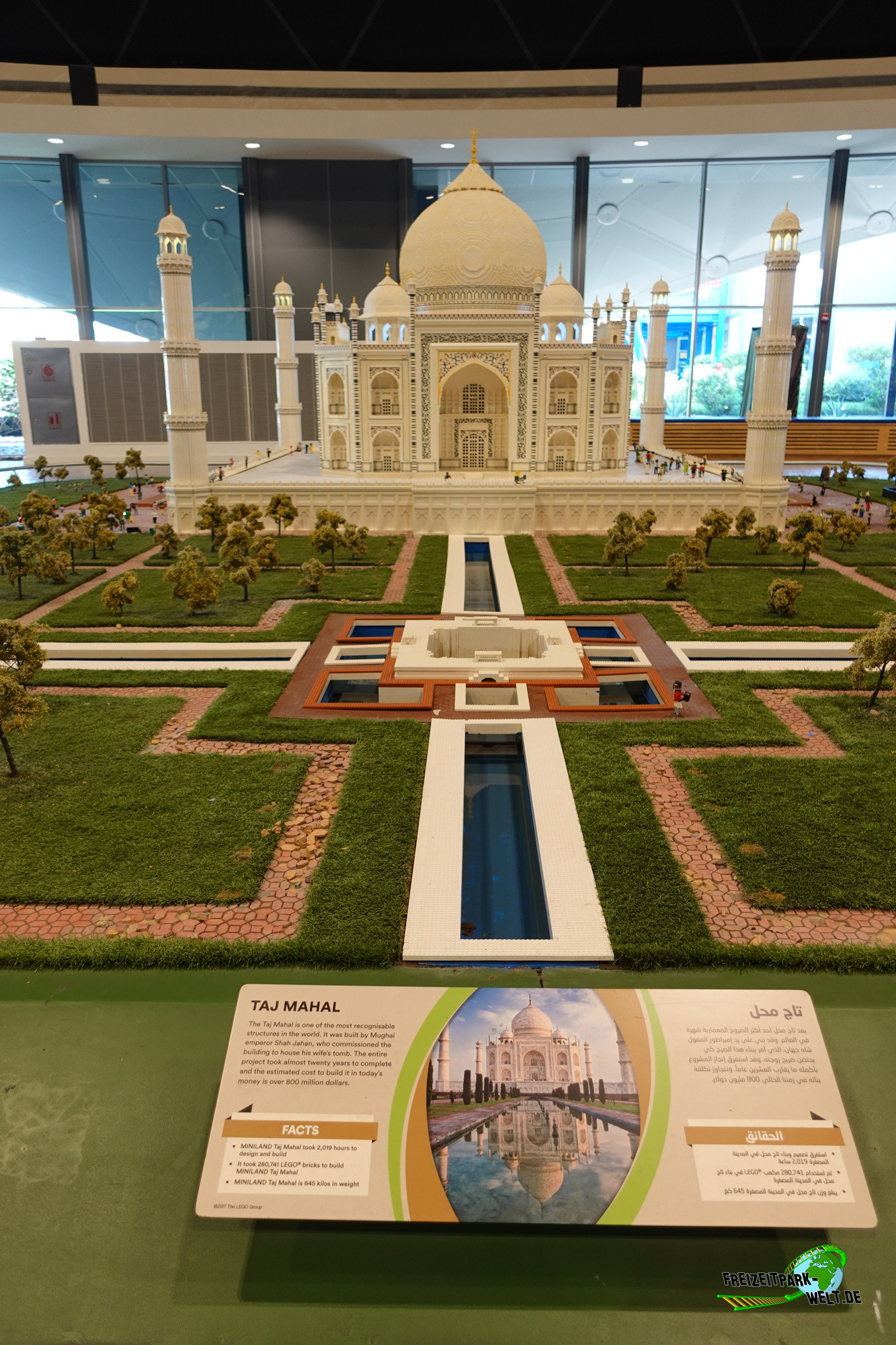 Dort befinden sich: Ten Tallest Buildings (Die zehn höchsten Gebäude der Welt) mit Burj Khalifa, Shanghai Tower, Abraj Al-Bait Clock Tower, Ping An Finance Center, Lotte World Tower, One World Trade Center, Chow Tai Fook Centre, Tianjin Chow Tai Fook Binhai Center, China Zun und Taipei 101. Die kleine Weltreise begann in Ägypten mit den Pyramiden von Gizeh und der großen Sphinx von Gizeh. Im Irak ging es nach Babylon mit den hängenden Gärten der Semiramis. In Indien konnten man den Taj Mahal in Legosteinen bestaunen und „in Groß“ gut 500 Meter weiter neben der Real Madrid World. In Jordanien ging es nach Petra der antiken Felsenstadt. Den größten Bereich bildeten natürlich die Vereinigten Arabischen Emirate mit Dubai: Skyline der Stadt Dubai, Flughafen Dubai, Khor Dubai, Dubai Marina, Dubai Metro, Mall of The Emirates und Abu Dhabi mit der Scheich-Zayid-Moschee.
