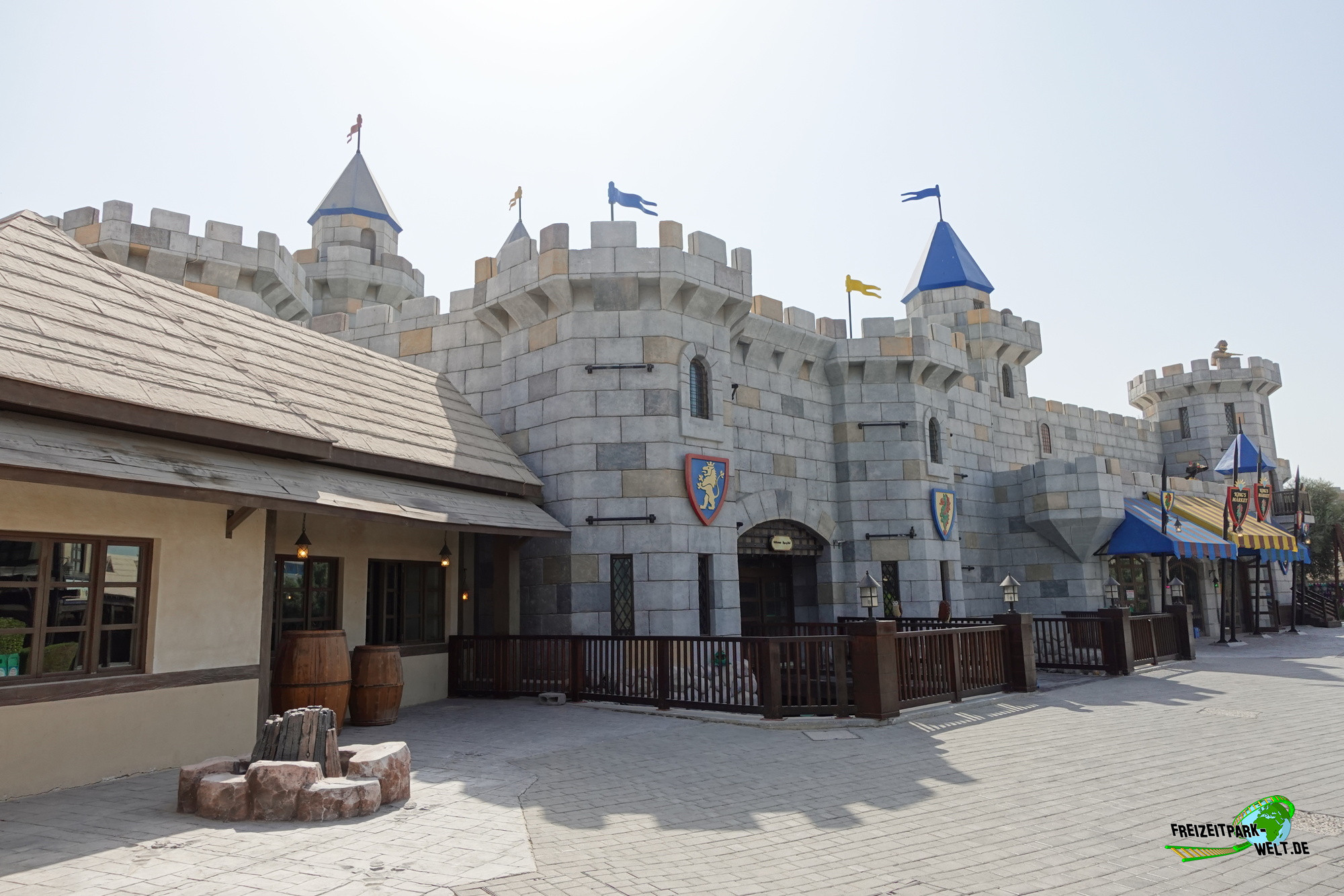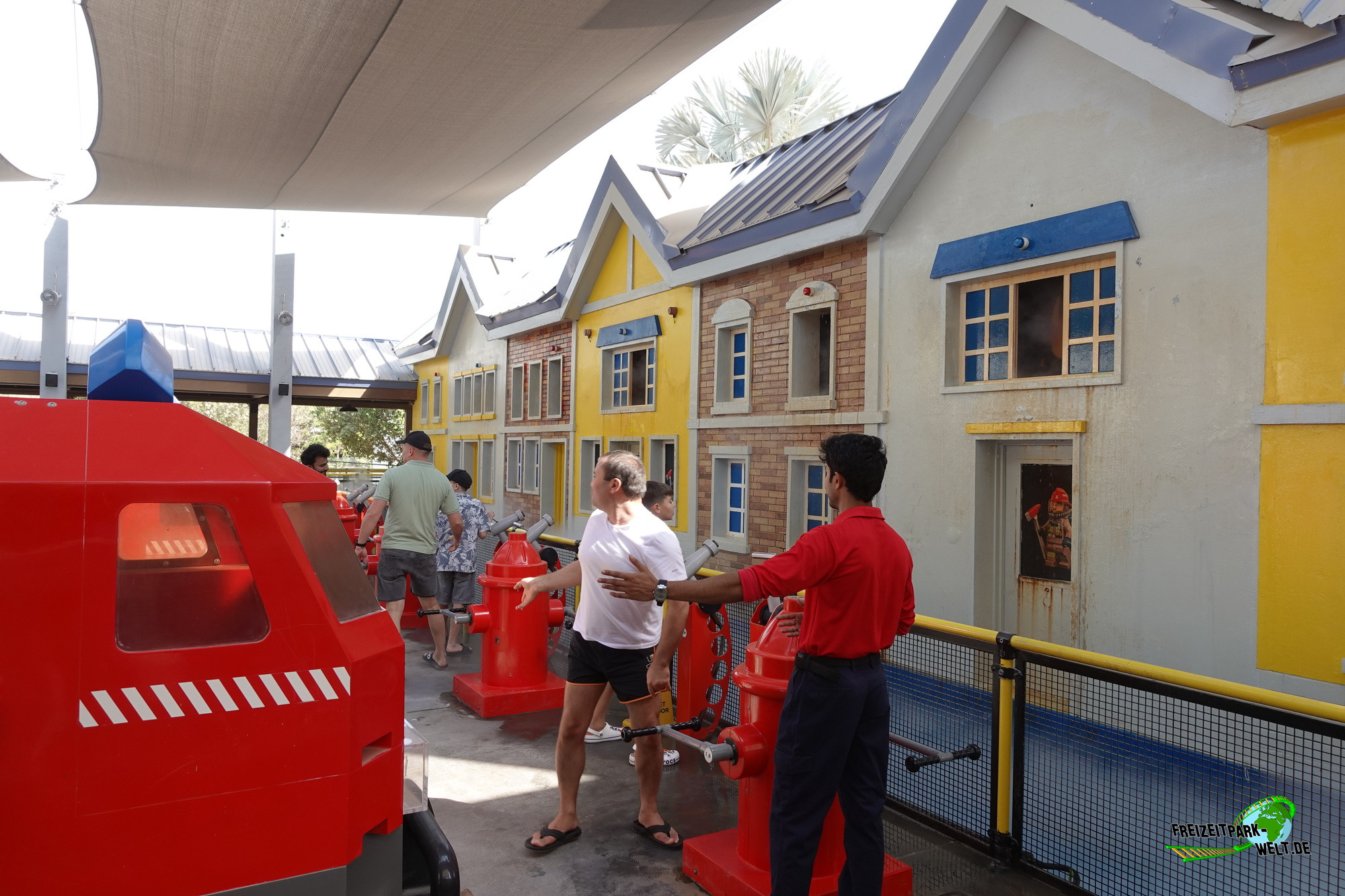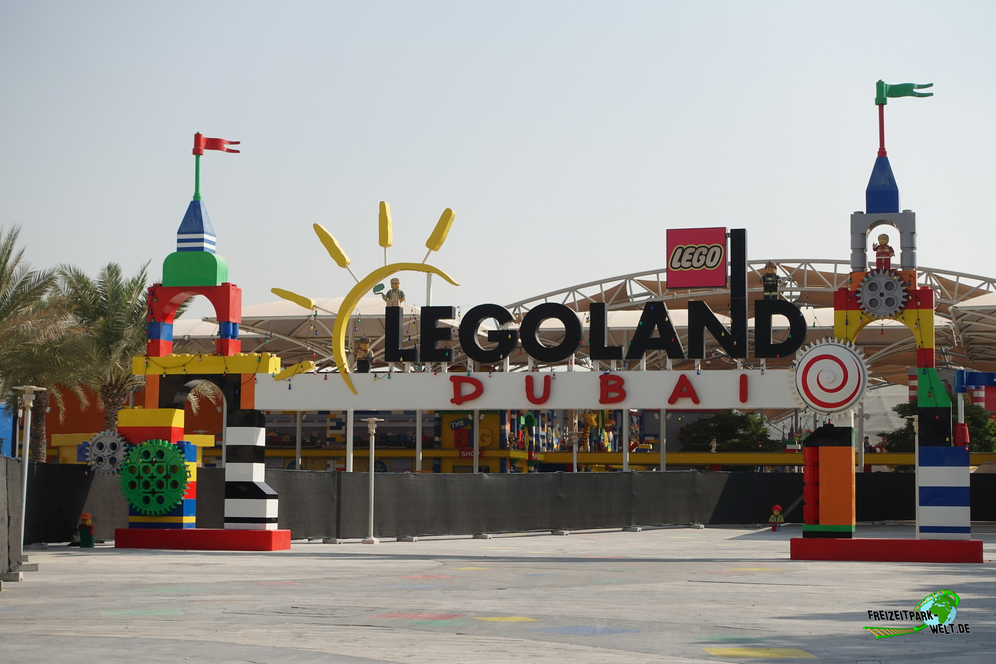 Um 9.30 Uhr machten wir uns vom Lapita-Hotel auf den 8 Minuten langen Fußweg durch das Riverland hindurch zum Legoland Wasserpark, genauer gesagt zum Wasserpark-Shop, wo wir uns zwei Legoland Dubai Resort Badetücher zu sehr erschwinglichen Preisen kauften (umgerechnet 16,50 Euro pro großem Badetuch). Anschließend wurde die Taschenkontrolle durchgeführt und dann ging es in den Eingangsbereich zum Ticket scannen.