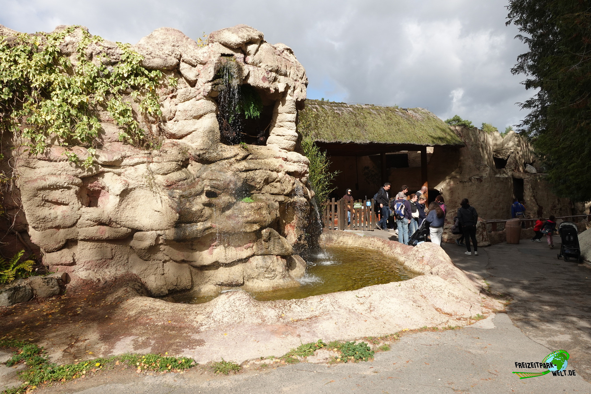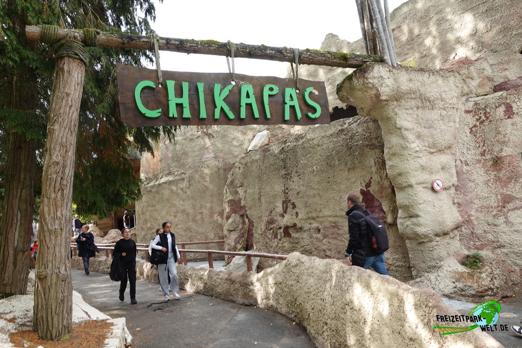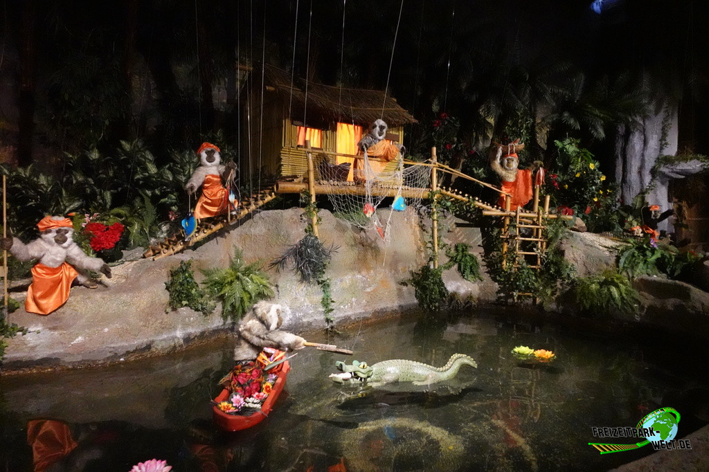Dabei kann man den "Dschungel der Chikapas" leicht übersehen, denn die unscheinbare Fassade des Geschäfts lässt kaum erahnen, dass es sich hierbei um eine ausgewachsene Themenfahrt handeln könnte. Stattdessen überwiegen beige Betonfarben, einige (im Jahr 2016 schon ziemlich heruntergekommene) Felsen und ein Affe, der sozusagen als einziger Hinweis dient. Bei genauerem Hinsehen erkennt man aber eine Station, die sich sogar in einem Außenbereich befindet und damit hin und wieder einen Blick auf ein- und aussteigende Gäste freigibt. Auch die Queue ist ziemlich schmal und merkwürdig geraten.Doch sobald man Platz genommen hat, verfliegt die Skepsis schnell, denn aus dem Außenbereich geht es direkt in eine Höhle, die sehr schön beleuchtet ist und nur wenige Augenblicke später in ein Dorf voller Affen führt. Langsam gleiten die Boote an zahlreichen (insgesamt sollen es 300 Affen sein) Affen vorbei, wobei hier insbesondere die Technik sehr bemerkenswert ist. Die Affen bewegen sich nicht mit Druckluft oder mechanisch, sondern werden wie im Puppentheater über lange Fäden bewegt. Über Drehscheiben an der Decke werden die Fäden dann gespannt bzw. entlastet und setzen die Affen in Bewegung. In jedem Fall eine Technik die gut zu funktionieren scheint, denn an unserem Besuchstag konnten hier keine größeren Mängel festgestellt werden. Sowieso ist es faszinierend wie so viele Fäden die Szenerie in Bewegung versetzen. Und Szenen gibt es durchaus viele. Über die anfängliche Fahrt durch ein Dorf, vorbei an einen kleinen Dschungel bis hin zu einem Tempel und einer Grotte ist so ziemlich alles dabei, was man in einem Affendschungel erwartet. Und mit 6-7 Minuten ist die Fahrt sogar durchaus lang.