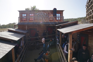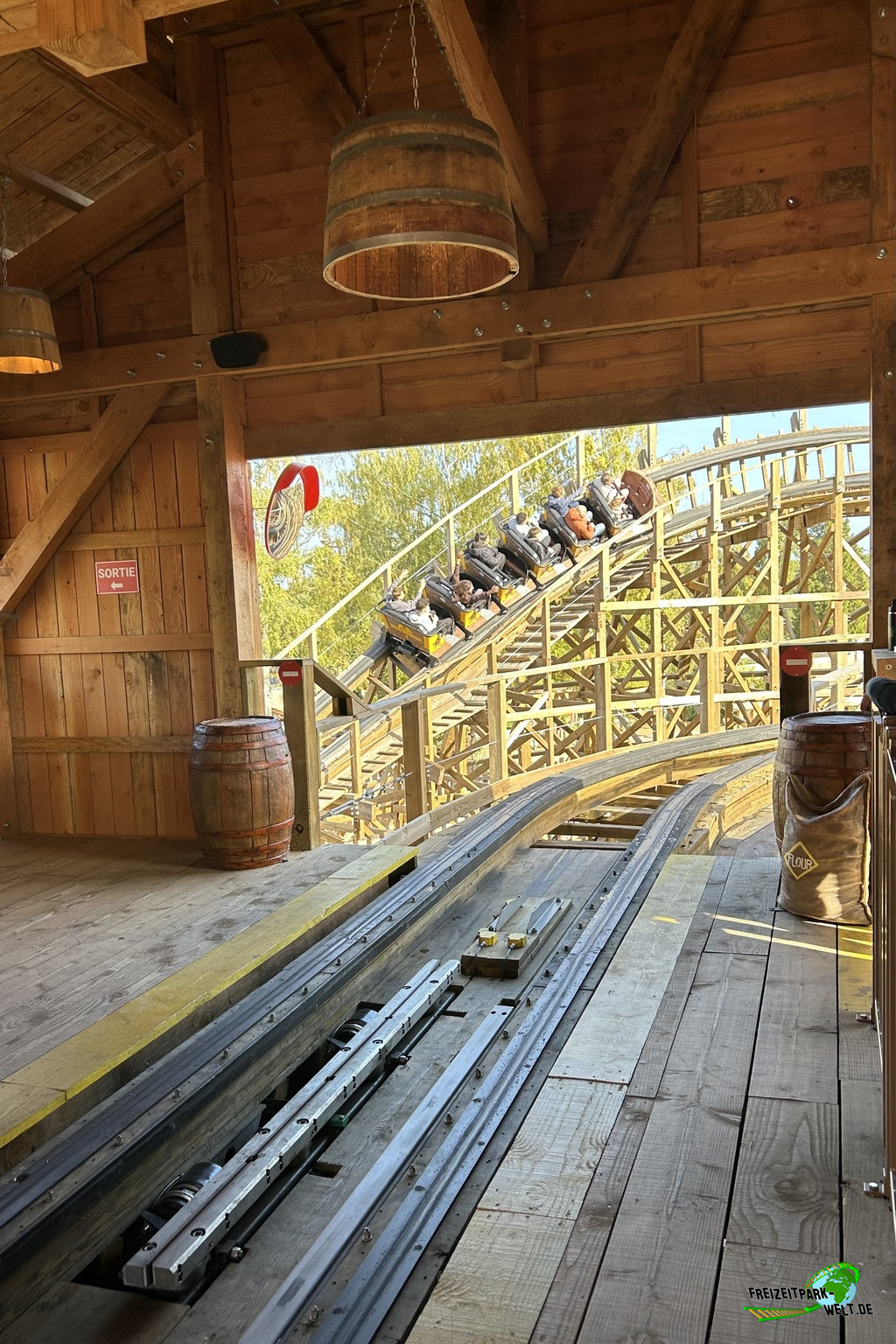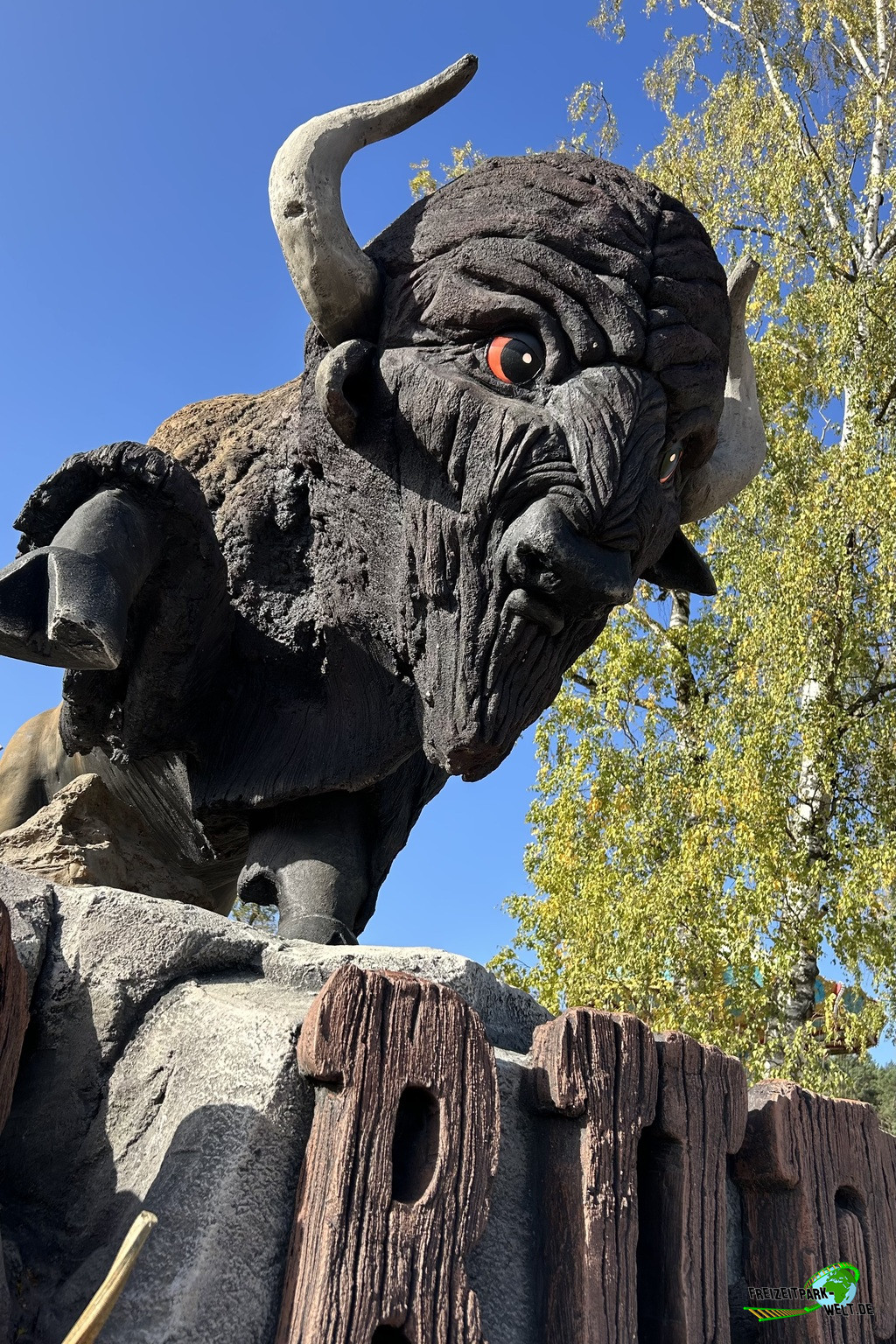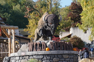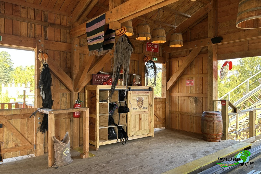 Doch auch das Zielpublikum sollte natürlich beachtet werden und das sind hier, nur wenige Kilometer vom Parc Astérix entfernt, vor allem Familien mit Kinder, die vielleicht nicht in den großen Rivalen nebenan möchten. So lag es nah den Wild Buffalo auch als Familienachterbahn zu gestalten und in Größe und Form etwas moderater zu designen. Und genau das ist bei Wild Buffalo passiert. Die reinen Zahlen sind nicht spektakulär (500m Länge, 15m Höhe), aber trotz seiner geringen Größe ist Wild Buffalo ein wahrer GCI-Coaster, der es mühelos mit den großen Namen seiner Bruder aufnehmen kann.Der Eingang zur Anlage wird durch eine tolle Eingangsstatue symbolisiert, die den Weg in die Holzstruktur zeigt. Die Warteschlange befindet sich nämlich im Inneren in einer angedeuteten Westernstadt, die überdachten Schutz vor Regen bietet. Fahrbar ist Wild Buffalo bereits ab einer Körpergröße von 1,10m in Begleitung eines Erwachsenen. Allein steigt man ab 1,30m in den kurzen Millenium Flyer Zug. Das Theming in der Queue ist dezent, verfügt aber über einige Ansätze mit Westernbezug und zur Halloween-Zeit befanden sich hier auch einige gruselige Details. Witzig sind die Emotionen des Stiers, die hier schön visualisiert wurden und zum Schmunzeln anregen. Über eine Treppe erreicht man dann das Stationsniveau und landet auch direkt in der Station.