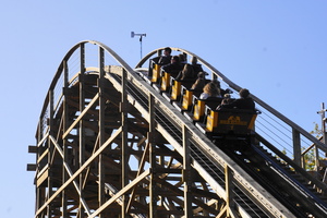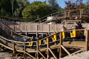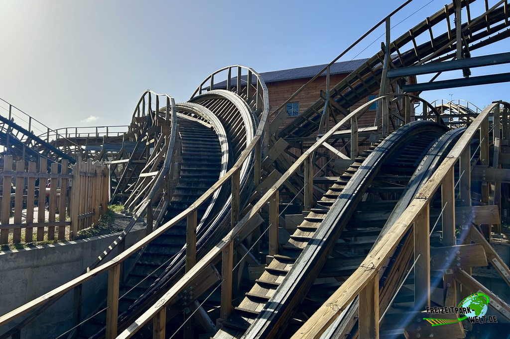 Die Züge sind recht kurz mit 6 Reihen á zwei Personen. Keine zusätzlichen Gurte verzögern den Einstieg, allein der Beckenbügel ist ausreichend. Geschwind geht es dann in den Pre-Lift Drop bevor uns ein Kettenlift recht langsam die 15m Höhe hinauf zieht. Hier blickt man direkt ins Wüstenmeer bevor eine 180 Grad Kurve wieder den Blick in Richtung Station und vor allem den süßen, kleinen aber intensiven First Drop lenkt. Nicht zu wild aber für die Größe ein doch recht überraschender First Drop. Es folgt ein Camelback auf Höhe der Station bevor eine Linkskurve den Weg in das Kurvenlabyrinth bahnt. Der Mittelteil ist nämlich trotz der geringen Größe sehr verwirrend durch zahlreiche Kurven, Tunnel und praktisch vor jeder Kurve ein typischer GCI-Hopser. Es geht also zunächst links in einen tiefen Tunnel, man umfährt die Wartungshalle der Achterbahn, bevor man eng vorbei am Gebäuder wieder aus der anderen Richtung in den Tunnel einfährt, unterquert noch einmal die Holzstruktur und taucht dann am anderen Ende in einer steilen Rechtskurve wieder auf und landet in der Abschlussbremse.