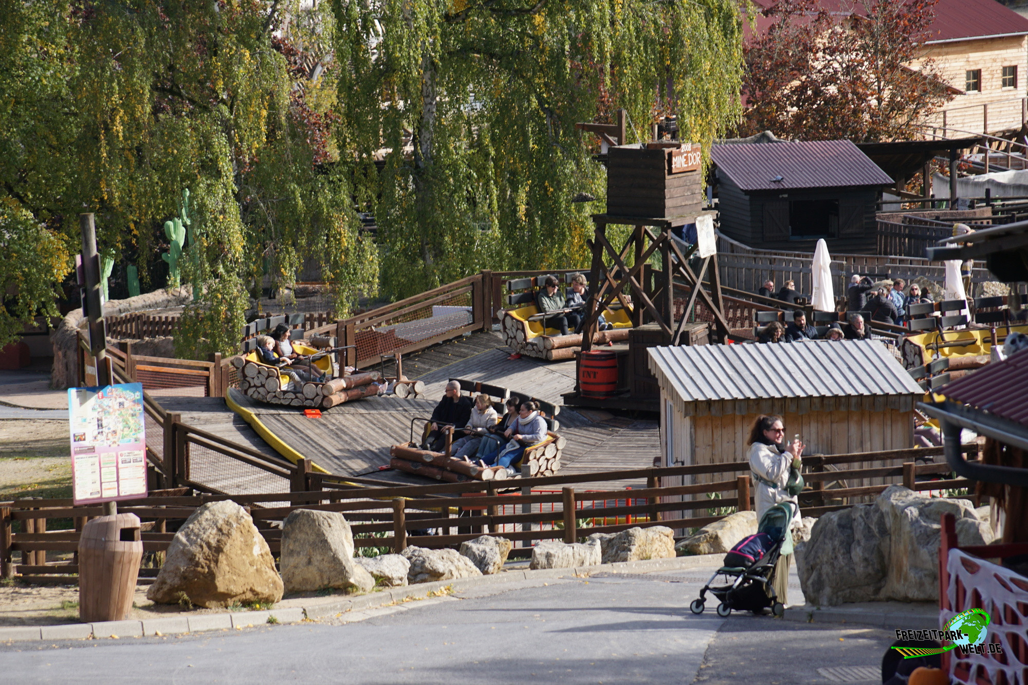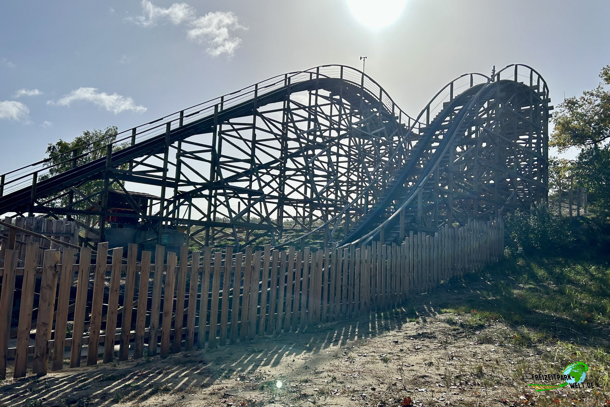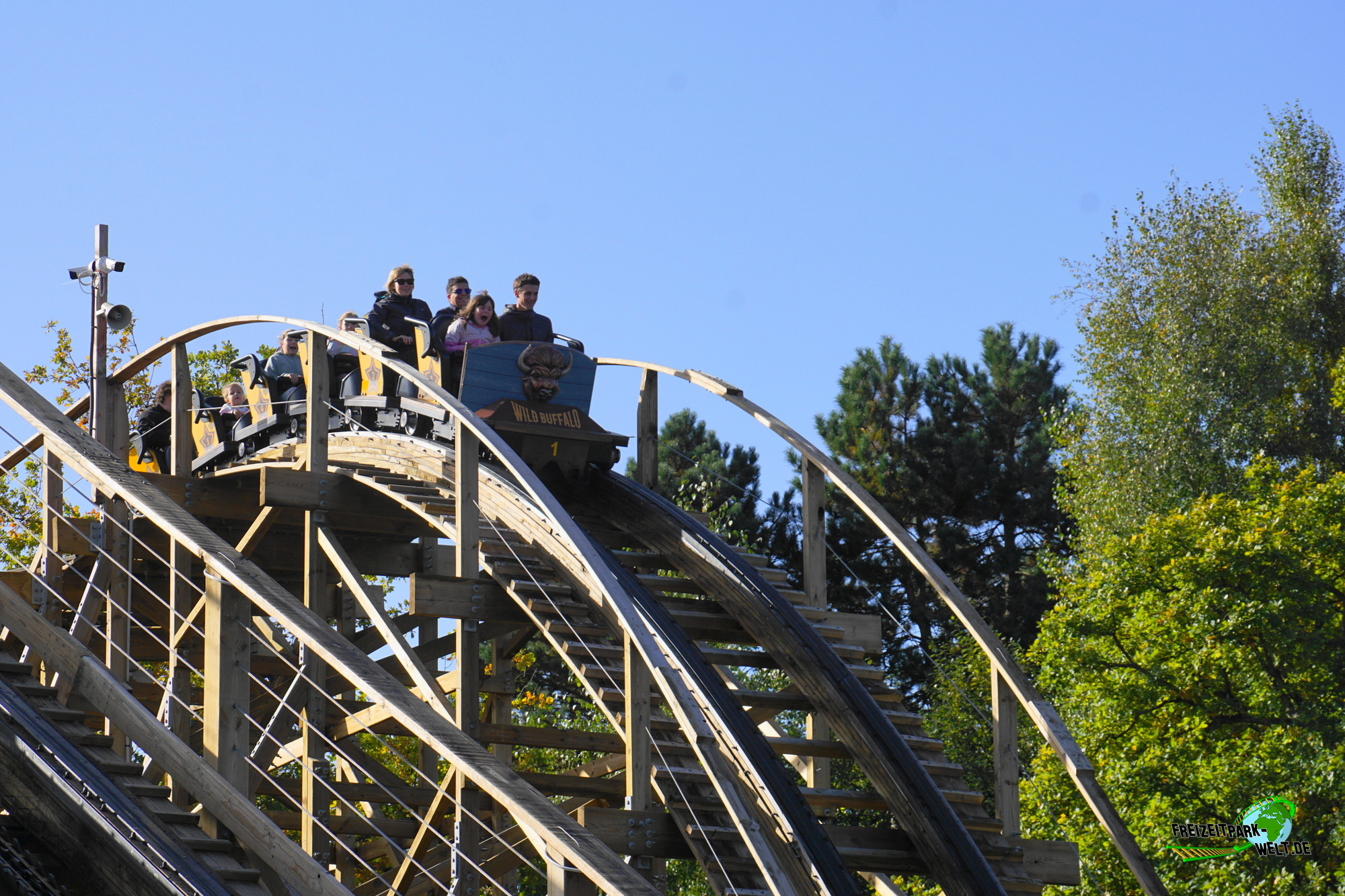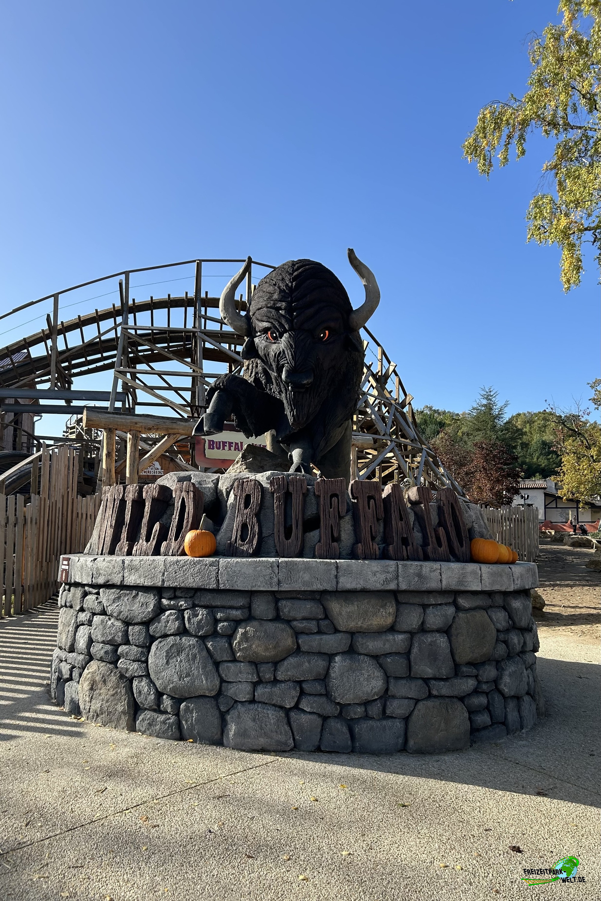Nach dem sich unsere vier Abenteurer vorbei an den düsteren Gestalten im Eingangsbereich vorbeigeschlängelt hatten, ging es zu Buffalo'Ween (Wild Buffalo) Das gesamte Areal dieser am 26.04.2025 eröffneten Holzachterbahn des amerikanischen Herstellers Great Coasters International (GCI) war „Halloween-mäßig“ geschmückt und bot einen erstklassigen Augenschmaus Die von Skyline Design entworfene, 500,8 m lange Bahn erreicht eine Höhe von 14,8 m, wobei der totale Höhenunterschied 22,6 m beträgt Bei einer Fahrtzeit von 1:20 Min erreichen die Fahrgäste eine Höchstgeschwindigkeit von 67 km/h und durchfahren einen 40 m langen Tunnel An unserem Besuchstag mussten wir kurz vor 11.00 Uhr knappe 20 Minuten auf das erste Abenteuer des Tages warten Die beiden Fahrten haben uns sehr gut gefallen Mehr zu der neuen Holzachterbahn findet Ihr hier im Review.