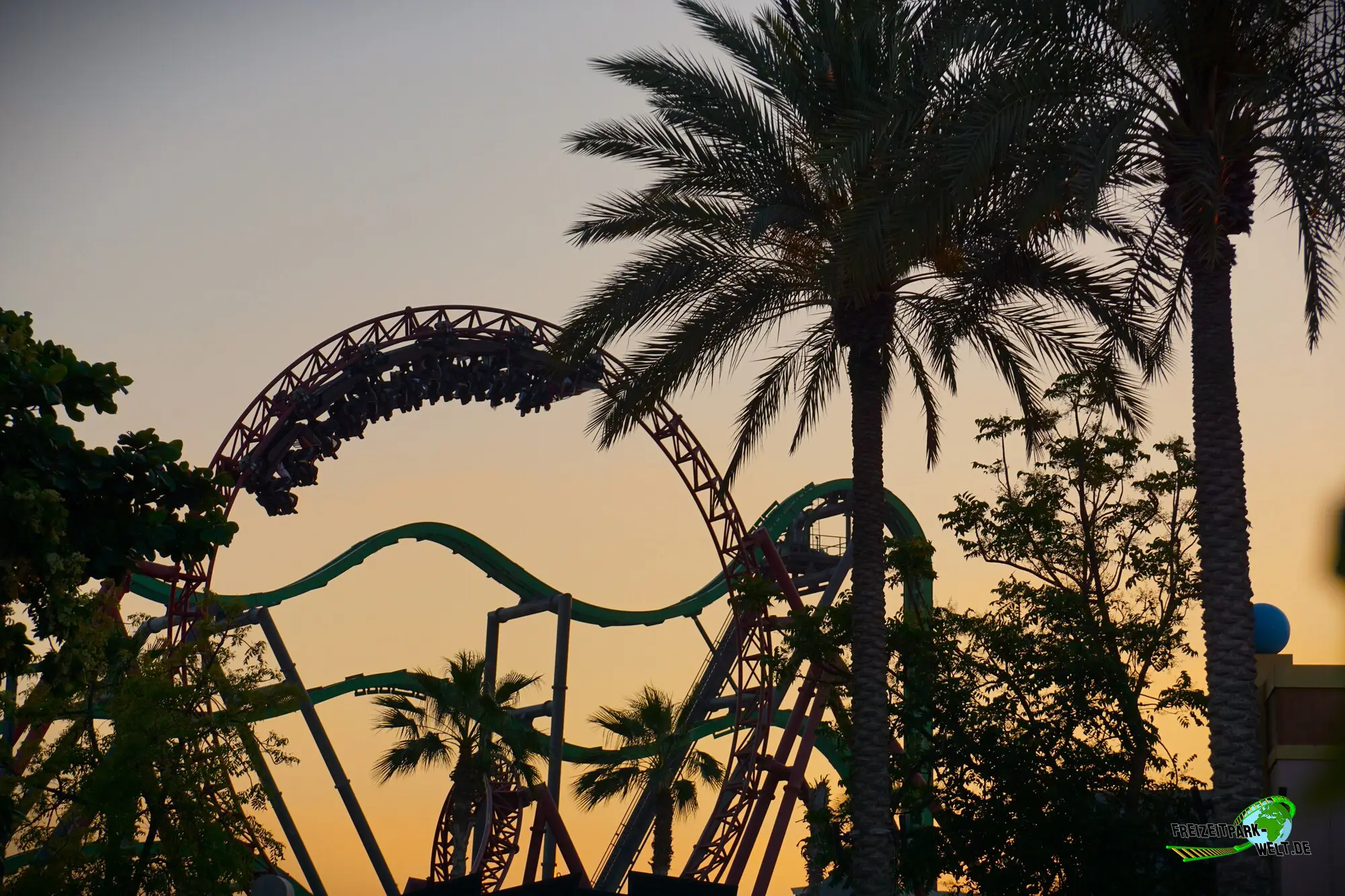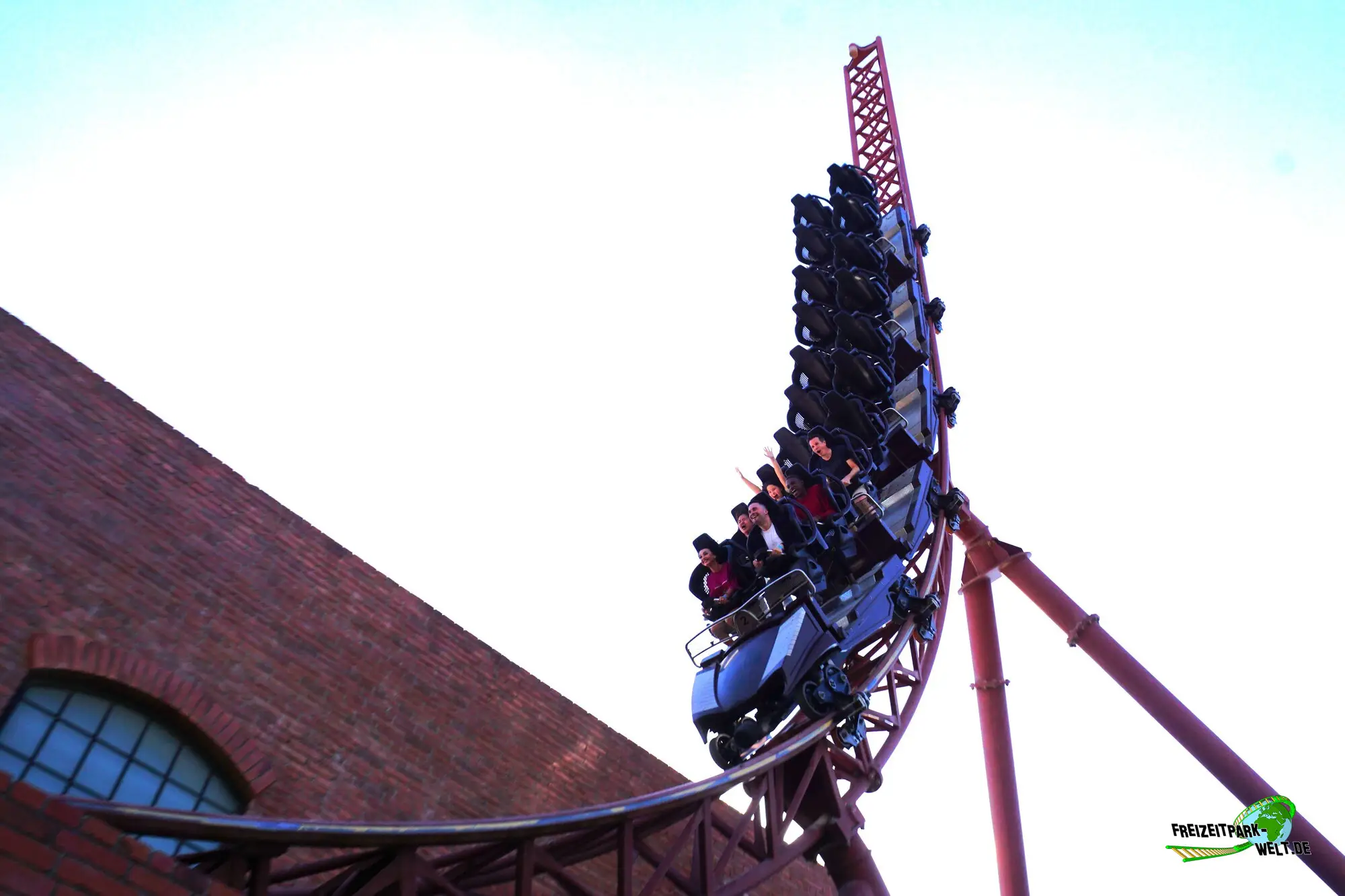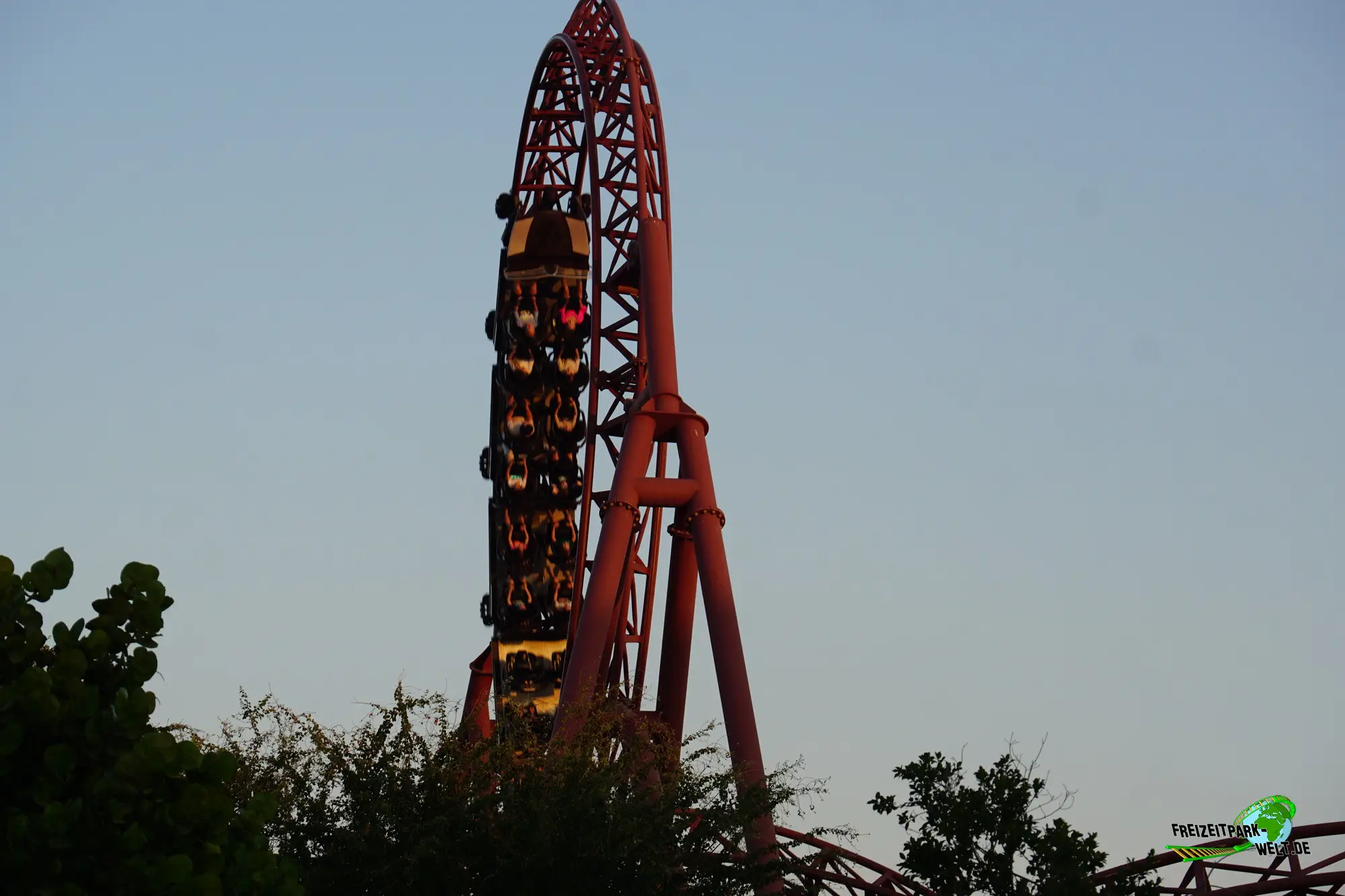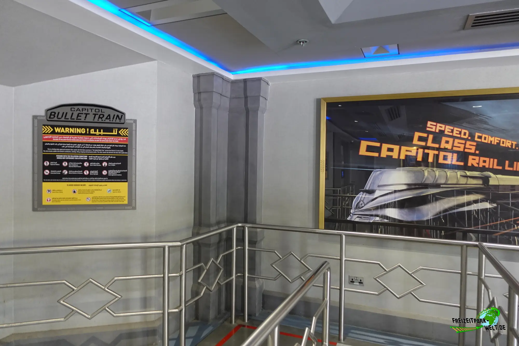 Doch zurück zum Bullet Train. Von außen ist von der Anlage bis auf den Spike und dem Vertikal Looping nicht so wirklich viel zu sehen, dafür wurde auch dieser Achterbahn ein richtig pompöser Eingang spenidert, der sich ganz im Panem-Stil zeigt und sich damit gut einfügt. Auch die Queue ist, wie im Motiongate Dubai eigentlich fast überall, deutlich zu groß für die derzeitigen Besucherströme geraten aber präsentiert sich überaus stylish. Wie so oft in diesem Filmpark würde man gerne mehr Zeit in der Queue verbringen, weil diese hier wirklich richtig gut gelungen sind. Auch die Station ist super gelungen und meistens ist bis hier hin walk on angesagt.Die Züge präsentieren sich im typischen Blue Fire-Design und kommen daher auch ohne Schulterbügel aus. Bis zu 20 Personen finden hier Platz und kommen aus der Station heraus direkt auf ein Verschiebegleis, das den Zug nach links in die Launch-Position bringt und per 3-fach Launch (leicht vorwärts, dann mit etwas mehr Dampf rückwärts und dann ab in den Looping) in den Vertikal Looping beschleunigt. Einfach gut diese MACK-Vertical Loops. Hier, wie auch im restlichen Teil der Strecke, wurde allerdings nicht mehr thematisiert, so dass wir mit Ausfahrt aus der Station irgendwie auch schon wieder Panem verlassen, was natürlich schade ist. Aus dem Loop heraus geht es dann in eine dynamisch geschwungene Rechtskurve, die wiederum in eine bodennahe Linkskurve gefolgt von einer S-Kurve umschwenkt, dann folgt auch schon die zweite und letzte Inversion mit einer Zero-G-Roll durch den Looping. Und dann steht man auch schon direkt in der Schlussbremse und fährt nach einer 180°-Kurve wieder in der Station ein.