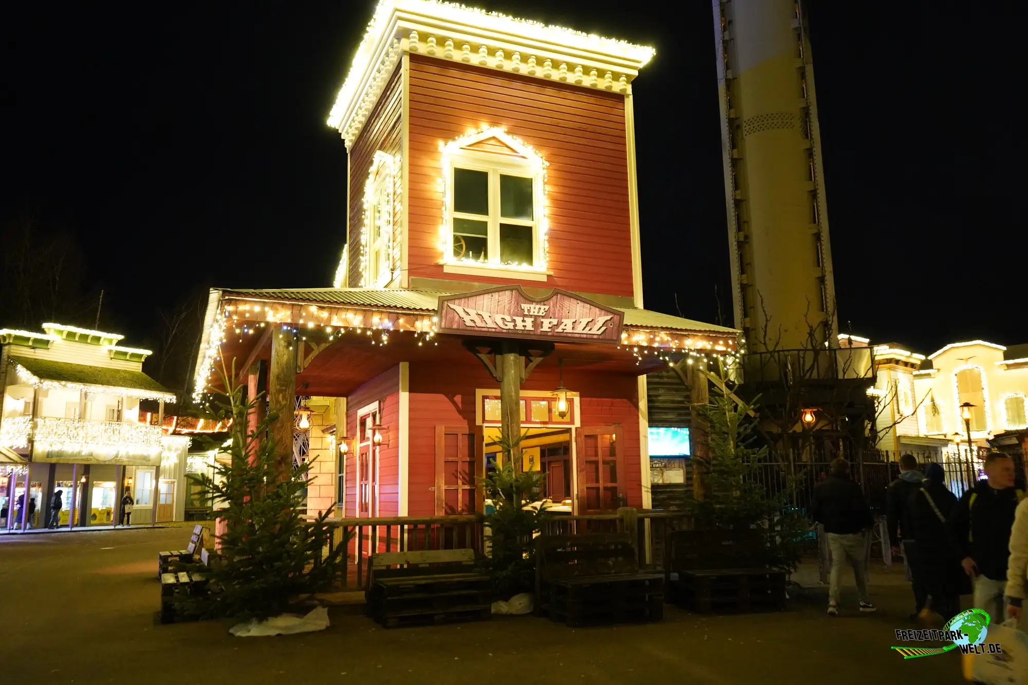 The High Fall befindet sich nicht zu Übersehen im Old-West Themenbereich. Die Eröffnung der Attraktion war am 06. April 2002. Es ist der erste Freifall Turm in ganz Europa gewesen, der sich drehen und um 15° nach vorn kippen kann. Der knapp 60m hohe Turm ist im dezenten Wellblech-weiss gehalten, die Gondel selber ist dunkelrot und ergänzt sich gut mit dem Western - Theming.