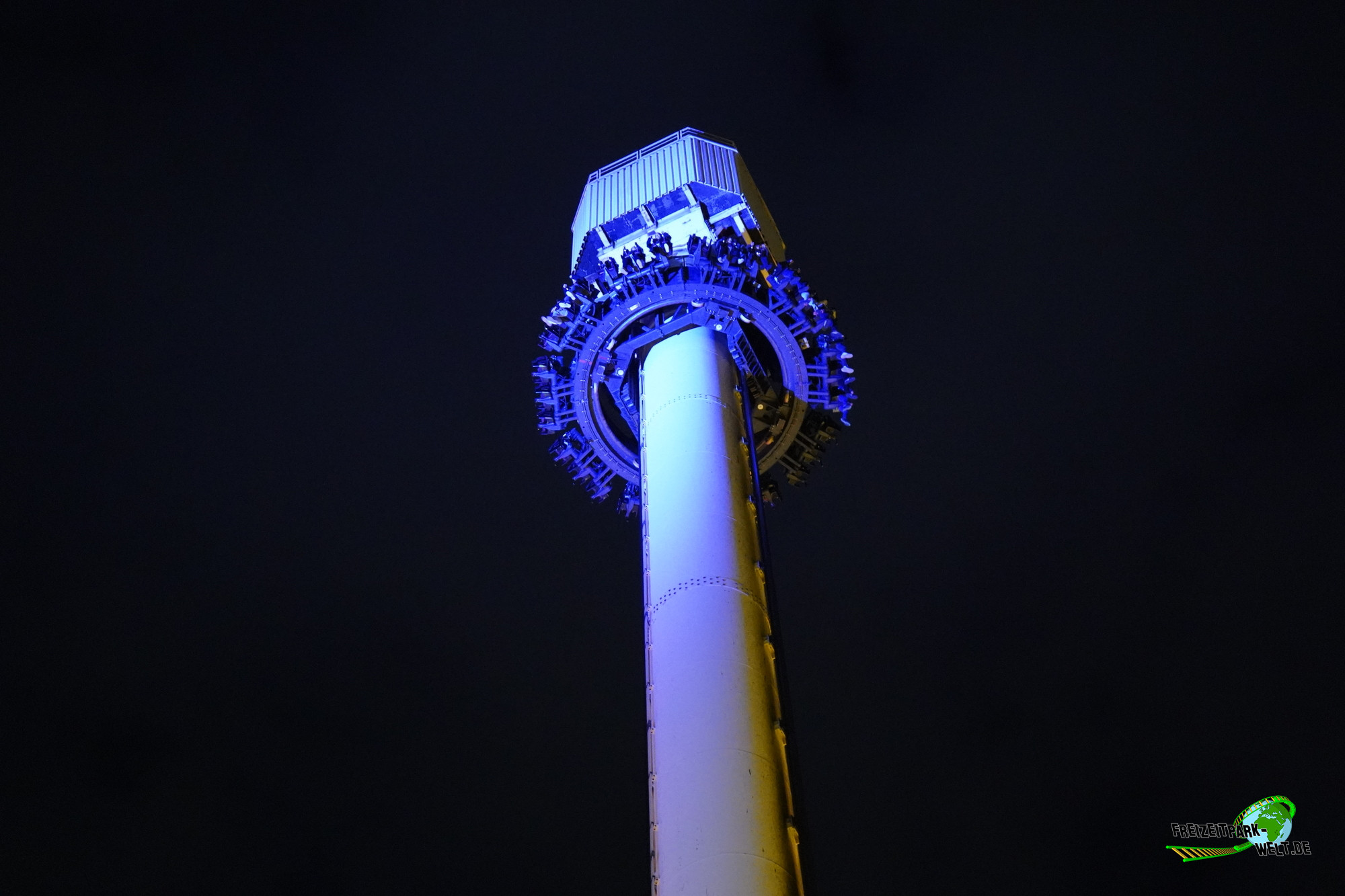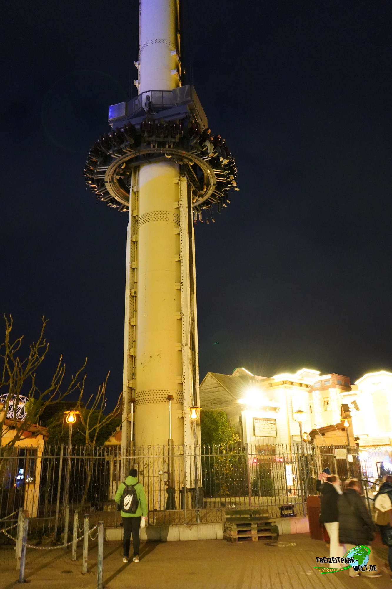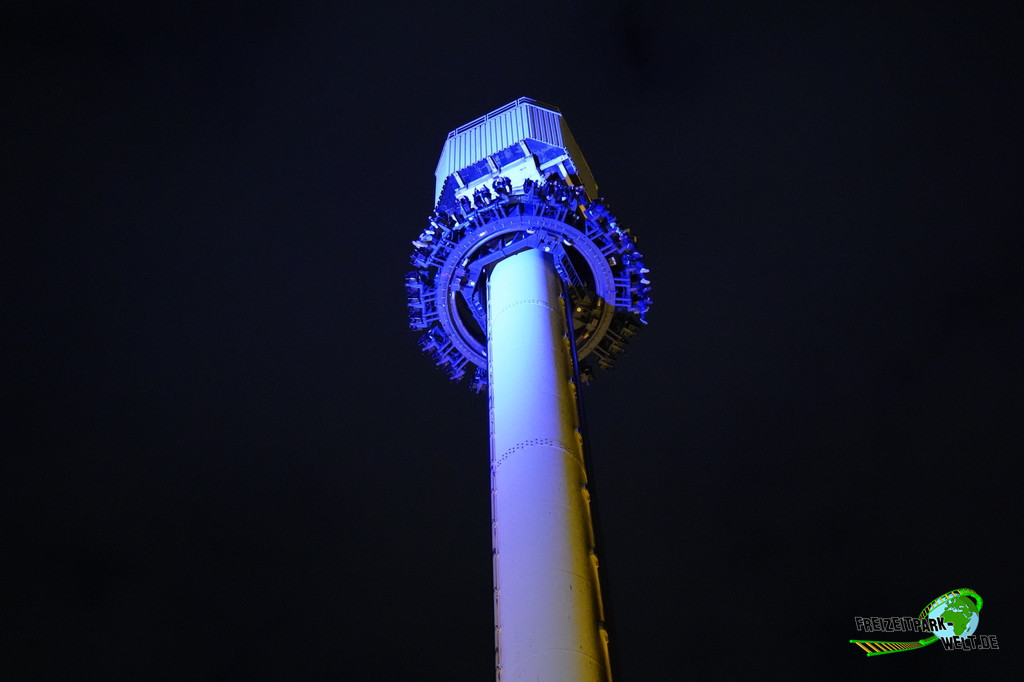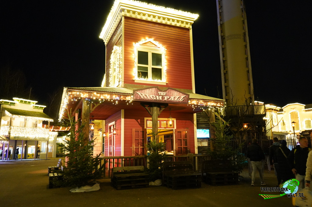 Die Queue verläuft um und durch ein paar Westernhäuser, wobei die Warteschlange relativ zügig voran geht, schließlich hat die Gondel des High Fall eine hohe Kapazität.Zwar gab es Free Fall Anlagen schon viele Jahre vor der Eröffnung des High Fall, der damals noch "The Wild Bunch" hieß, doch ist der Floorless Gyro Drop von Intamin mit Abstand einer der intensivsten und ungewöhnlichsten Anlagen. Dies liegt zum Teil auch an der spektakulären Fahrposition und den nach vorn kippenden Gondeln. Die Höhe ist dagegen mit 60m Höhe für Free Fall Anlagen in einem normalen Bereich und man sieht: Höhe ist nicht Alles! The High Fall sollte man bei einem Besuch im Movie Park Germany jedenfalls nicht verpassen.