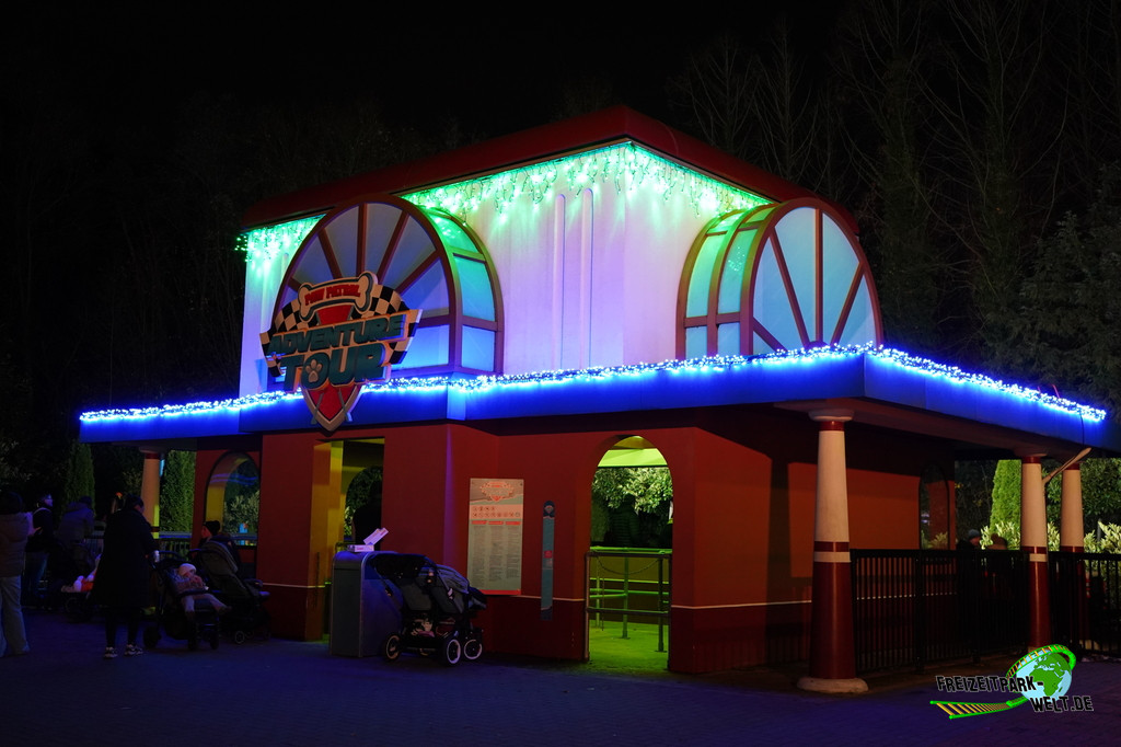 Hauptattraktion in Adventure Bay ist die Kinder-Rundfahrt "PAW Patrol Adventure Tour", die sich im hinteren Bereich von Adventure Bay befindet und bis zu vier Abenteurer auf eine Fahrt mit den beliebten Charakteren nimmt. Technisch handelt es sich um einen Convoy-Race von Zamperla. Zwar ist die Fahrstrecke relativ kurz und übersichtlich und bietet lediglich statische Theming-Elemente, dafür gibt es aber natürlich einige der Charaktere zu sehen, die Kinder aus PAW Patrol kennen. Zudem wurde das ganze Surrounding schön passend wie in einer Comic-Stadt, eben Adventure Bay, angelegt. Und wer will nicht mal mit den beliebten Hunden eine Runde drehen? Und das allein dürfte eben auch Grund genug sein, warum es auf dieser Fahrt anfangs mal zu längeren Wartezeiten kommen könnte, zumal es auch nur vier Wagen auf der Strecke gibt, die relativ gemächlich absolviert wird.