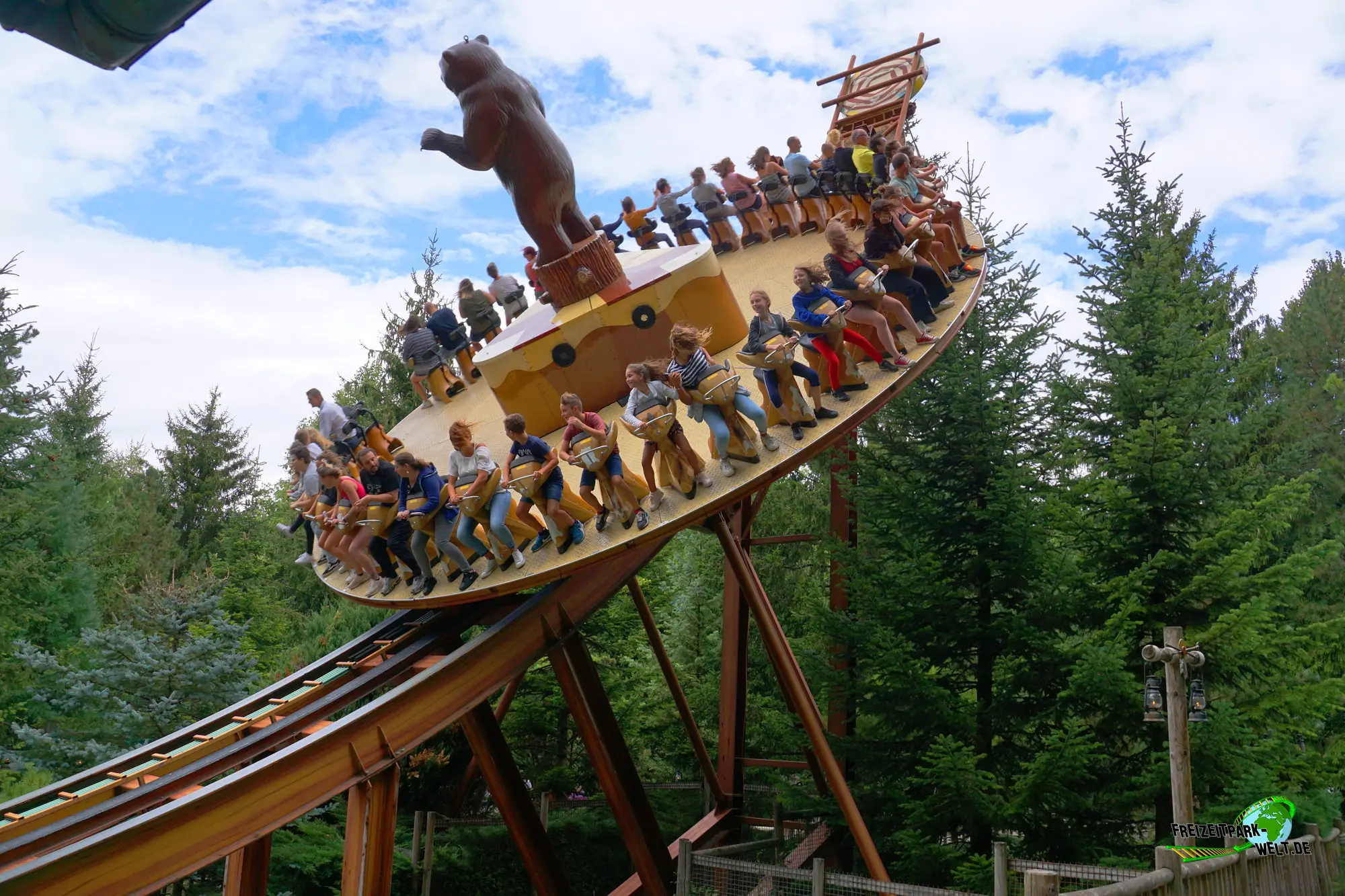 Der Zugang zur Attraktion erfolgt dann rückwärtig und die Fahrt bietet gewohnten Familienspaß. Positiv ist die sehr ruhige Fahrt, im Vergleich mit dem Crazy Surfer aus dem Movie Park Germany kommt Grizzli hier deutlich besser weg. Die Anlage ist keinesfalls eine Kotzschleuder, bietet aber trotzdem eine sehr kraftvolle Fahrt, deren Drehung sich in einem magenfreundlichem Bereich hält. Dafür fährt die kreisrunde Gondel umso schneller über die Schienen, denn man braust mit bis zu 70km/h durch die Senken. Eine Fahrt, die ebenso bei Jugendlichen als auch bei Erwachsenen für Begeisterung sorgt. Auch thematisch wurden hier gekonnt Akzente gesetzt. Der ganze Bereich ist mit Tannen versehen und in der Mitte des Fahrgastträgers thront ein riesiger, namensgebender Grizzli.Somit ist Grizzli eine tolle Erweiterung für das immer weiter wachsene Nigloland. Allerdings sollte über eine Verbindung zur Dunkelachterbahn Spatialé Experience nachgedacht werden.