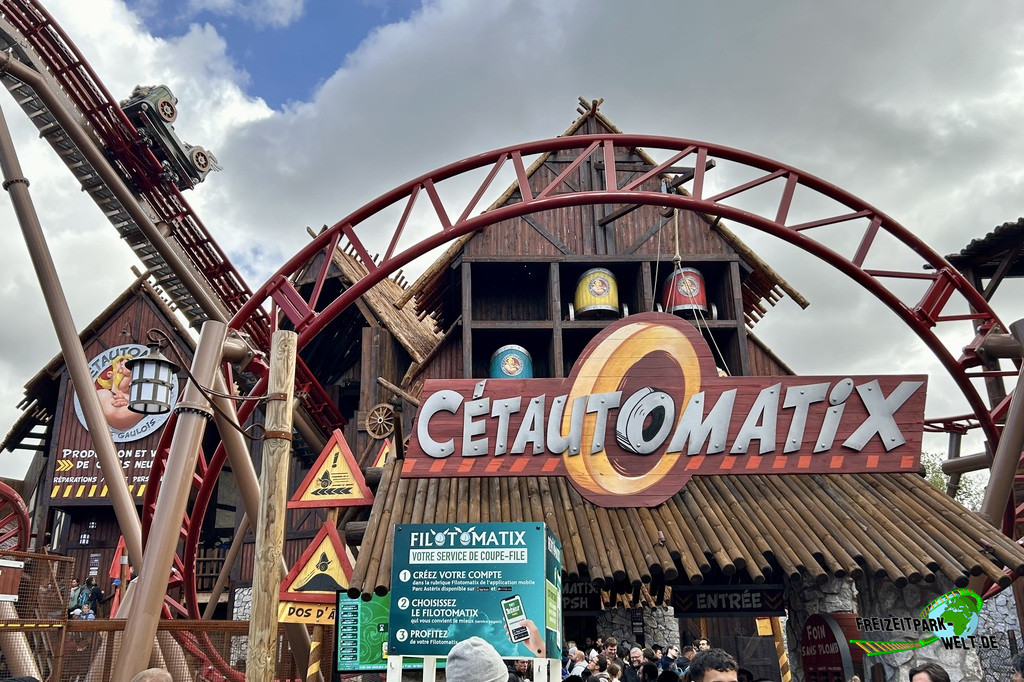 Thematisch gehört die Achterbahn in den Teil des Parks, der sich zwischen dem Eingang bis hin zur Wasserbahn erstreckt. Thema ist hier Gallien bzw. die Wikinger. Andererseits liegt der Eingang aber auch direkt am Anfang des ägyptischen Bereichs, der sich nun auch nochmal vergrößert hat und um das Restaurant "Les Fastes du Nil" erweitert wurde. Zudem ist ein neuer überdachter Durchgang zwischen der Kaffeetassenfahrt Les Chaudrons und dem großen Platz entstanden. Dieser Platz wird dann wohl auch schon bald deutlich anders aussehen, denn der Bereich "À Travers le Temps" wird in den nächsten Jahren zu Londinium umgebaut und dann mit einer neuen Indoor-Achterbahn und einem Interactive Dark Ride aufwarten. Doch zurück zur 2025er Neuheit Cétautomatix. Der Eingang ist relativ unspektakulär, die relativ offene Station zeichnet sich durch allerlei Wappen der Testwagen aus, die man bald zur Probe fahren wird. Cétautomatix ist nämlich die Teststrecke eines automatisch fahrenden Autos. Und so gibt es dann auch neben der Schiene allerlei Verkehrszeichen zu entdecken, die natürlich auch den typischen Asterix-Humor haben.Die Fahrt