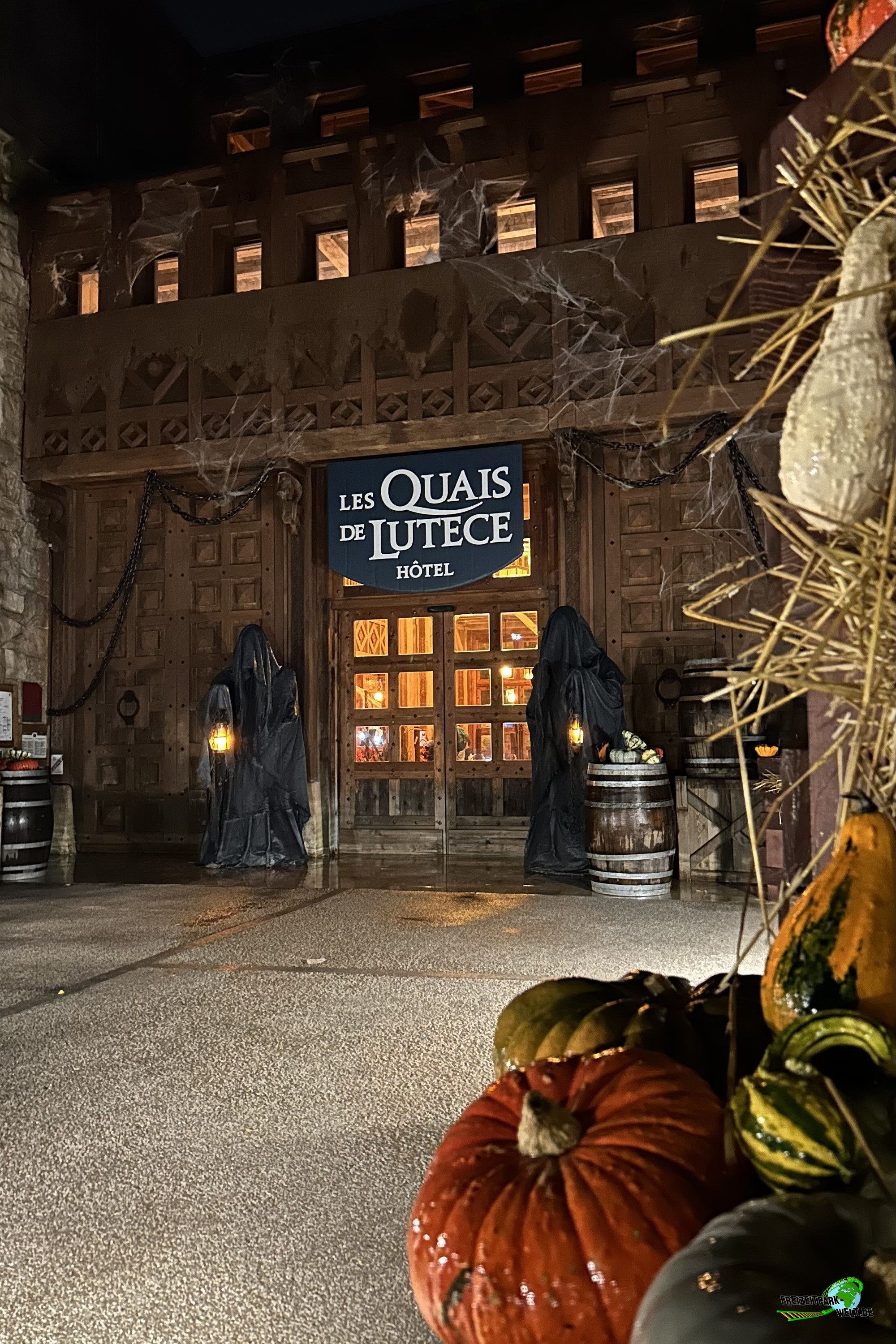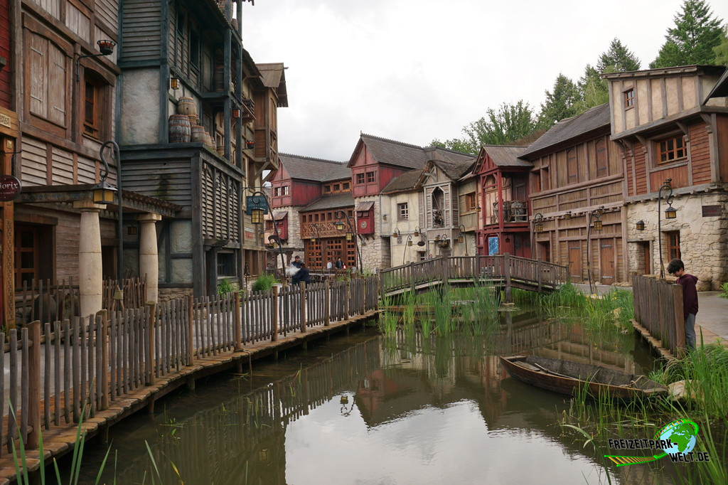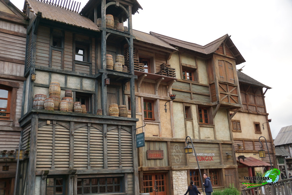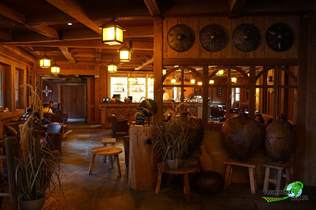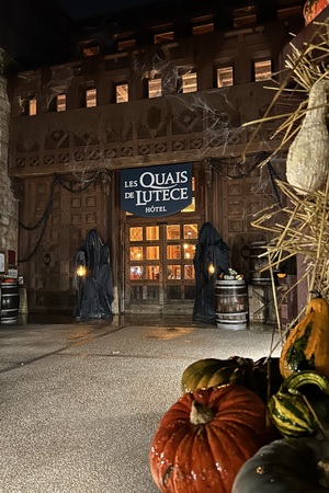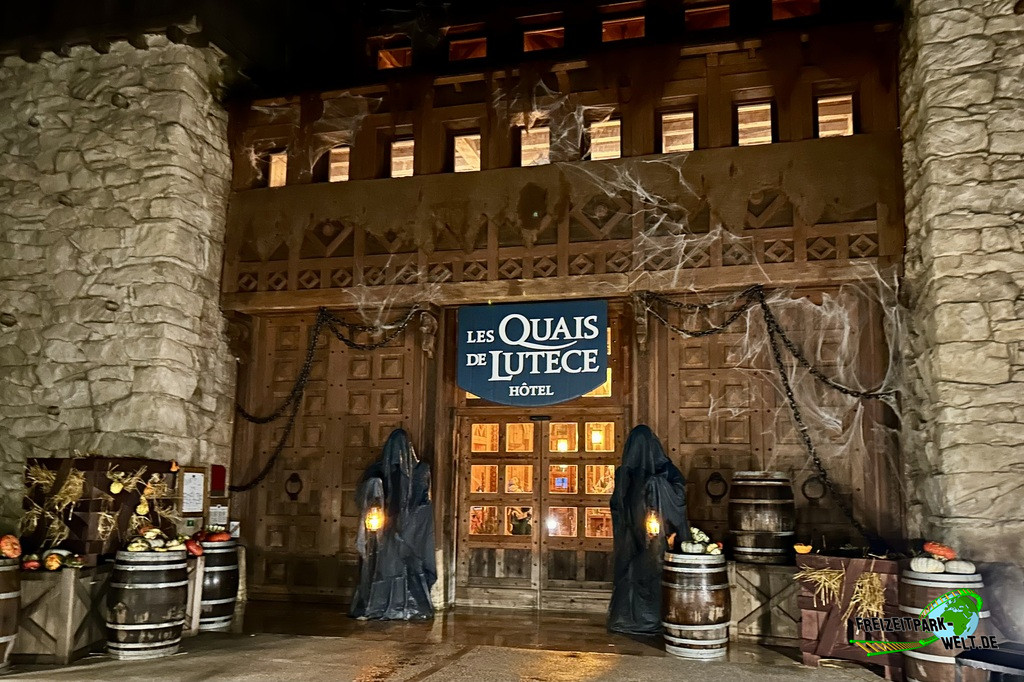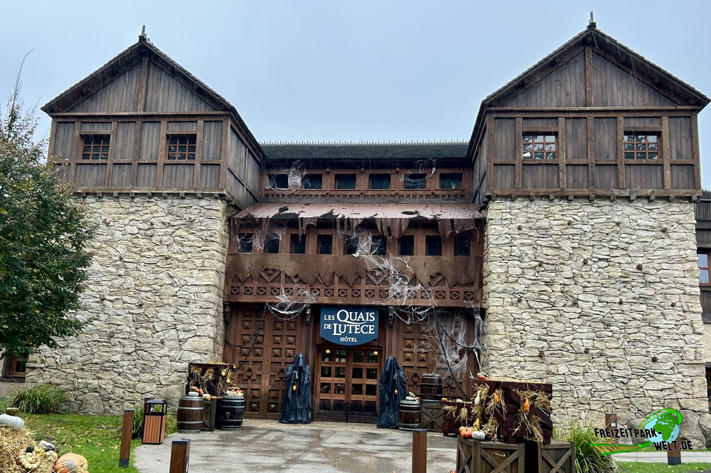 Das 4-Sterne Hotel "Les Quais de Lutèce" wurde 2020 im Parc Astérix eröffnet und ist von der Größe her vergleichbar mit den bereits etwas älteren 3-Sterne Hotels "La Cité Suspendue" und "Les Trois Hiboux" (alle ca. 150 Zimmer). Thematisch geht es hier in das Paris vor 2000 Jahren, wo man die ersten Siedlungen entlang der Seine errichtet hat. Und genau das bildet das Hotel mit dem kleinen Fluß im Inneren und den Häuserzeilen drumherum ab. Von innen ist das wirklich sehr schön anzusehen, zumal es hier auch das ein oder andere Asterix-Detail zu entdecken gibt. Von außen ist hingegen nur der Eingang so wirklich thematisiert, und dieser erinnert noch am ehesten an eine Burg oder ein Stadttor aus dem frühen Paris.